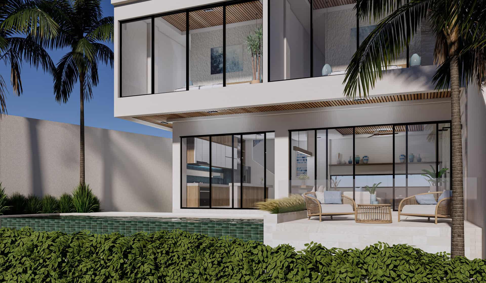 The outdoor area includes a pristine pool with lounge chairs, perfect for soaking up the sun.