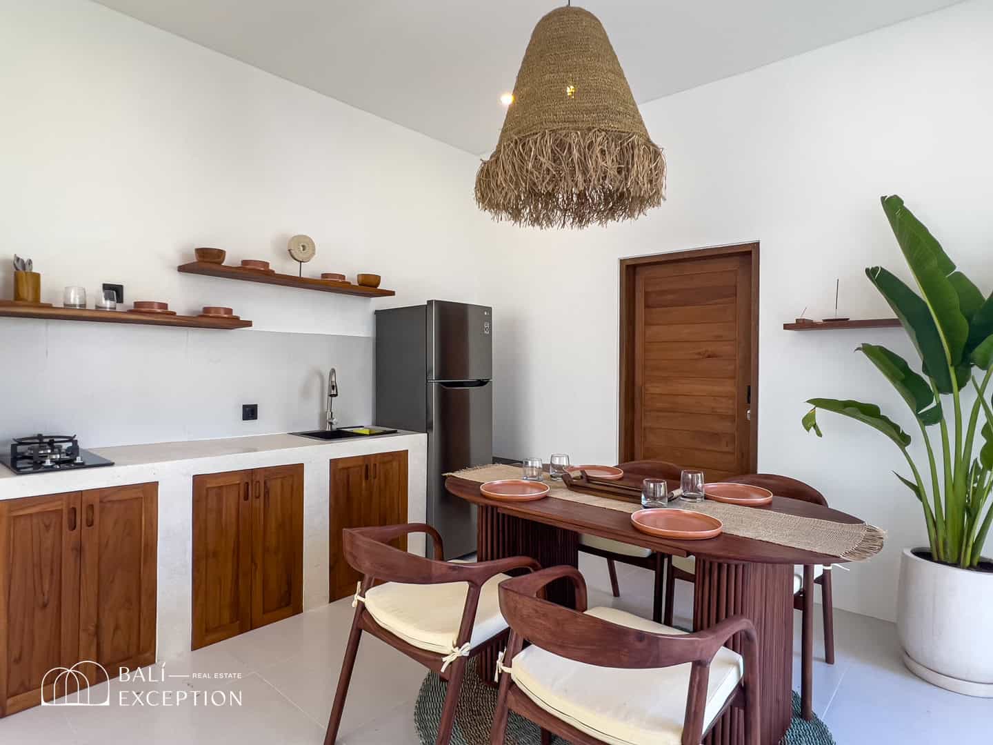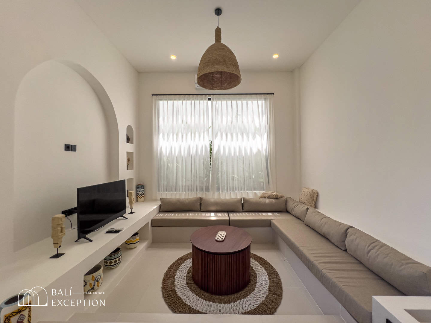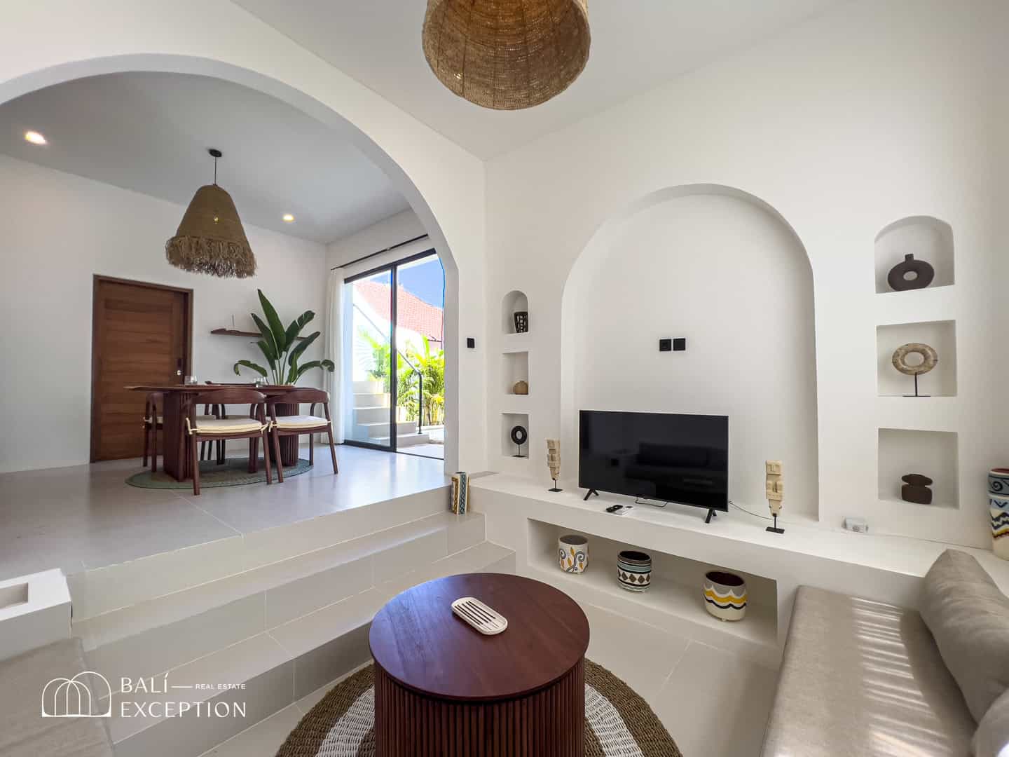 As you enter, you’re greeted by a sunken living room. The high-ceiling windows flood the home with natural light, creating a fresh, airy feel throughout the space. The villa’s two spacious bedrooms, each with its own bathroom. Fully furnished, including a modern, fully equipped kitchen, perfect for preparing meals with locally sourced ingredients.