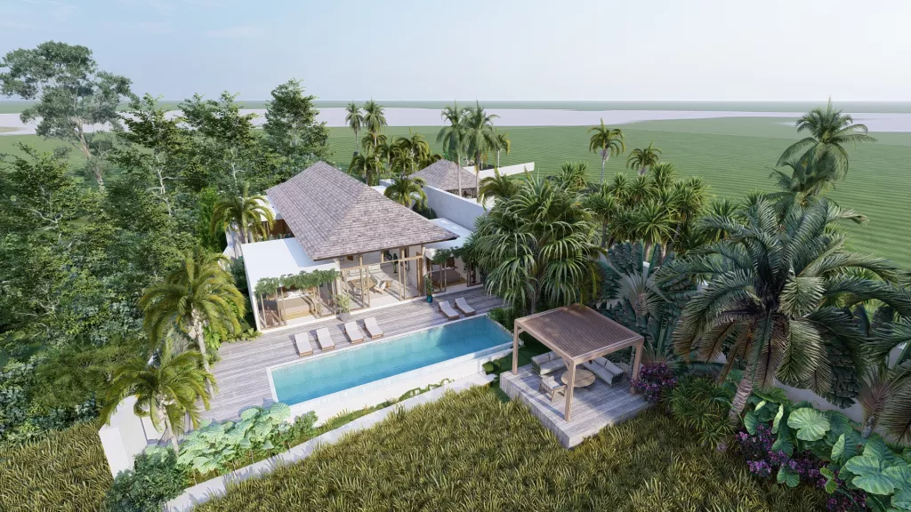 Set amidst an expansive 1300 sqm of meticulously landscaped land, this semi-furnished jungle villa gracefully borders a private rice field, creating a perfect sanctuary for tropical living.