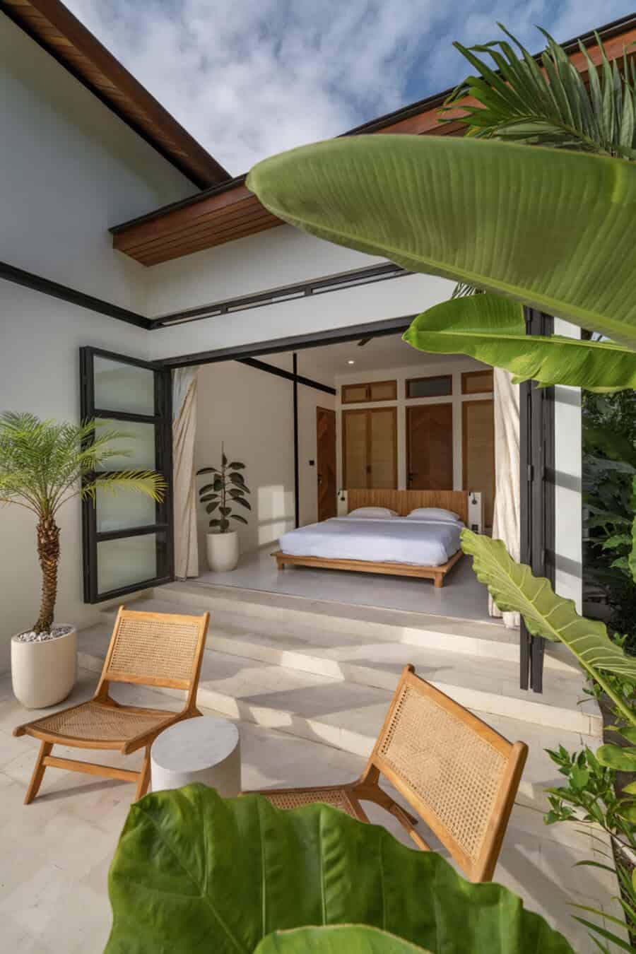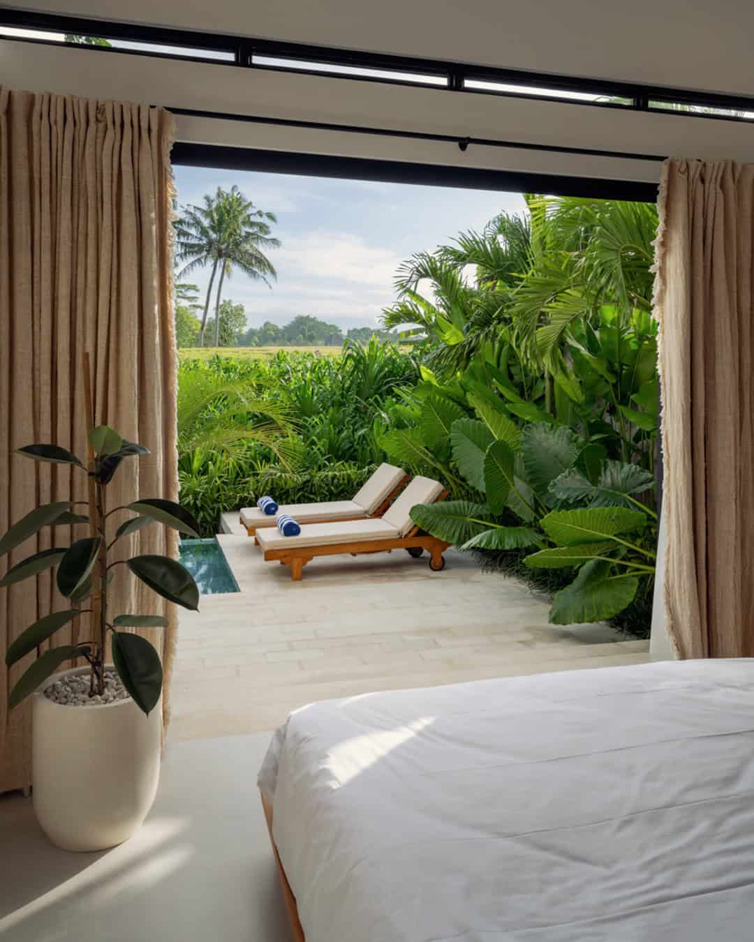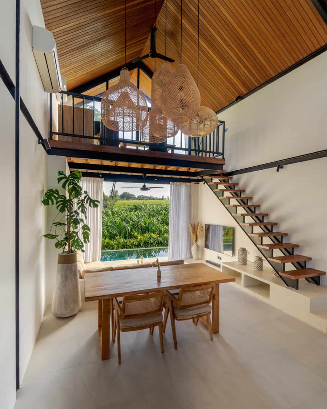 Nestled away from the hustle and bustle of Canggu and secluded in the nature, this tropical Loft Villa offers the perfect blend of privacy and convenience. Designed to embody “Modern Bali,” its sleek, minimalist design and open, airy spaces create a serene retreat. Located in the charming village of Cepaka, this newly built villa captures the essence of Bali’s natural beauty. Located just minutes from the vibrant Pererenan Beach and Canggu—an emerging hotspot for surfers, families, and digital nomads. Cepaka is on the rise, with new local spots like its first restaurant/café enhancing the village’s allure. The villa promises tranquility and stunning views of lush Pandan fields. The two-level villa features elegant furnishings and a stunning infinity pool (7 m x 3.50 m) that gazes out over the green landscape. It includes a stylish office with blinds and comfortable chairs for remote work.