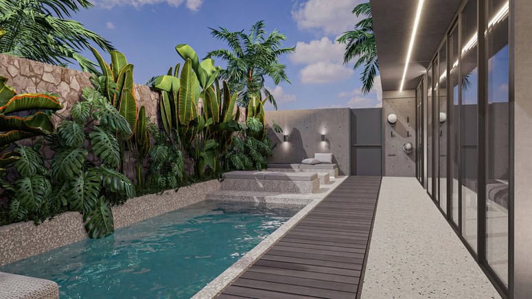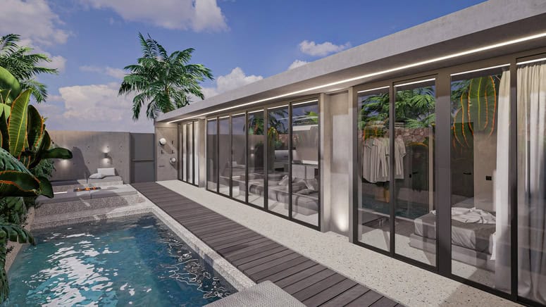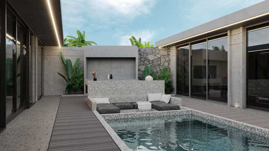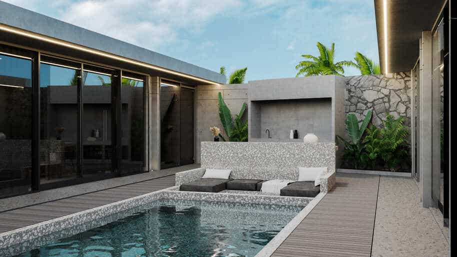 Outside, the villa continues to impress with a sparkling pool that beckons you to take a dip on warm tropical days. Adjacent to the pool, the lounge area is the perfect spot to relax, whether you’re soaking up the sun during the day or enjoying a quiet evening under the stars.