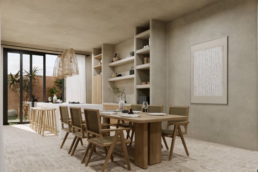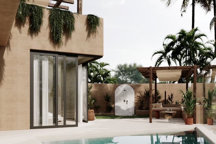 This villa offers you panoramic views of the rice fields and sprawling open space, swimming pool, and lush greenery. This villa is a stunning display of modern bohemian style and fully furnished. Spread across a spacious 238 sqm indoors, nestled within a lush 280-300 sqm landscape, it features 3 bedrooms, each with its own private bathroom, semi-open living room, kitchen, and dining room. The glass doors provide options for open and enclosed spaces.