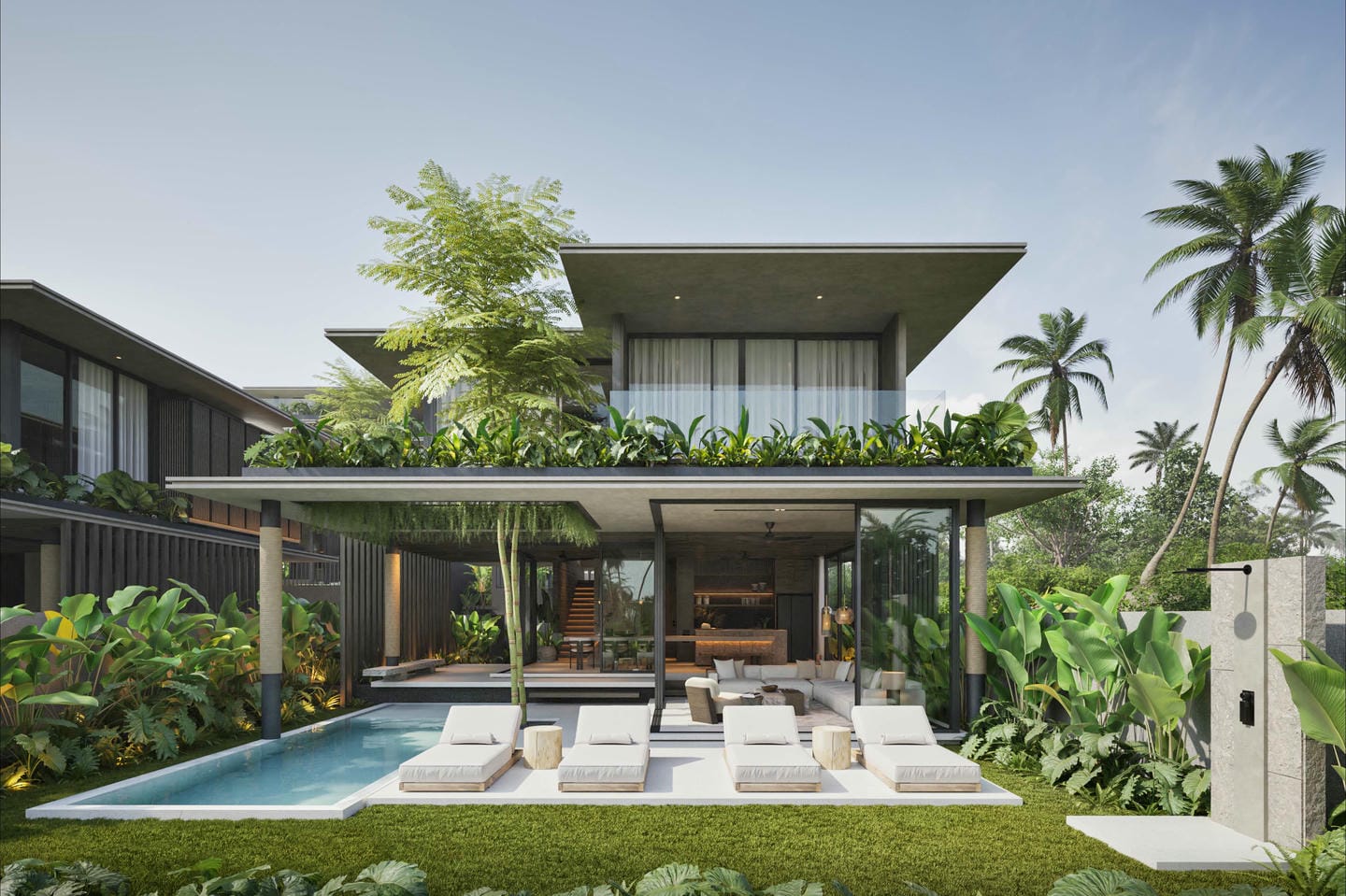 Outdoors, the estate is designed as a lush tropical oasis, featuring a spacious swimming pool, natural stone decking, warm wooden terraces, and a sunken jacuzzi for added relaxation. Mature tropical landscaping, palm trees, and traditional pavilion-style structures enhance the serene, resort-like atmosphere—perfect for lounging, entertaining, or unwinding in total privacy.