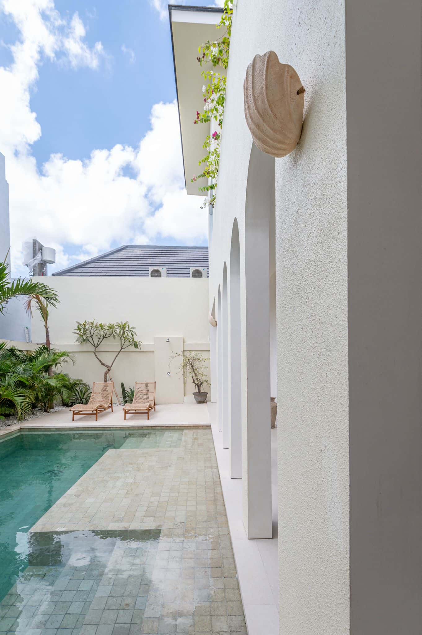 Outside, a refreshing pool with lounge chairs invites relaxation amidst tropical surroundings. Practical amenities such as parking facilities add convenience for residents and guests alike.