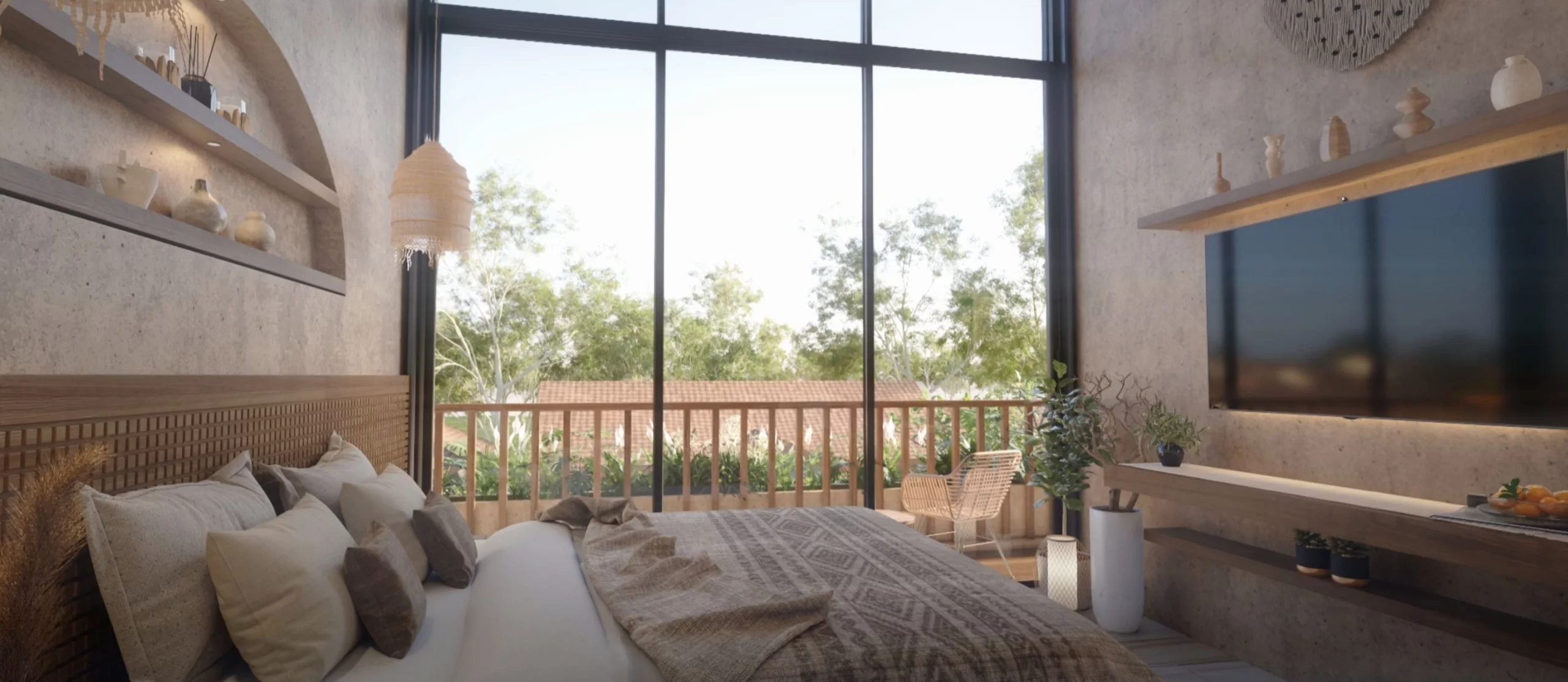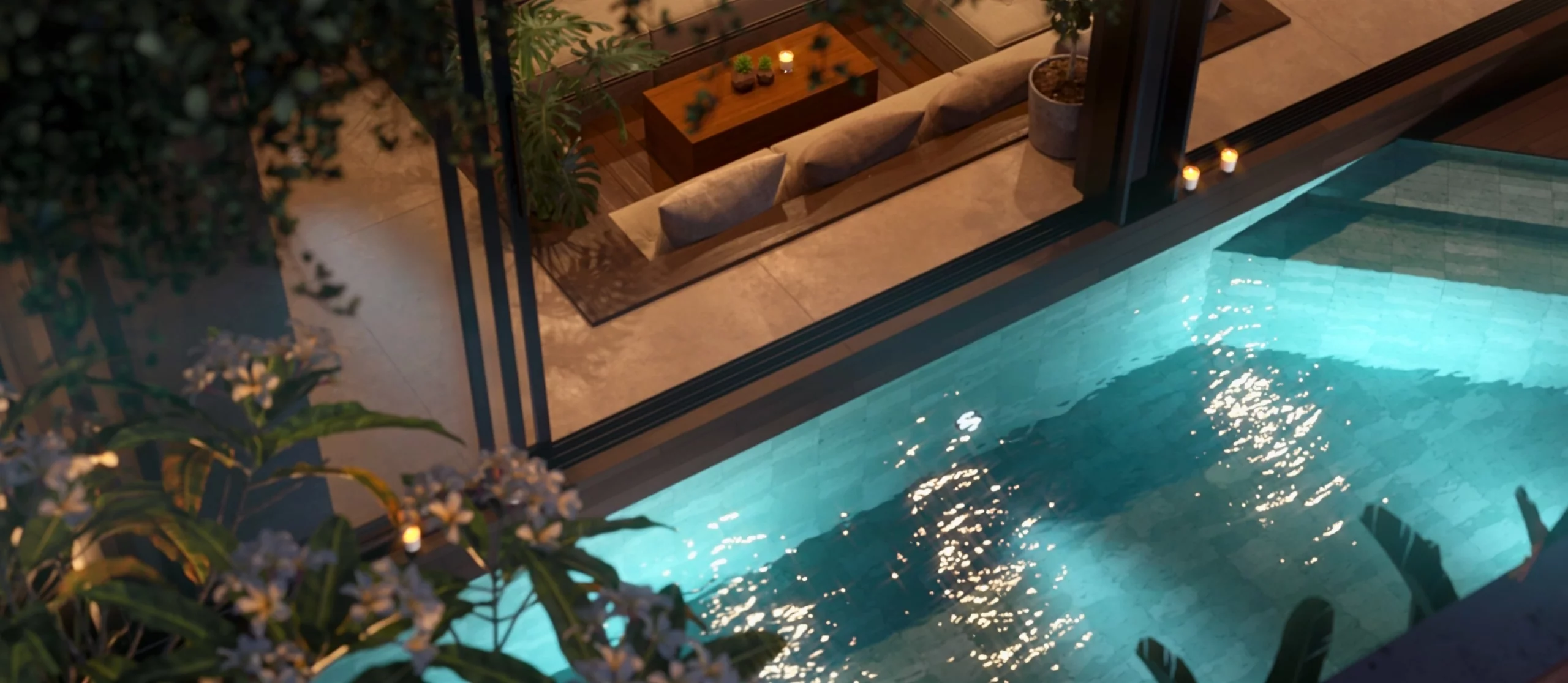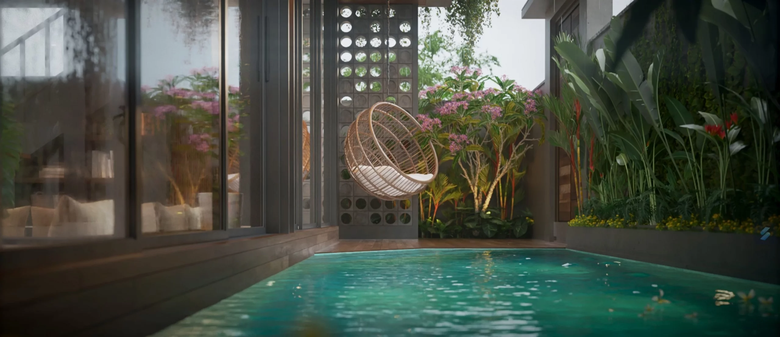 The villa offers 2 bedrooms, each with its own en-suite bathroom and balcony. High ceilings and thoughtful design elements create an airy and relaxing atmosphere. Spanning across two levels, this 104-square-meter villa features a refreshing swimming pool. Additionally, dedicated parking ensures hassle-free convenience.