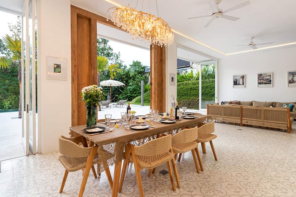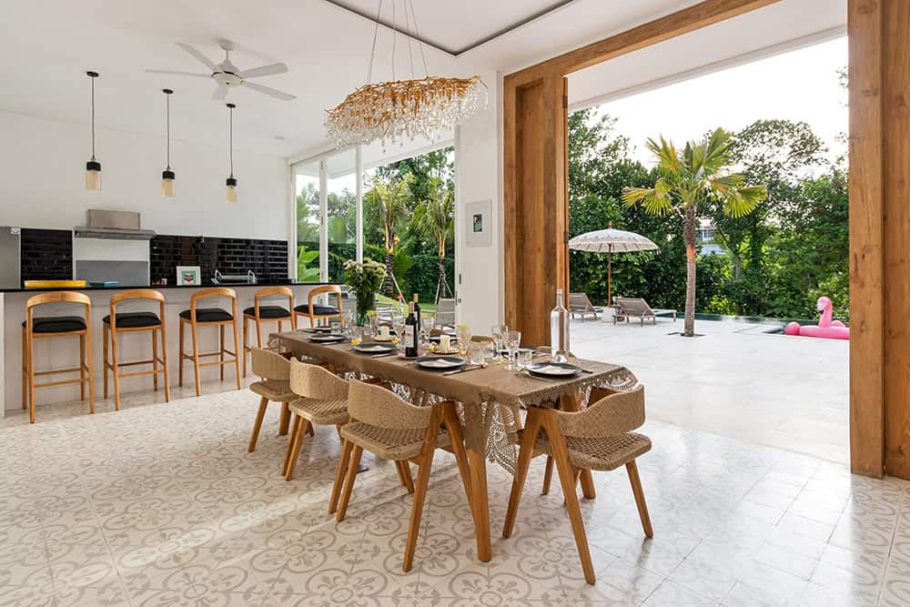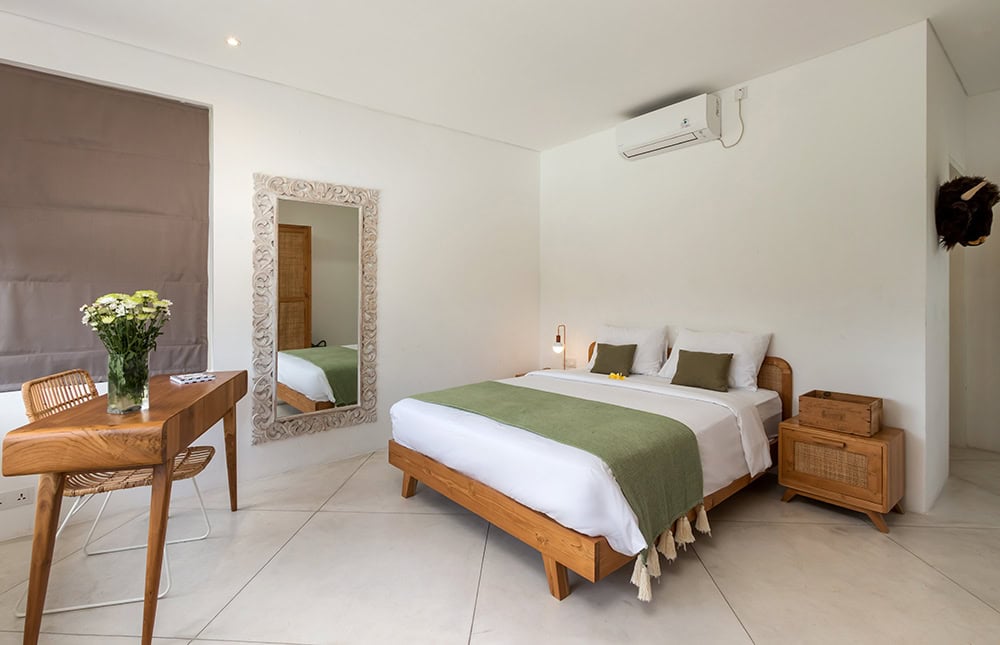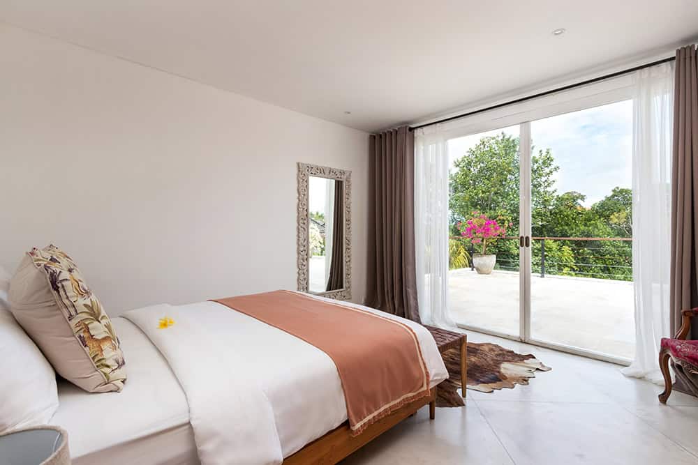 The villa boasts a spacious balcony that doubles as a second terrace, perfect for enjoying outdoor dining or lounging while taking in the expansive jungle views. The beautifully landscaped garden includes a grass lawn and a terrace adorned with palm trees, enhancing the tropical ambiance. The open-plan design allows for a seamless flow between the indoor and outdoor spaces, making it ideal for entertaining or simply enjoying Bali’s tropical climate.