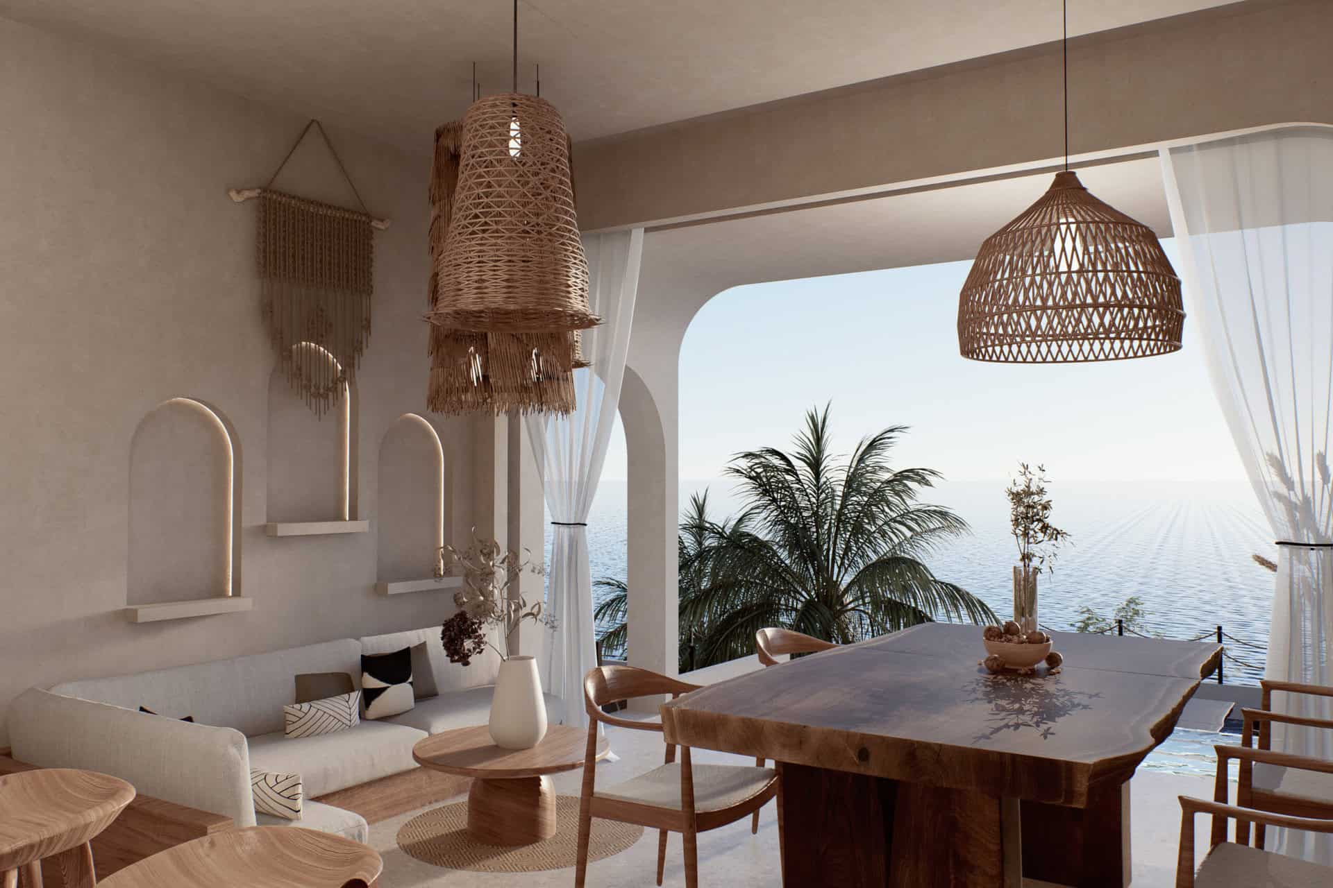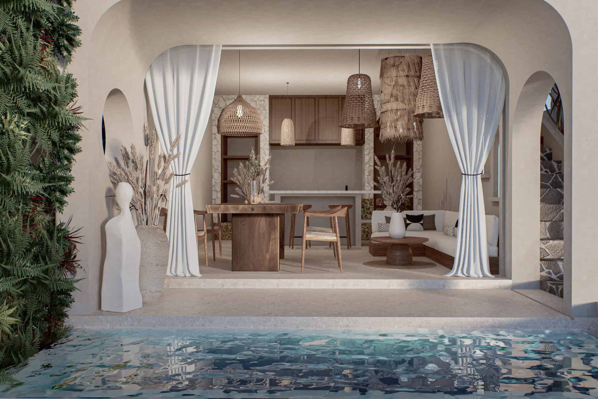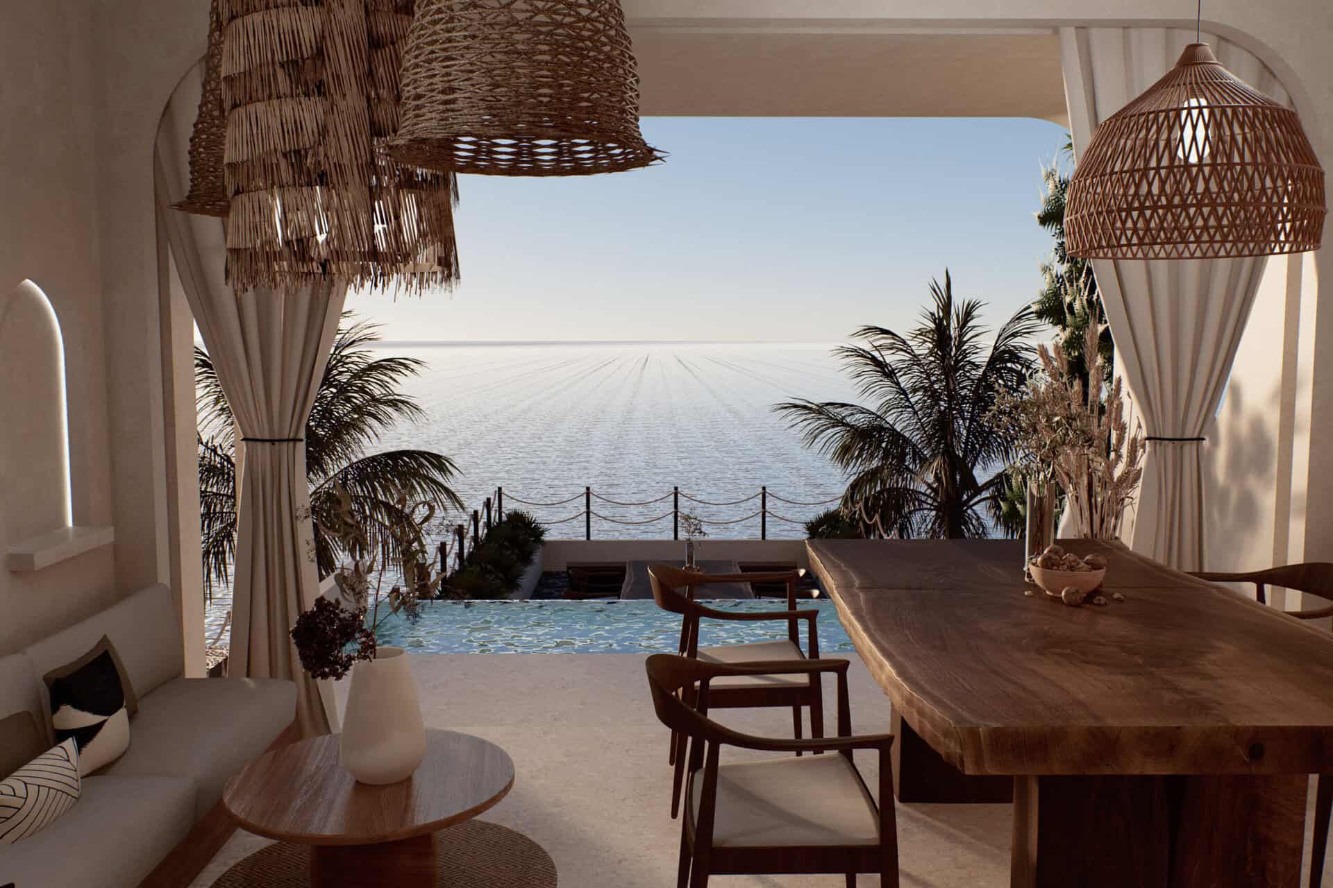 This spectacular ocean-view villa features a contemporary eco-conscious tropical design with elegant wood accents and beige palette, spanning over 185 square meters of land, with a generous 246 square meter build. It includes 2 bedrooms, 2 bathrooms, a cozy living area, a modern kitchen, and a stylish dining space. Every aspect of this villa is crafted to ensure guests from waking up to stunning ocean vistas to sipping coffee, enjoying a refreshing swim, or lounging by a sunken living room, all with the breathtaking turquoise blue ocean as a constant backdrop.