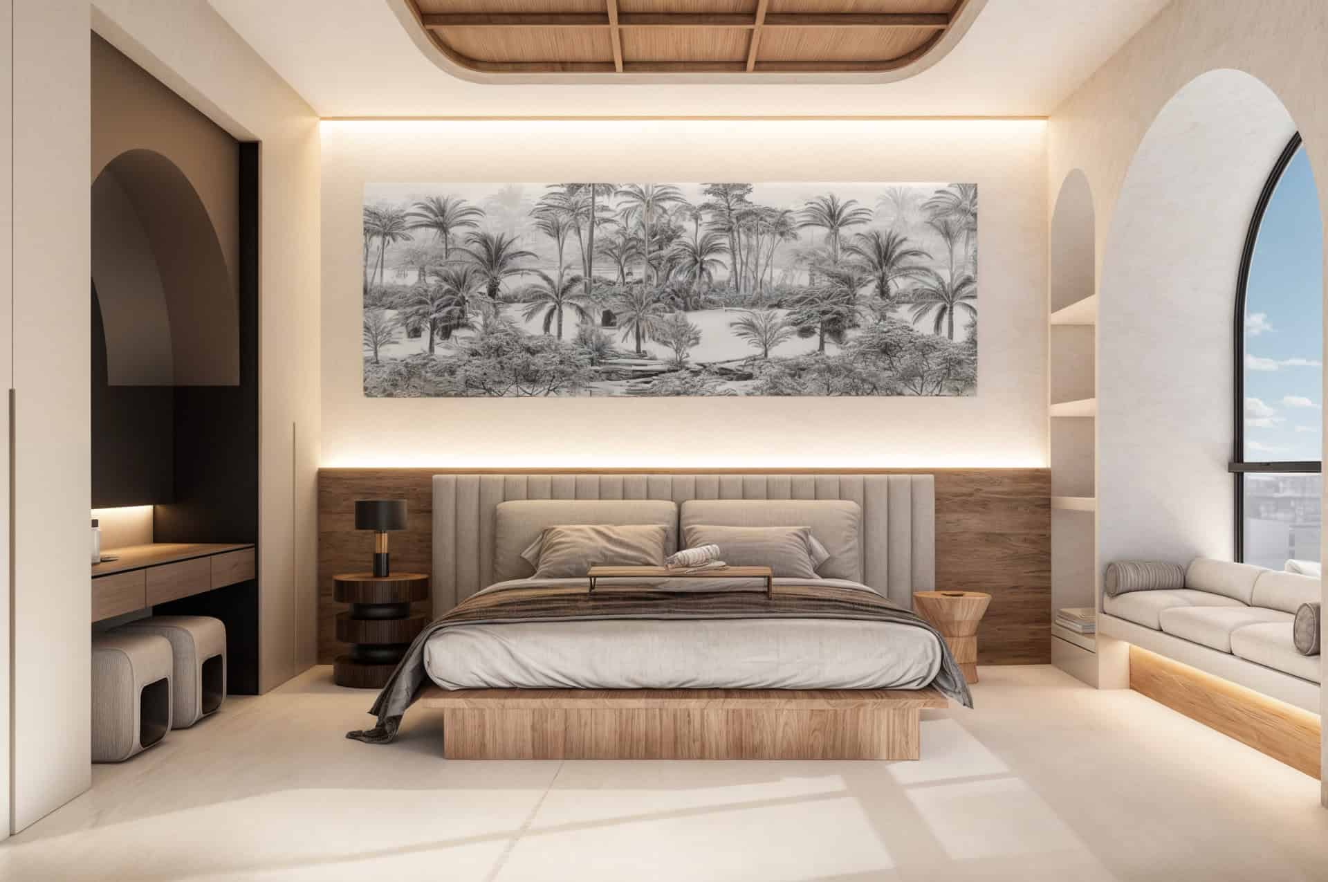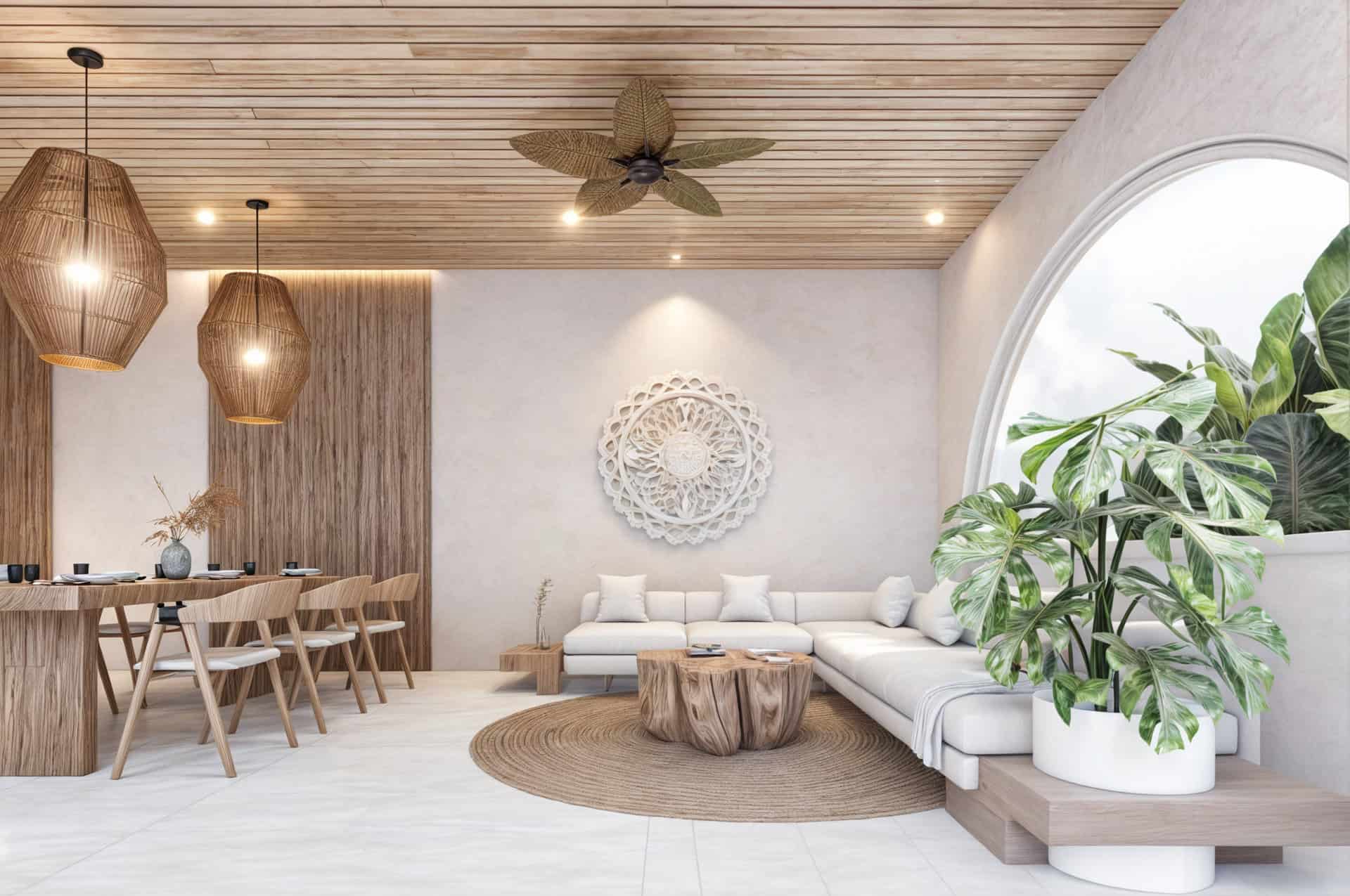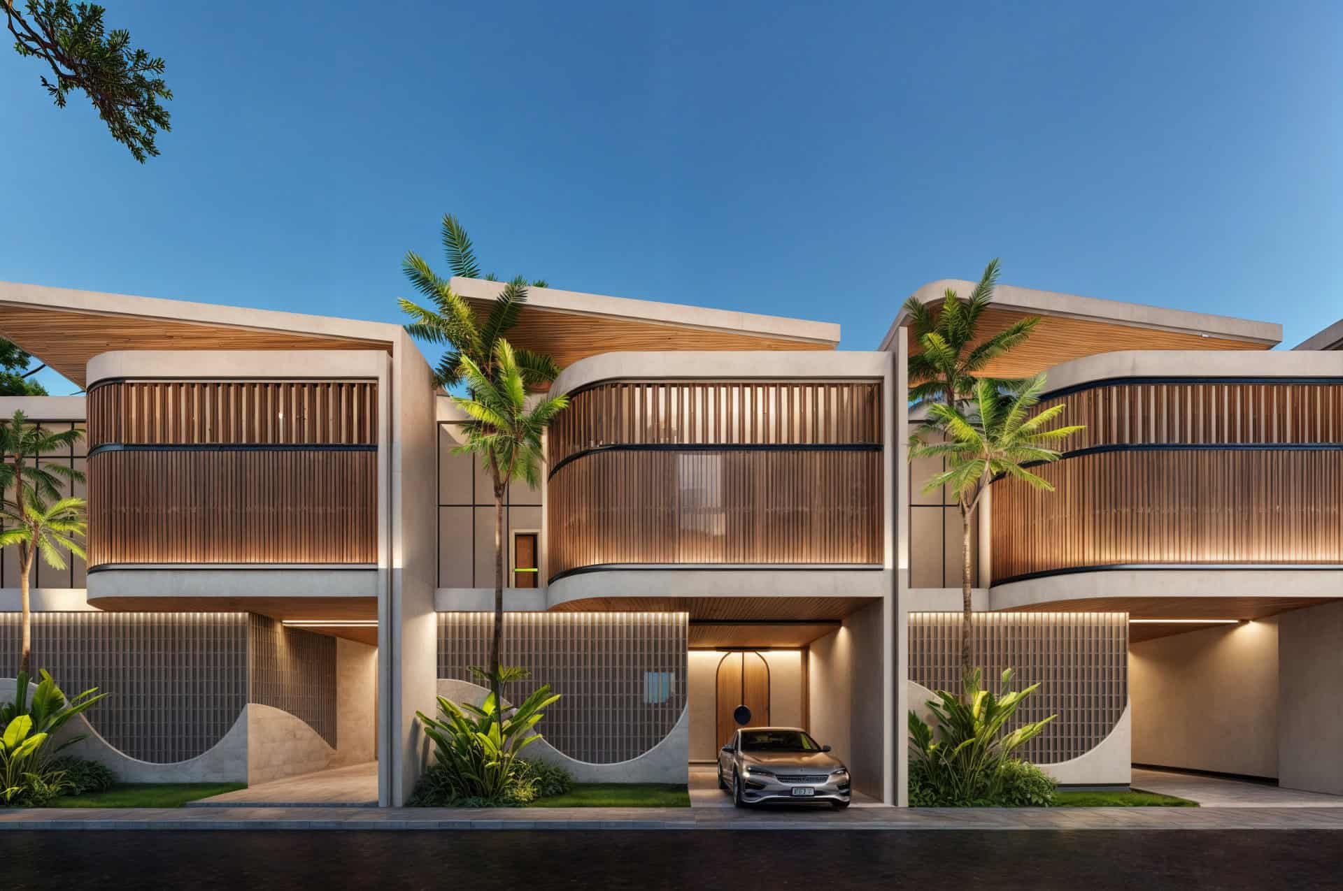 This two-storey villa features three bedrooms, each with its own ensuite bathroom, and includes a convenient powder room for guests. The interior is beautifully crafted with elegant light wooden ceilings and intricate details that exude warmth and sophistication. The second floor boasts access to a private balcony, ideal for enjoying serene views of the surrounding area and creating a peaceful retreat within the home.