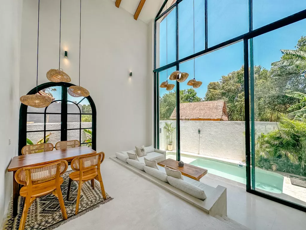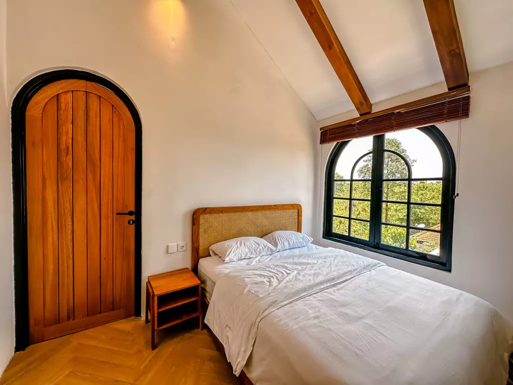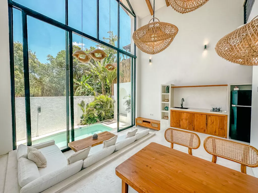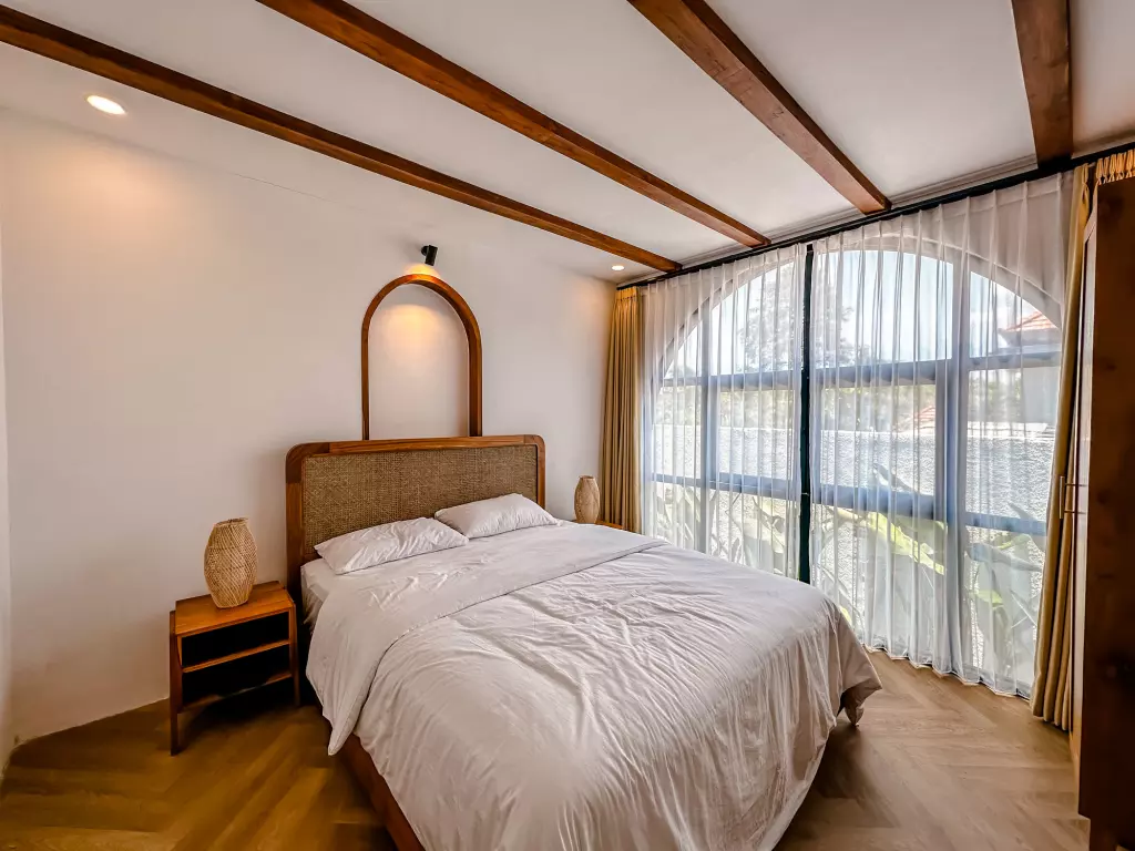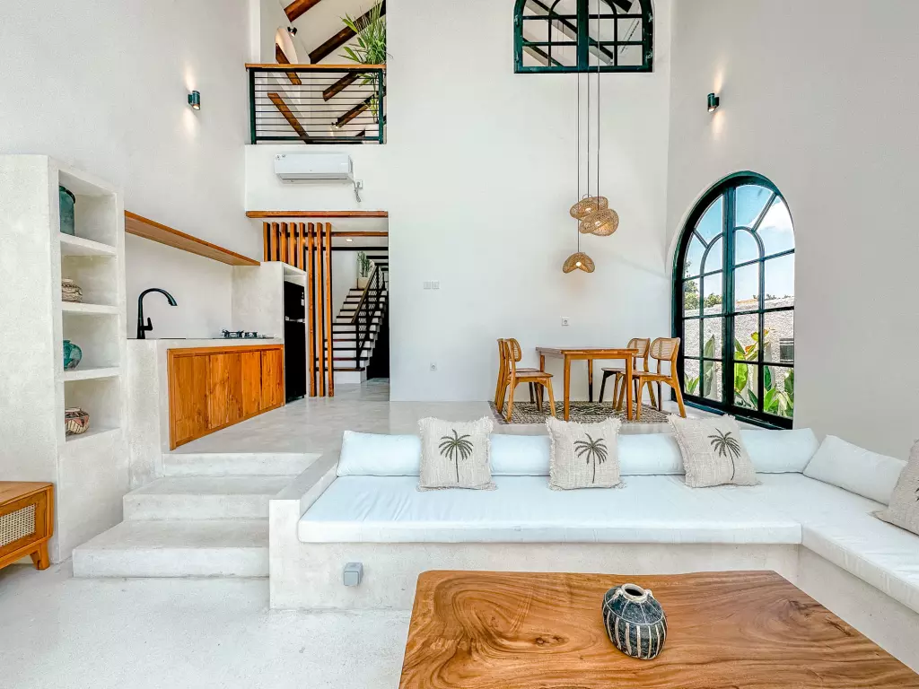 The villa features a modern design with a mezzanine level accessible through, comprising a stunning living room, kitchen, and dining area that provide scenic outdoor views. Additionally, there are two beautiful bedrooms and two bathrooms.