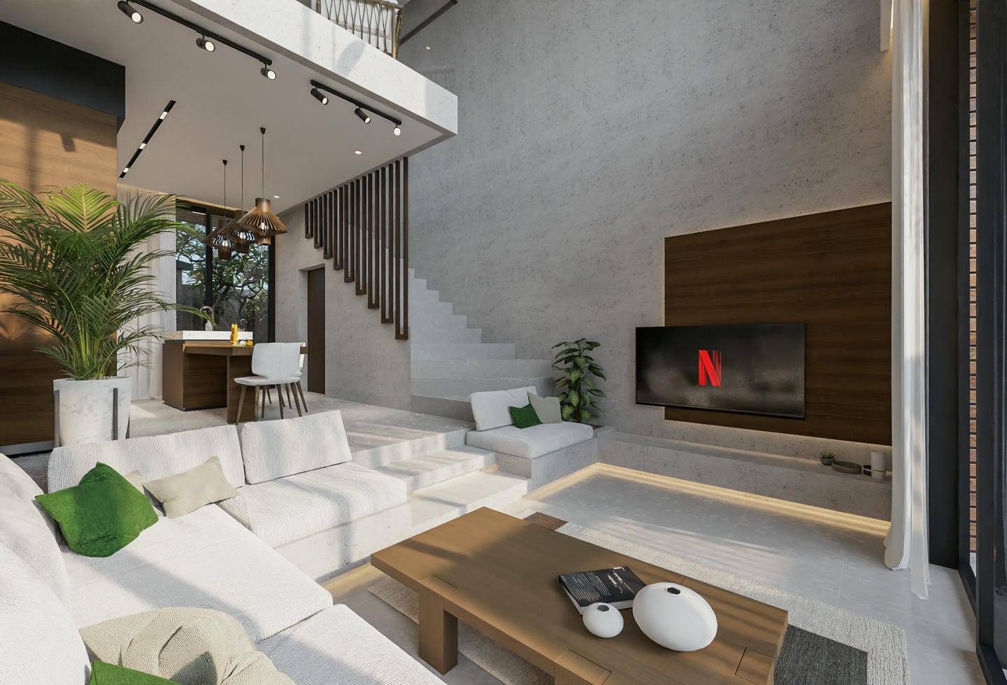 Inside, the villa boasts two bedrooms, each with an ensuite bathroom. The master bedroom features a luxurious bathtub for ultimate relaxation. The home is fully furnished and includes a well-equipped kitchen, high-ceiling windows, a unique sunken seating area, and an additional living room on the second floor.