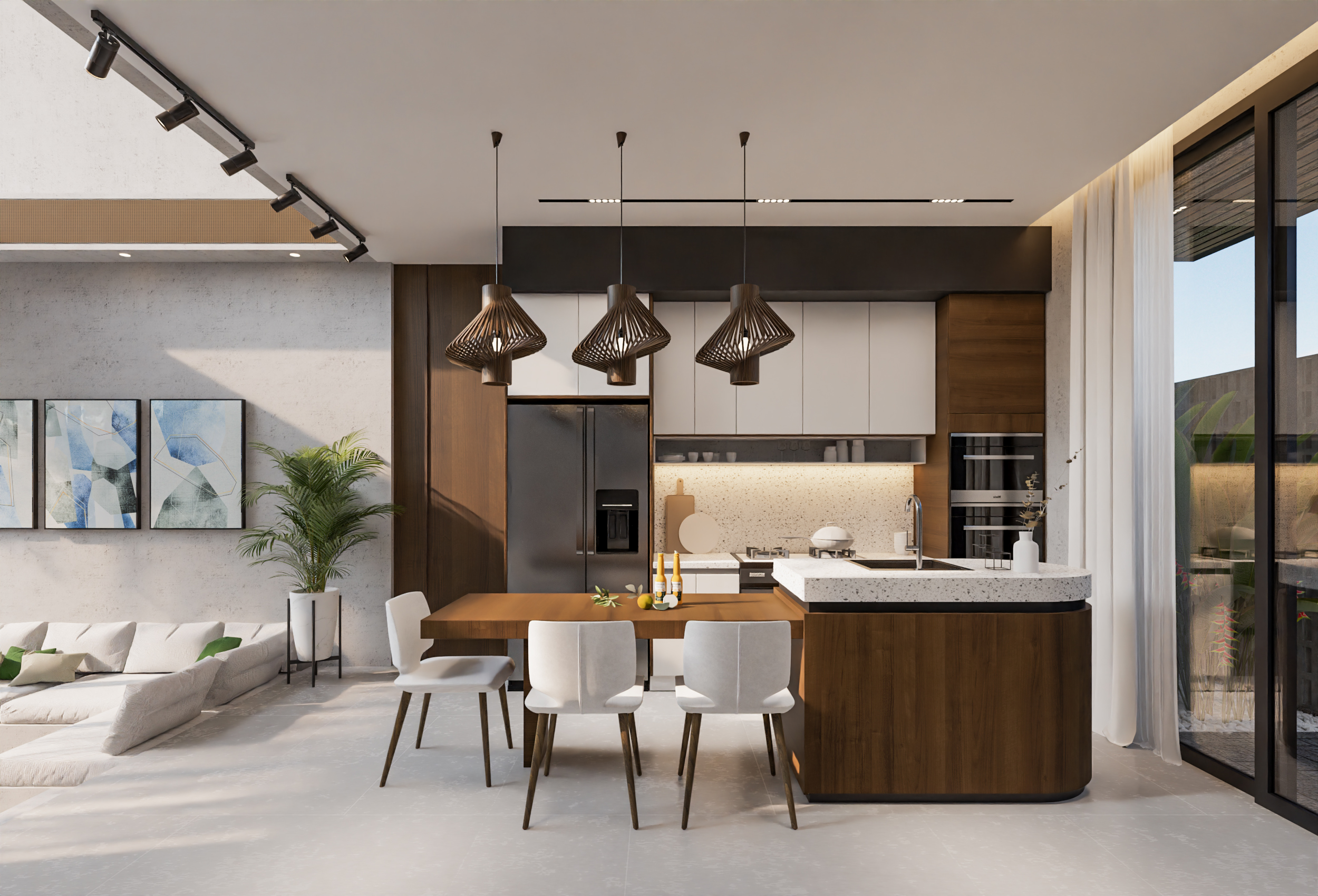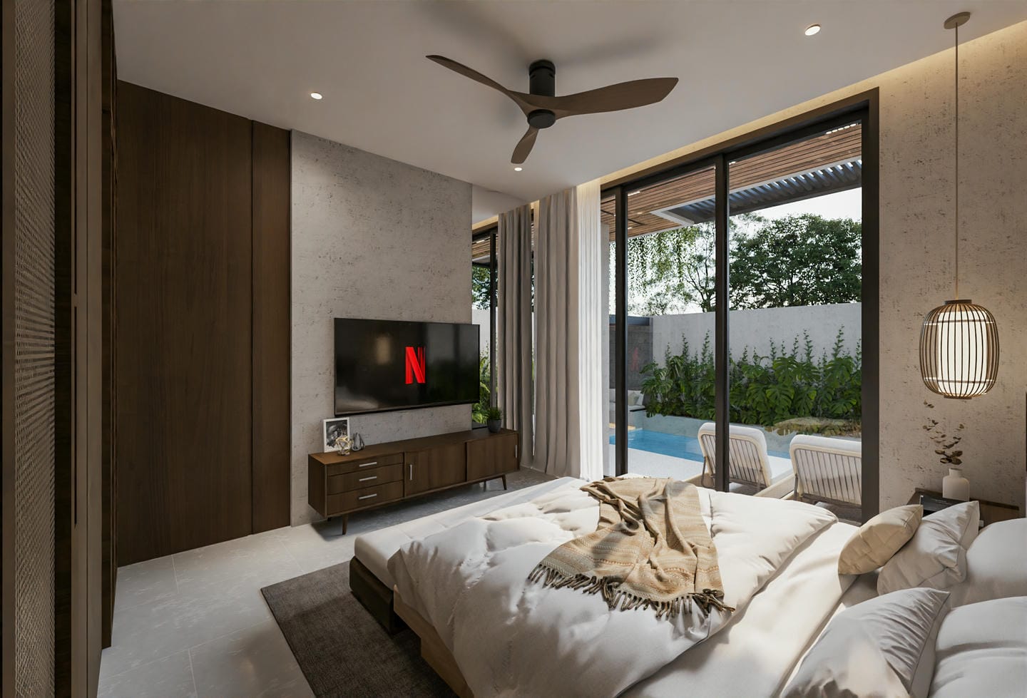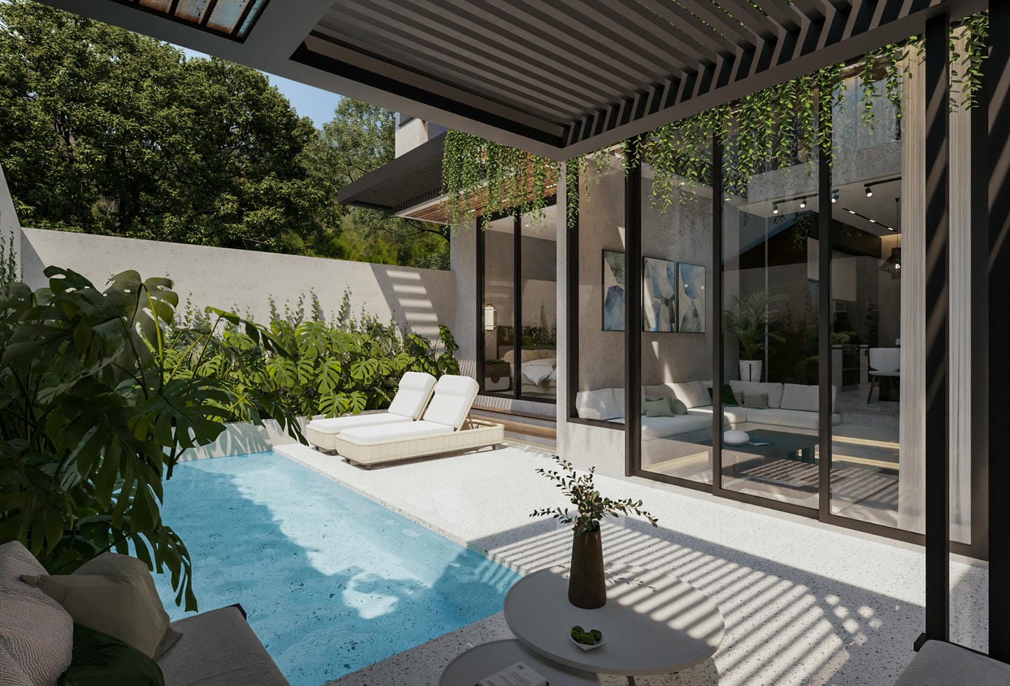 The outdoor area includes a pristine pool with lounge chairs, perfect for soaking up the sun.