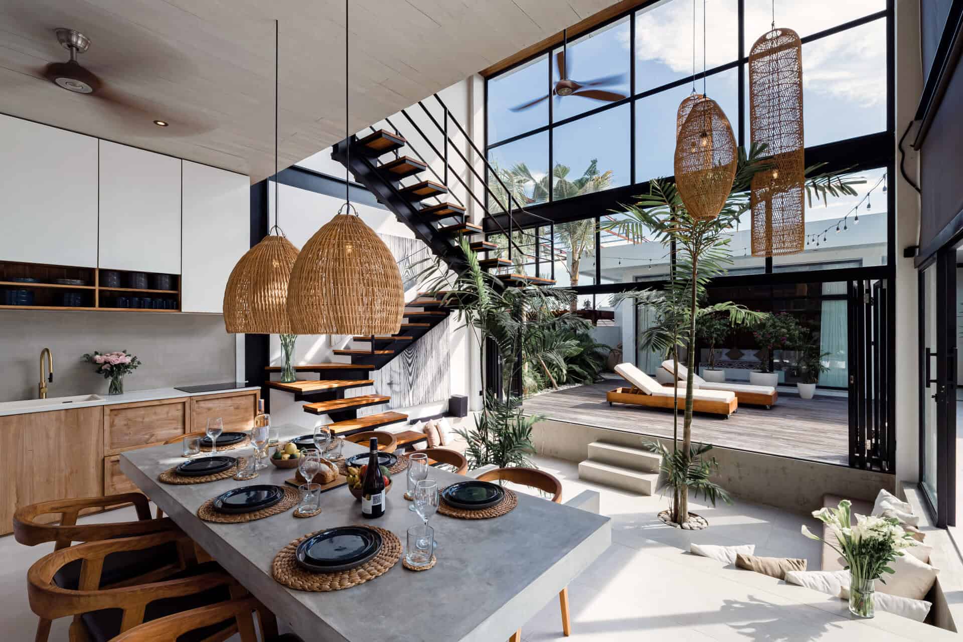 - Interior: Wide floor-to-ceiling doors invite you into the enclosed cozy living room and the modern, fully equipped kitchen. Large windows allow natural light to flood the house.