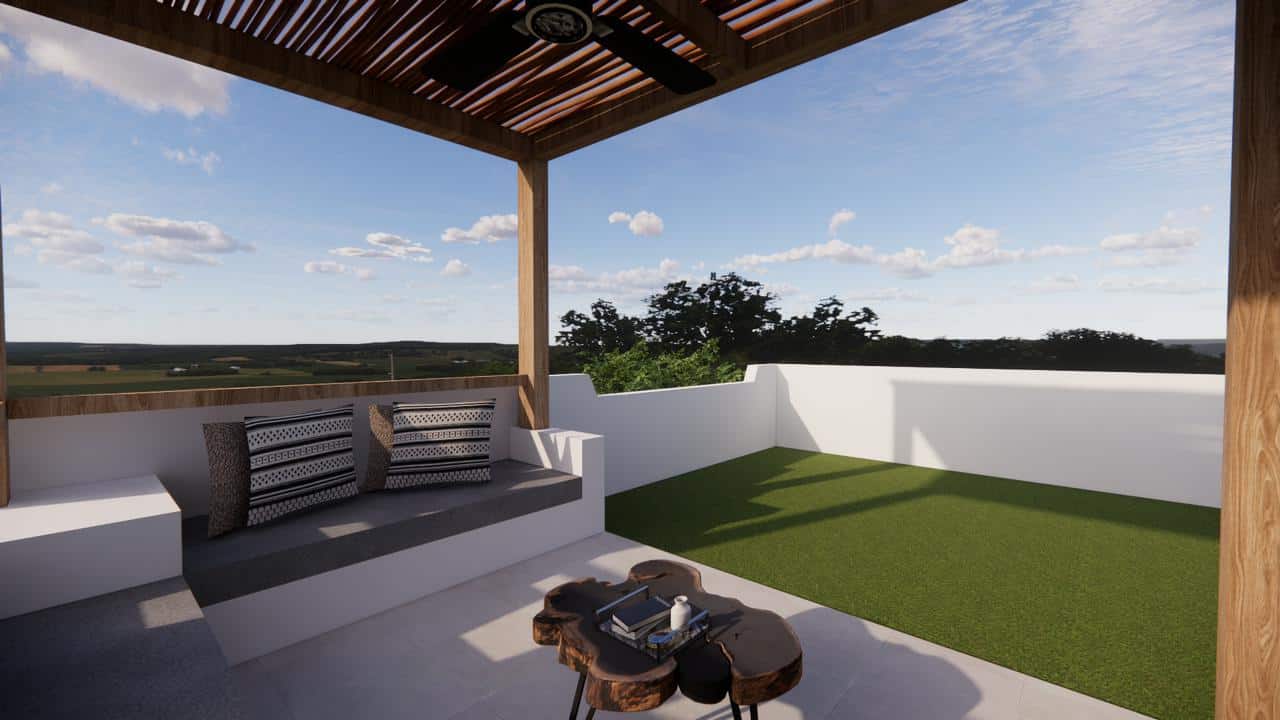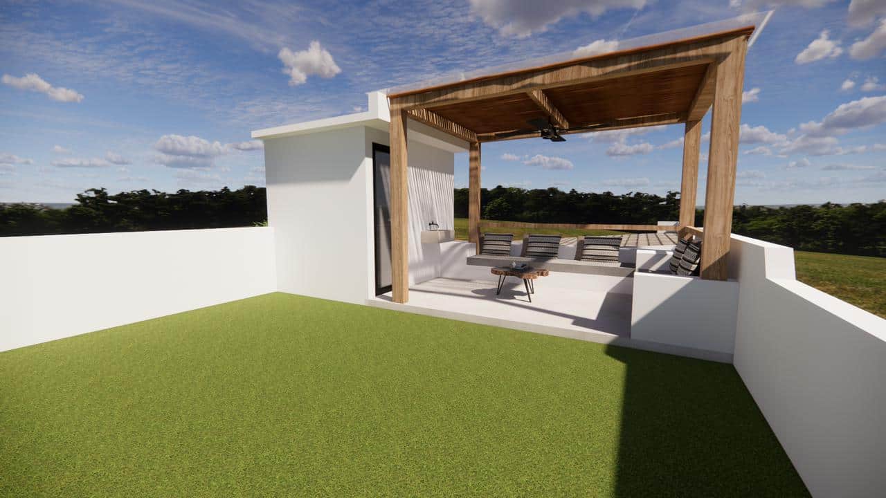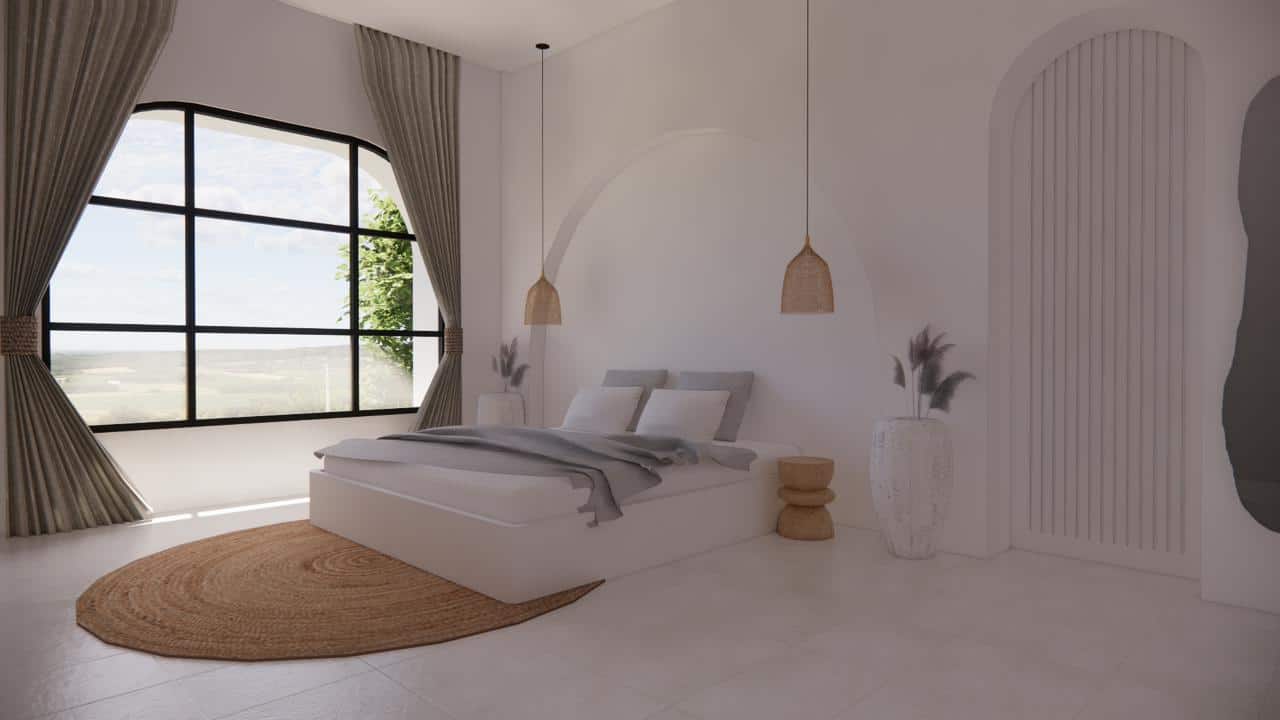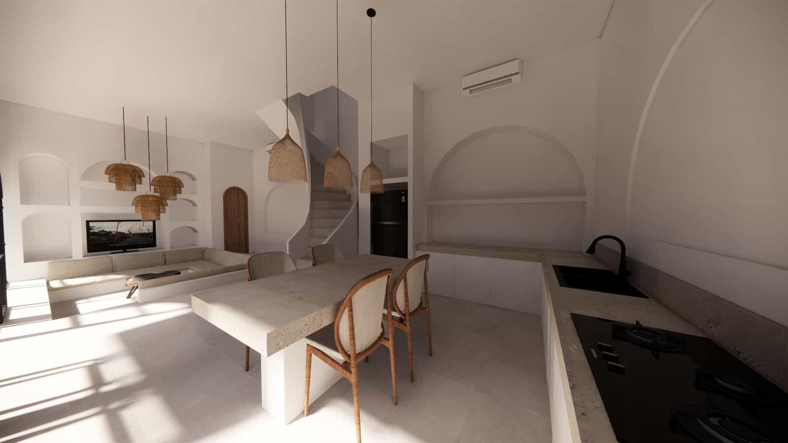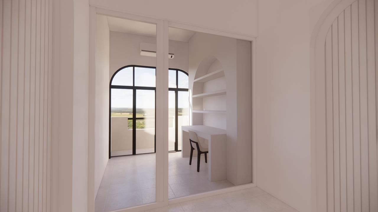 The villa’s sunken living room offers a cozy and intimate space, enhanced by high-ceiling windows that flood the area with natural light, creating an airy and open feel. An additional room provides flexibility, ideal for use as an office, studio, or personalized space.