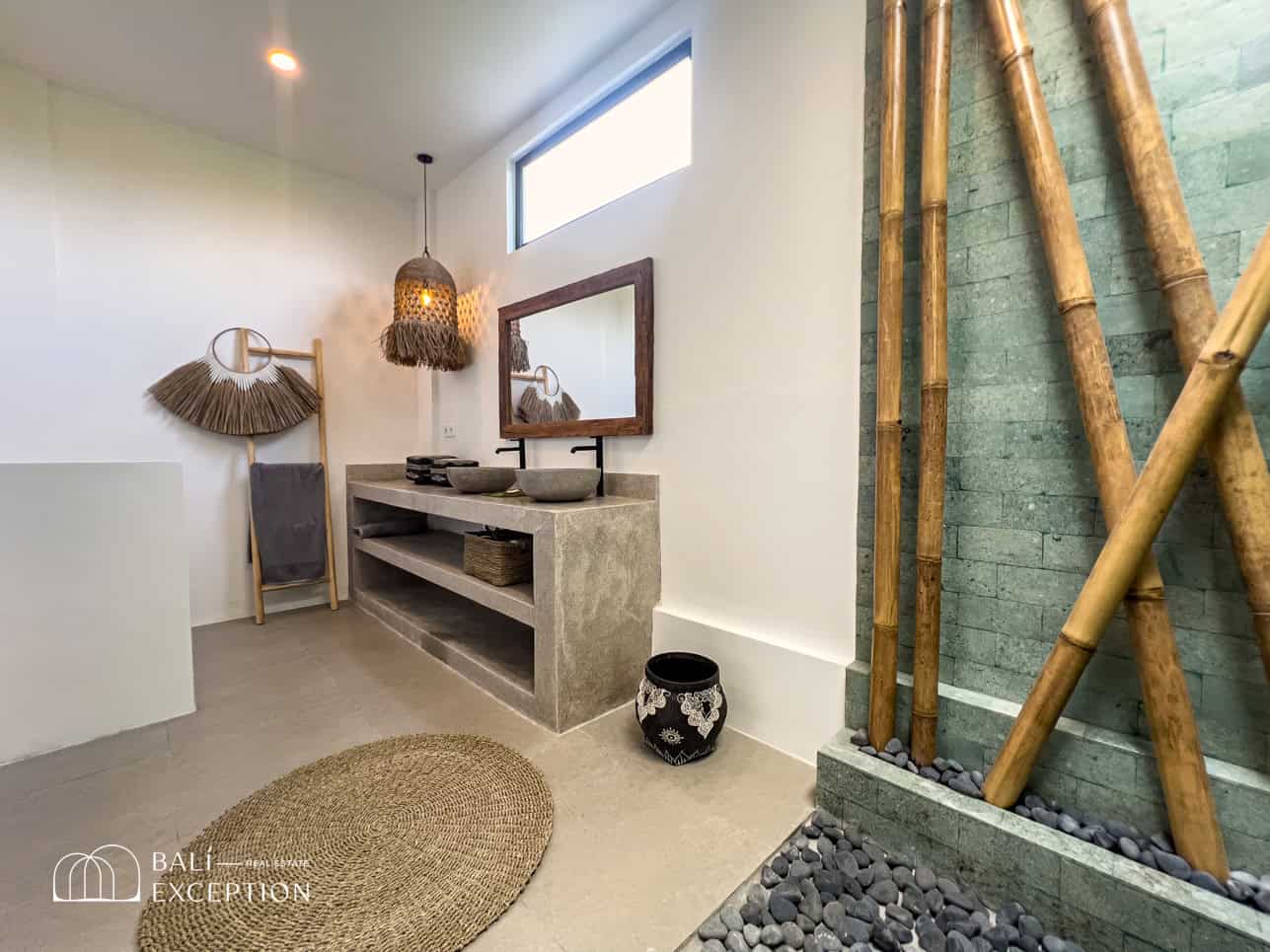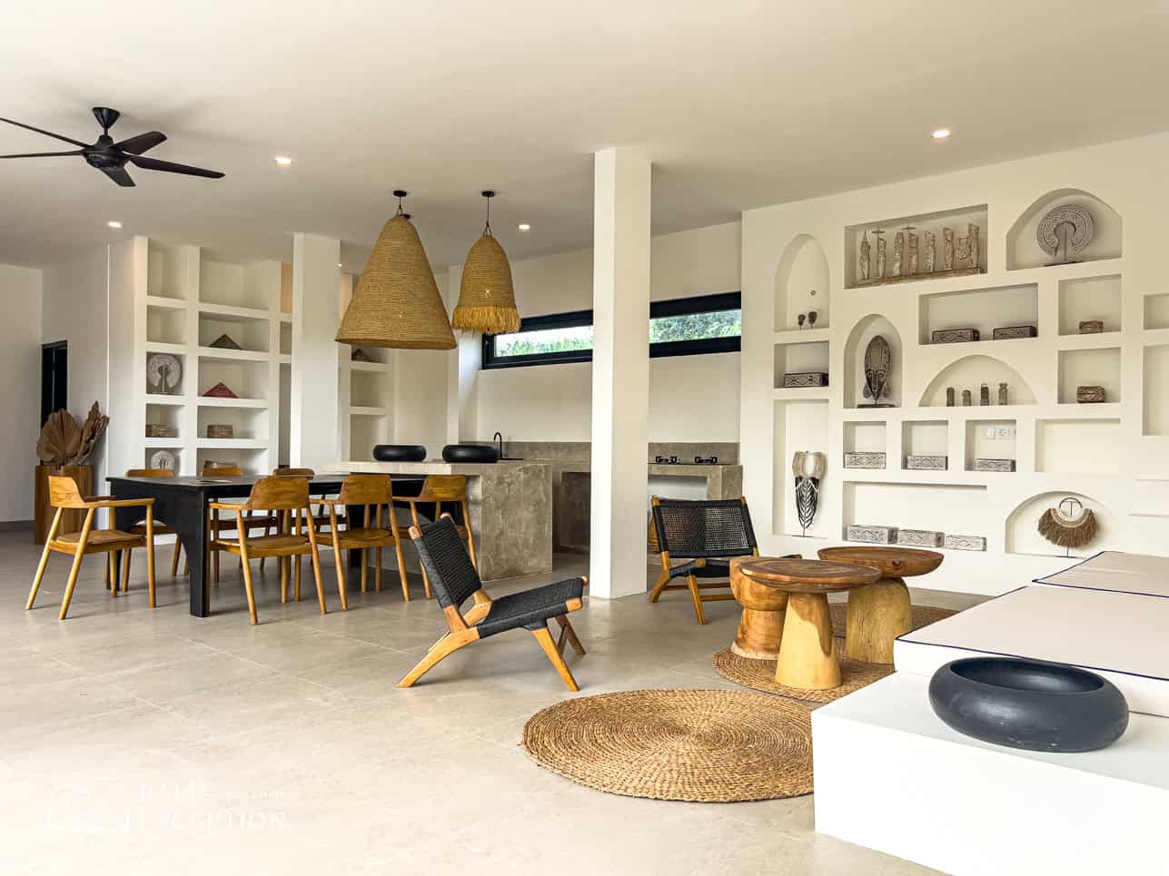 The villa’s interior is designed to maximize natural light, with an open-plan living and dining area that connects directly to the pool. The bathrooms feature bamboo accents, adding a natural and distinctive touch to the design.