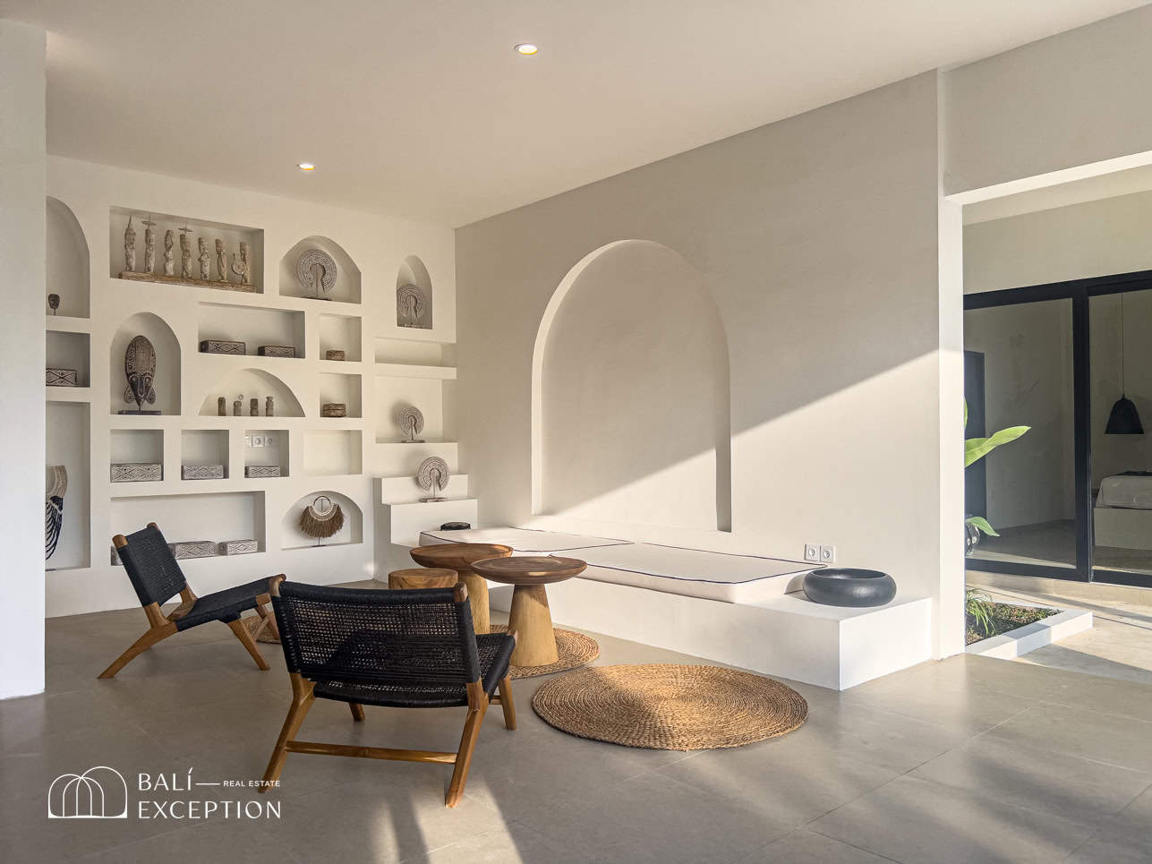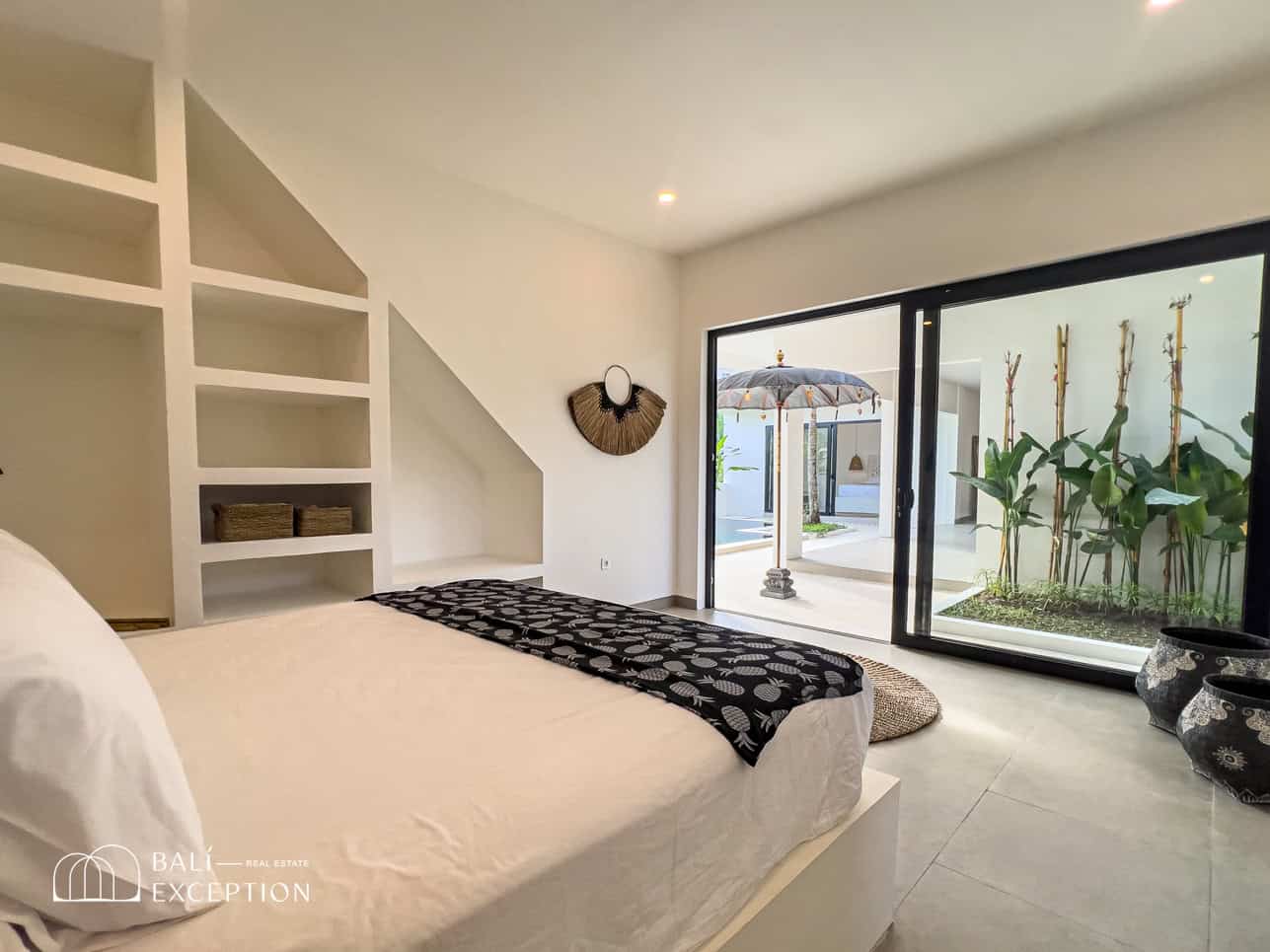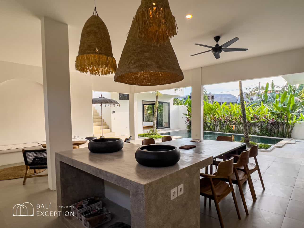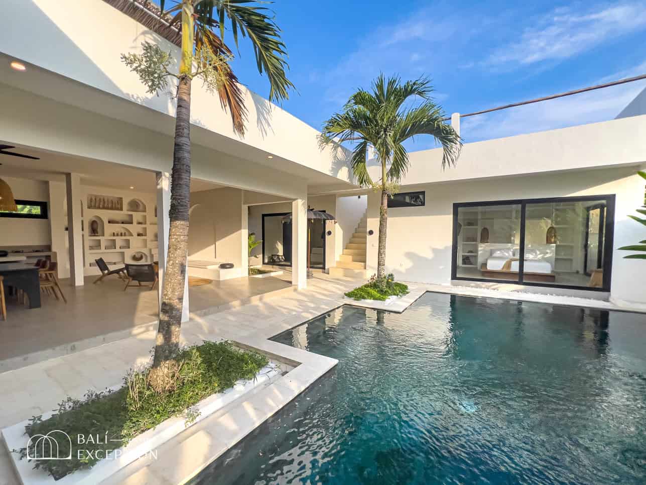Located in the sought-after area of Pererenan, this modern tropical-style villa offers a functional and streamlined living space. Featuring 3 bedrooms and 3 bathrooms across 185 m² of built space on a 300 m² plot, it provides a pleasant and well-arranged living environment. The pool, surrounded by palm trees, blends seamlessly into the garden, creating a relaxing outdoor space. The villa also includes a rooftop, perfect for enjoying sunsets and panoramic views.