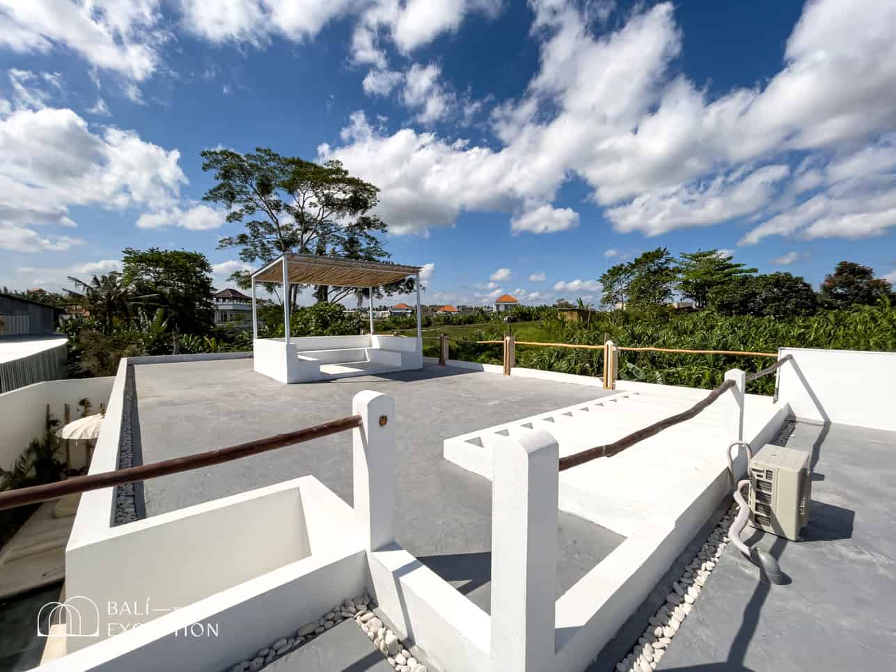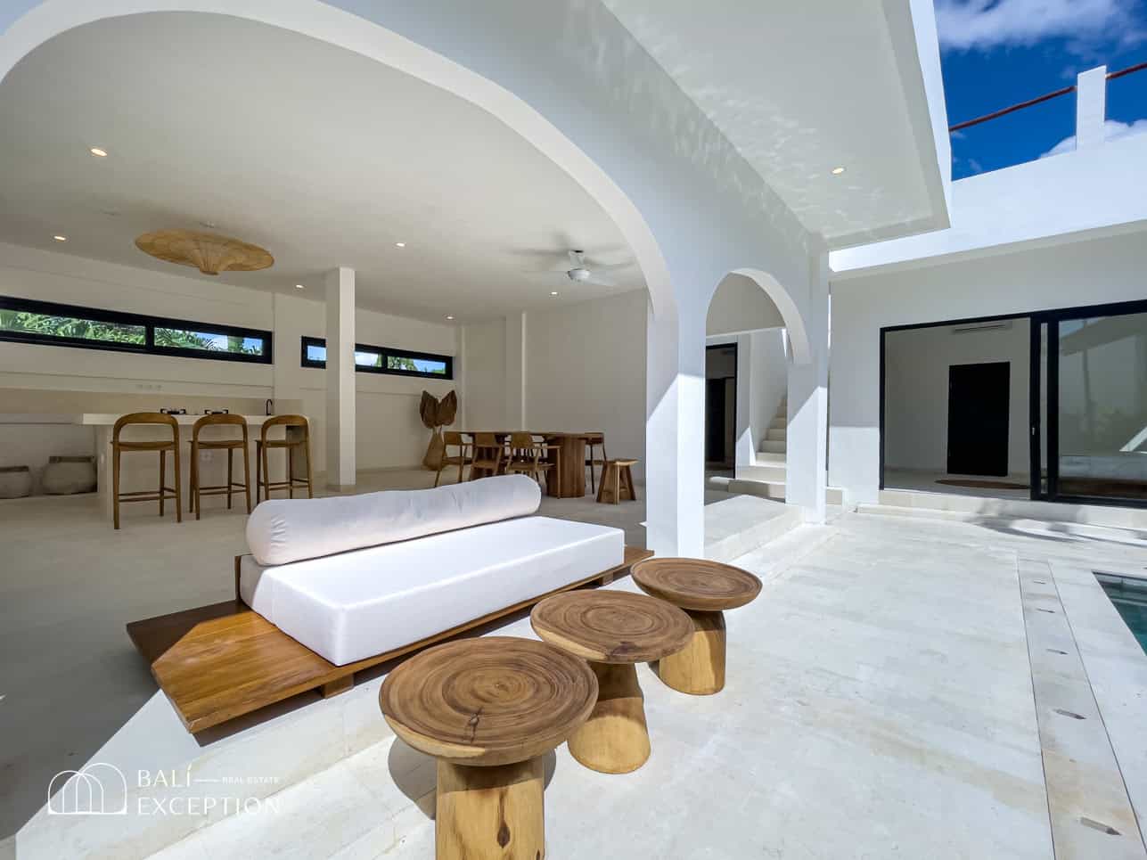 The common area, including the living room, dining area, and kitchen, is fully open to the outside through three arches, allowing a smooth connection between indoor and outdoor spaces. The villa also features a spacious rooftop with a sofa, perfect for enjoying sunsets and panoramic views.
