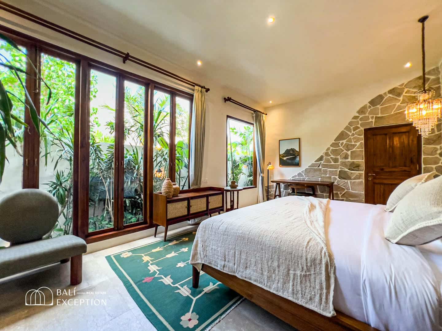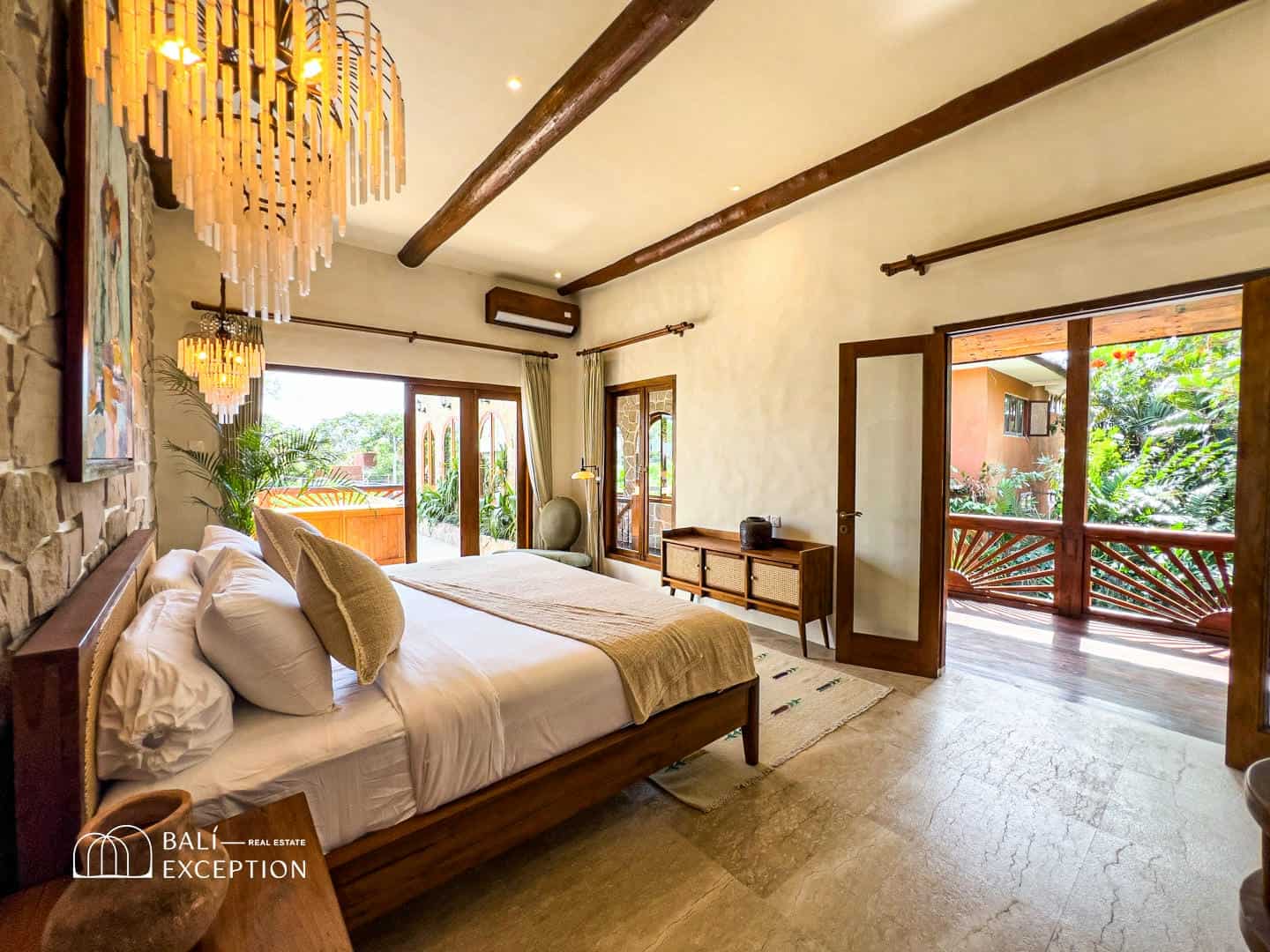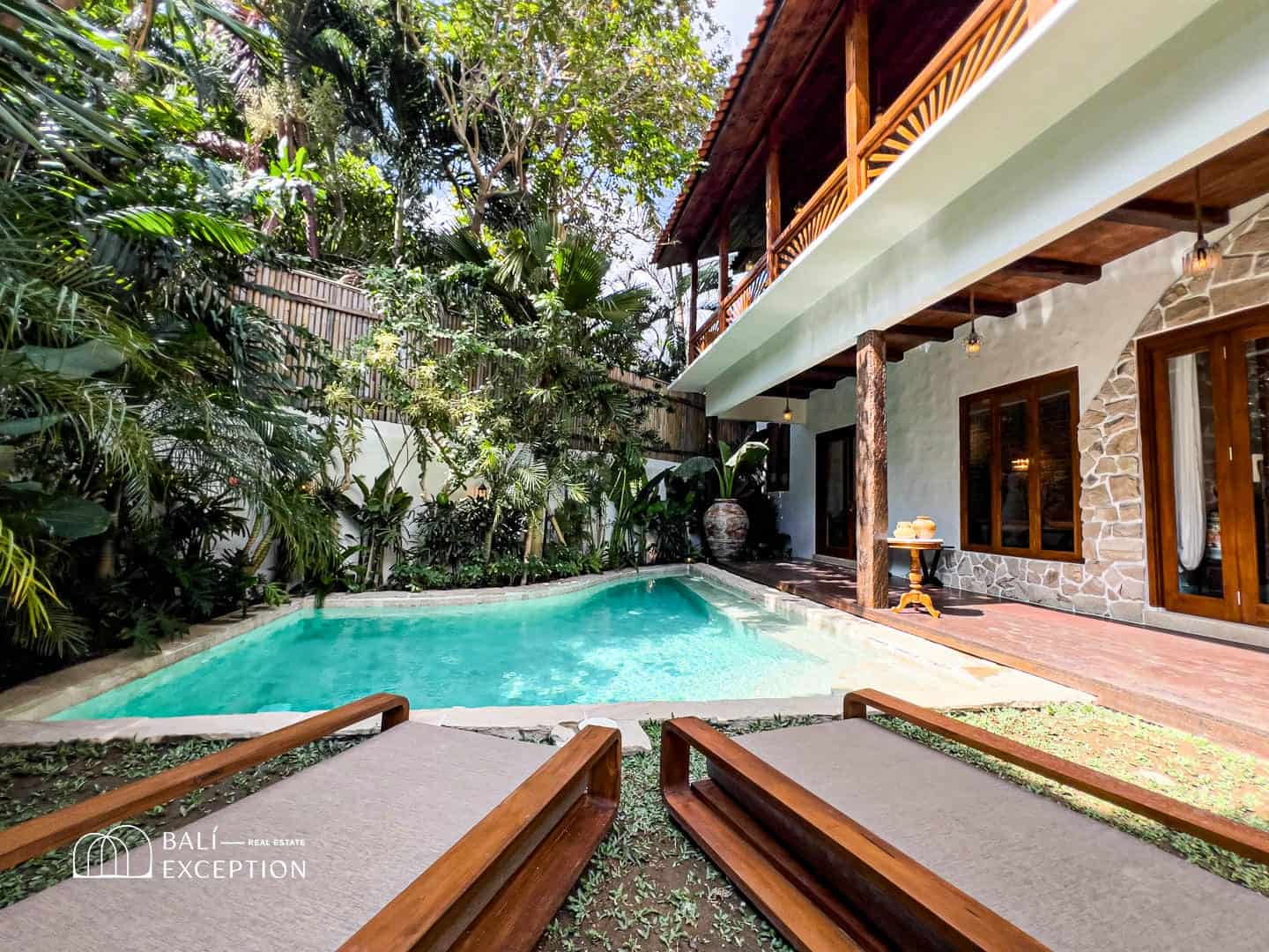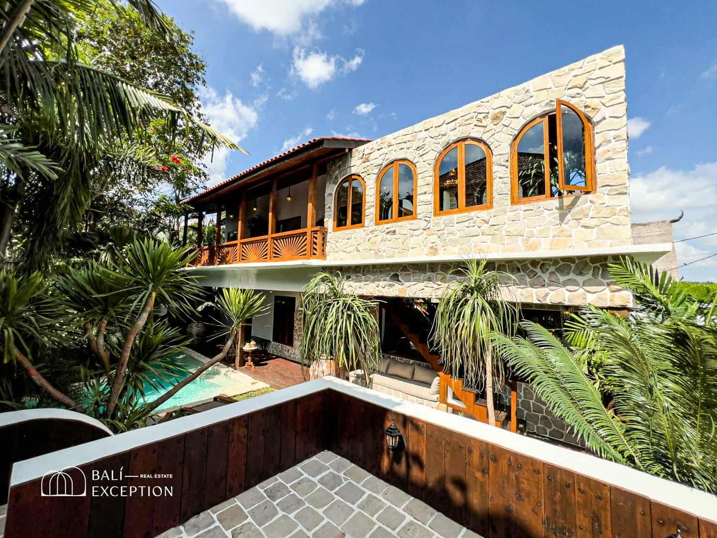 Step outside to enjoy the private pool, perfect for soaking in Bali’s tropical climate. The top floor features two balconies offering stunning views of the surroundings, enhancing the villa’s charm and providing tranquil spaces for relaxation.