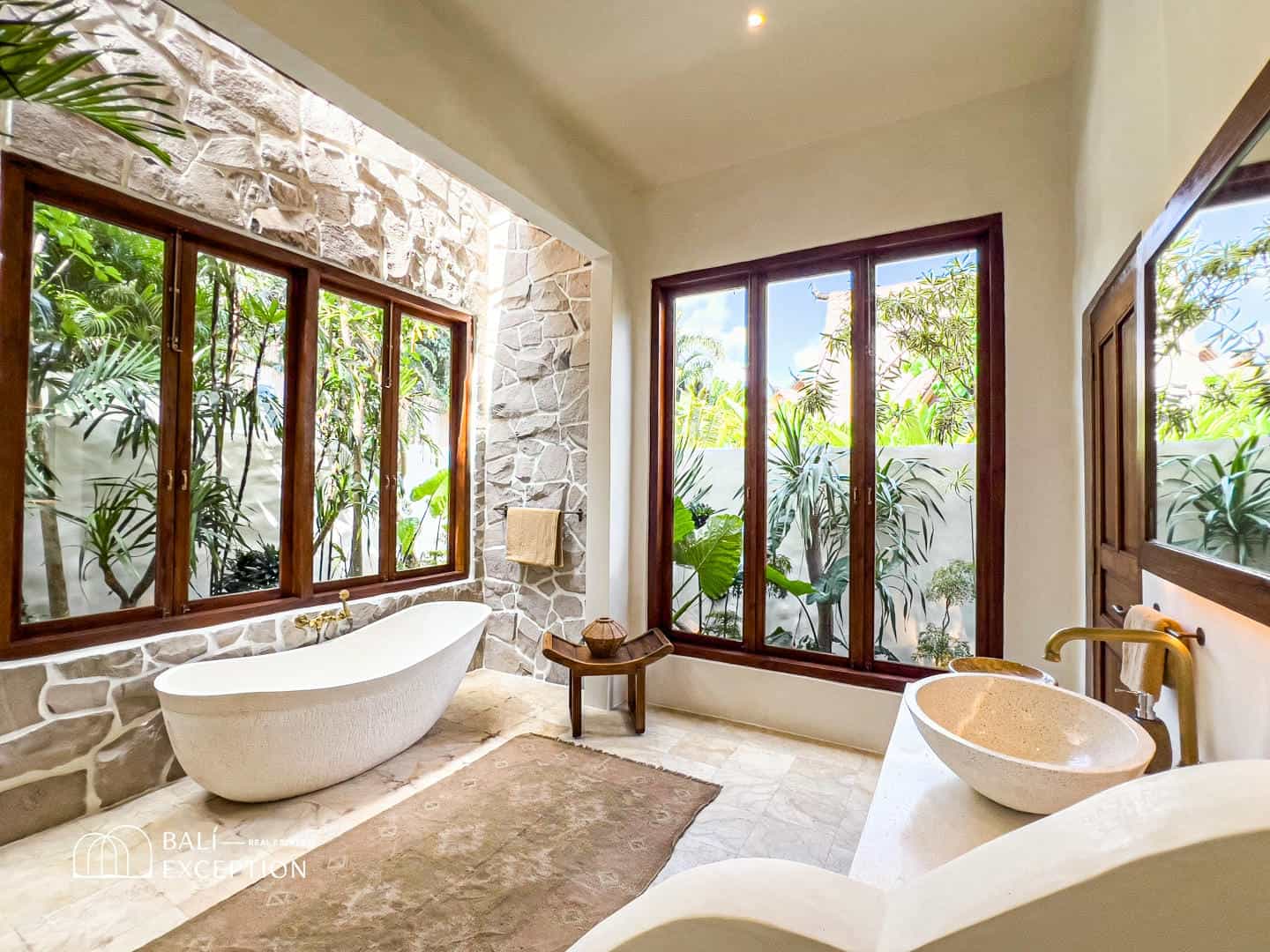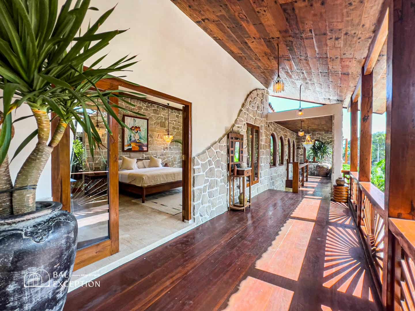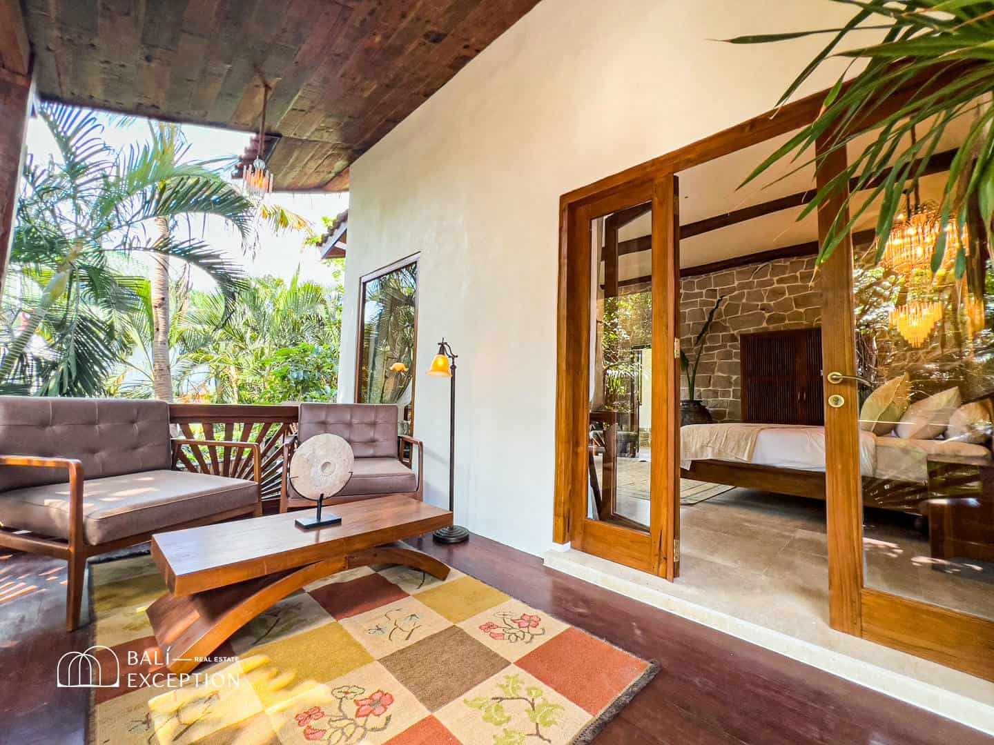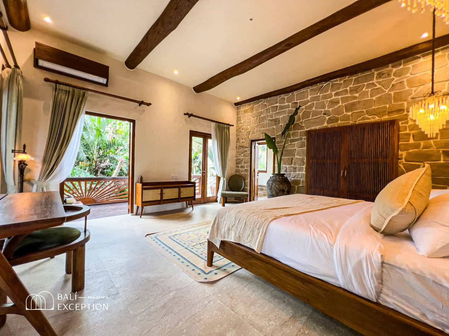 Step outside to enjoy the private pool, perfect for soaking in Bali’s tropical climate. The top floor features two balconies offering stunning views of the surroundings, enhancing the villa’s charm and providing tranquil spaces for relaxation.