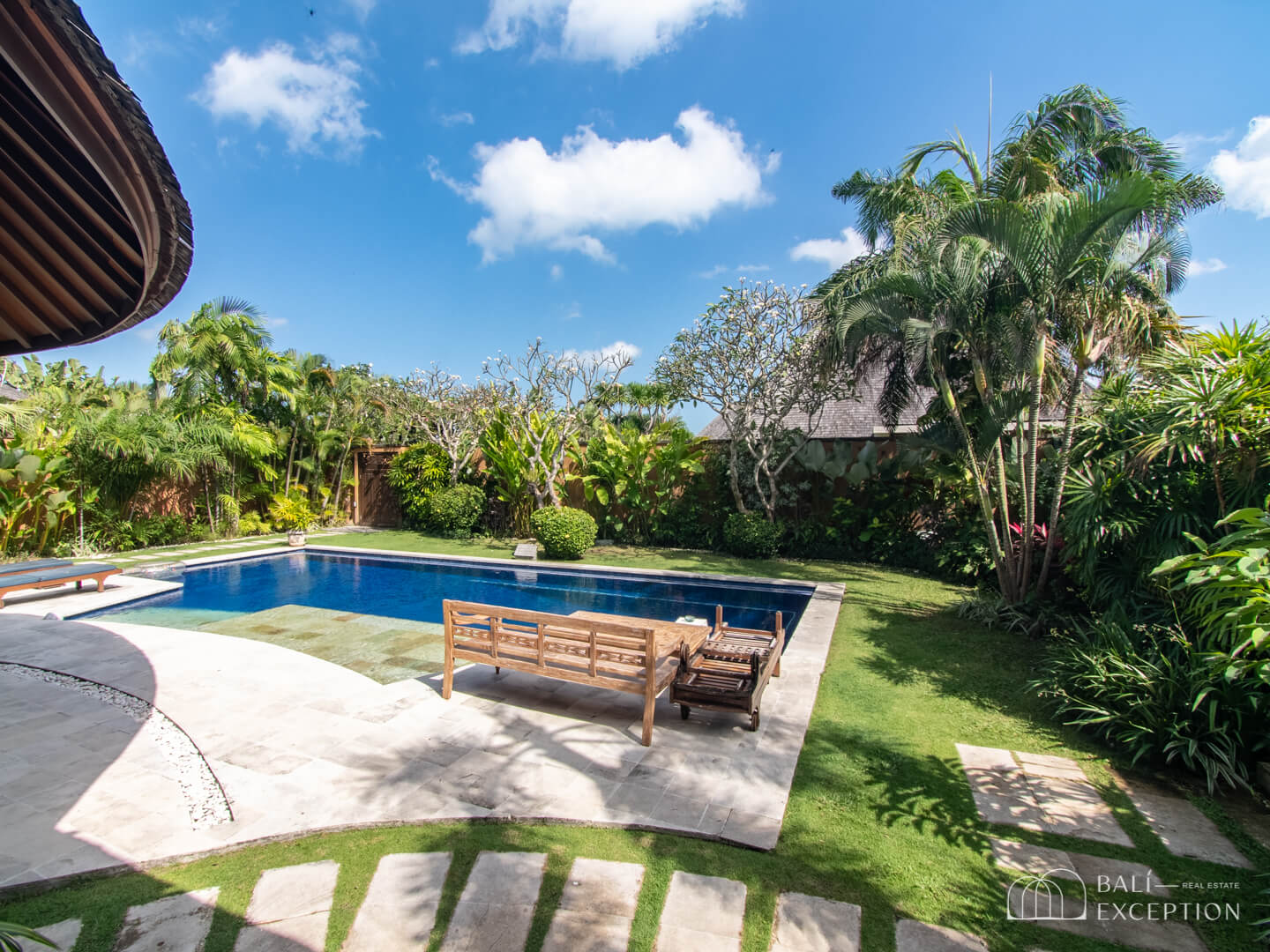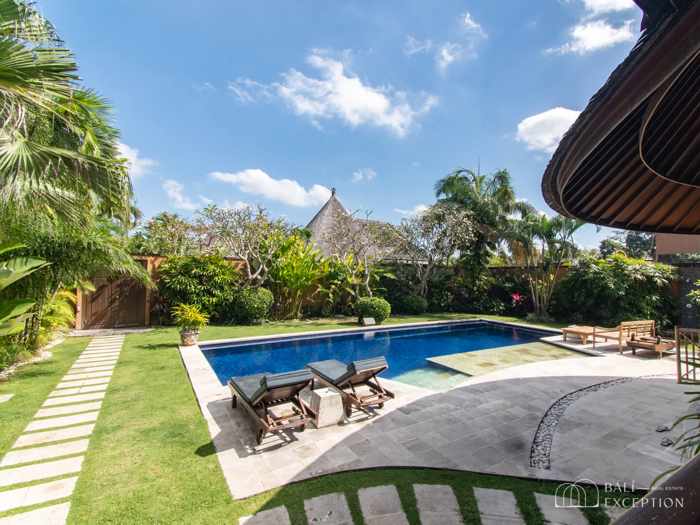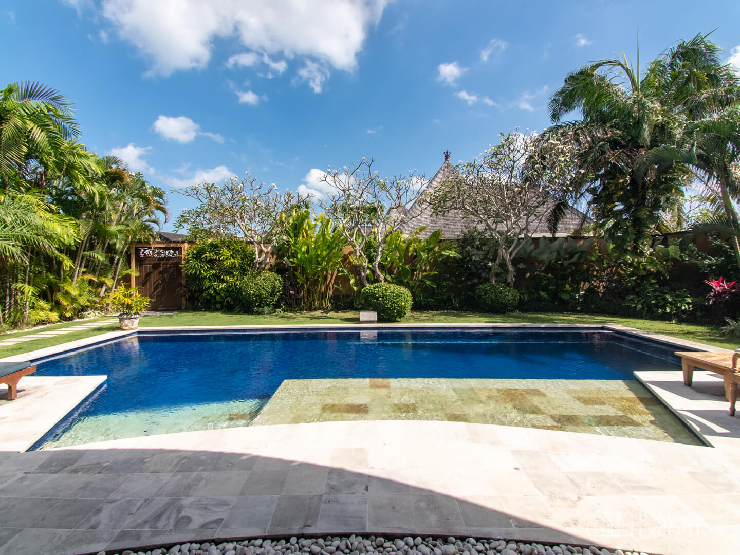 Stepping outside, you’ll be greeted by a garden and a 6 x 12 meters pool accompanied by elegant lounge chairs, inviting you to relax under the Bali sun.