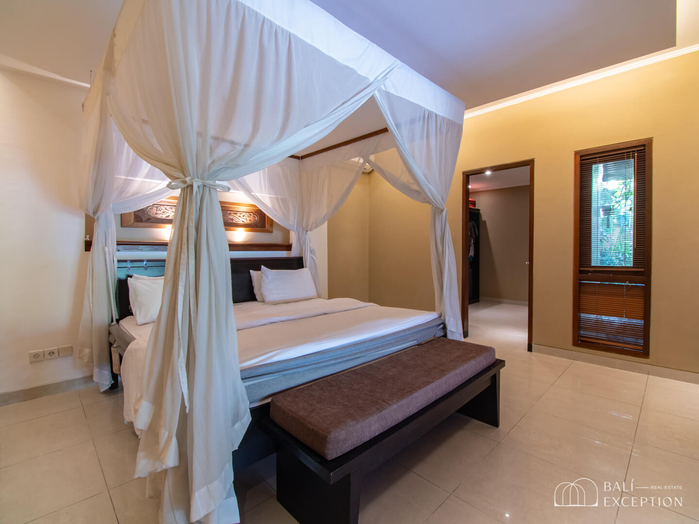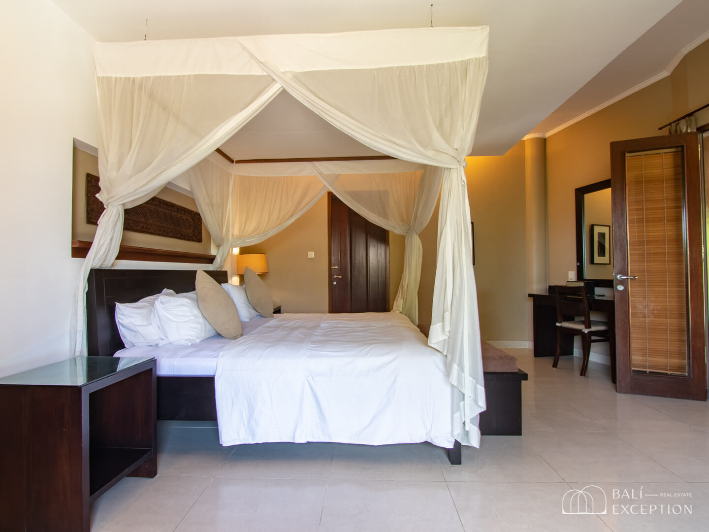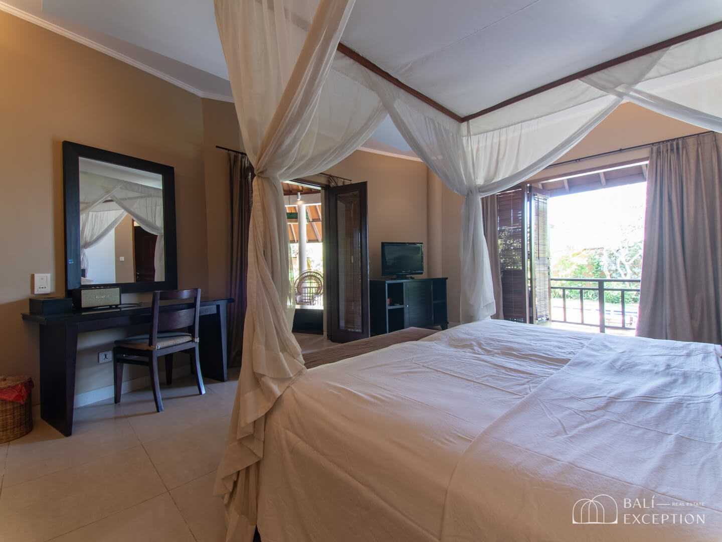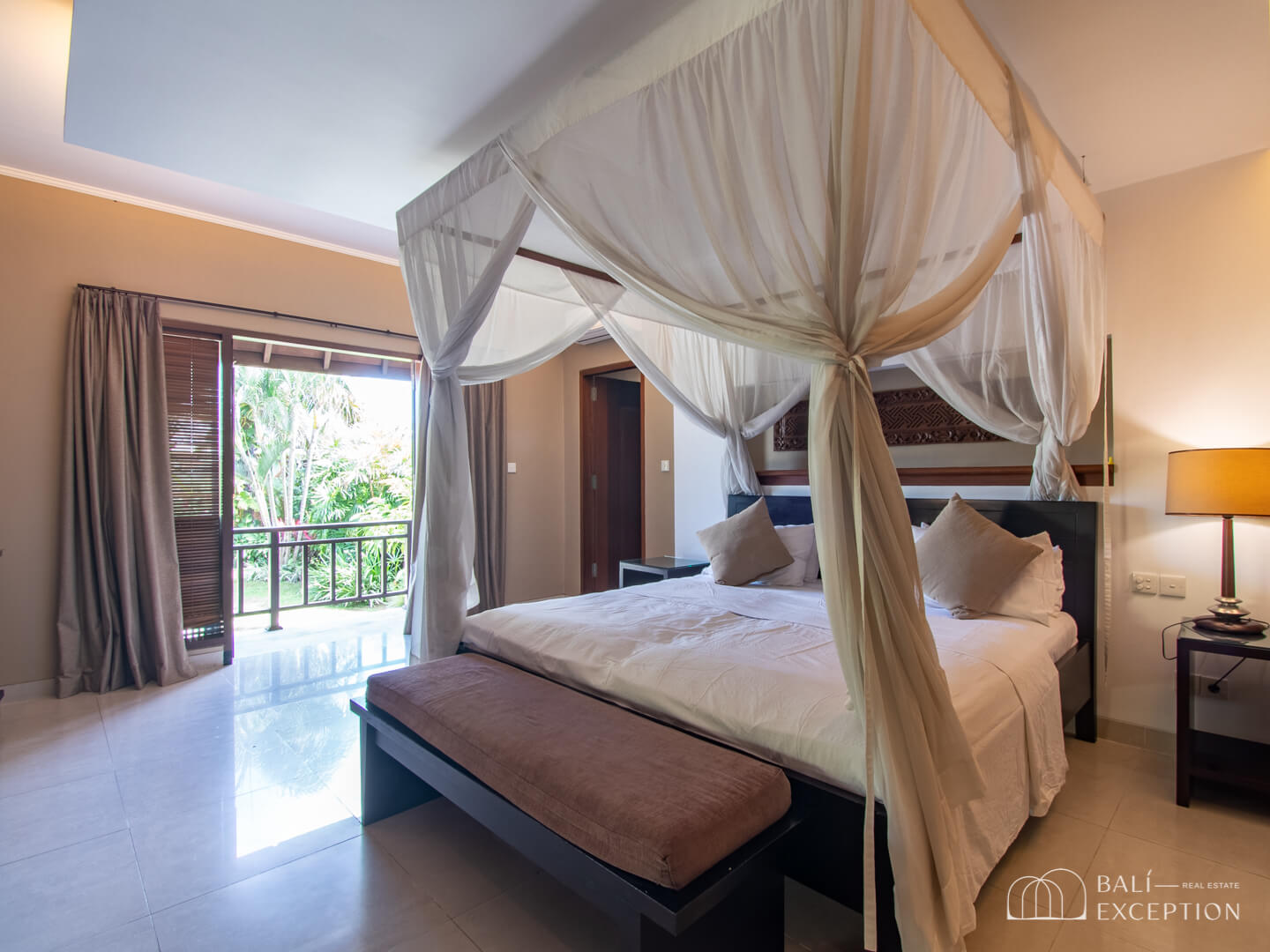Stepping outside, you’ll be greeted by a garden and a 6 x 12 meters pool accompanied by elegant lounge chairs, inviting you to relax under the Bali sun.