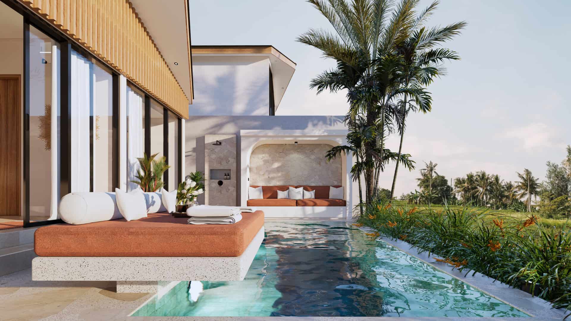 Escape to tranquillity in this exquisite villa located in the peaceful oasis of Seseh only 400 meters from the beach and 15 minutes from the centre of Canggu. Surrounded by picturesque unblocked sustainable rice field and volcano views for 55 meter due to temple owned land, the cool air and natural beauty create the perfect retreat from the hustle and bustle of daily life. The villa’s stunning modern-tropical design, complemented by charming wooden accents, adds to its allure, making it a true architectural gem.