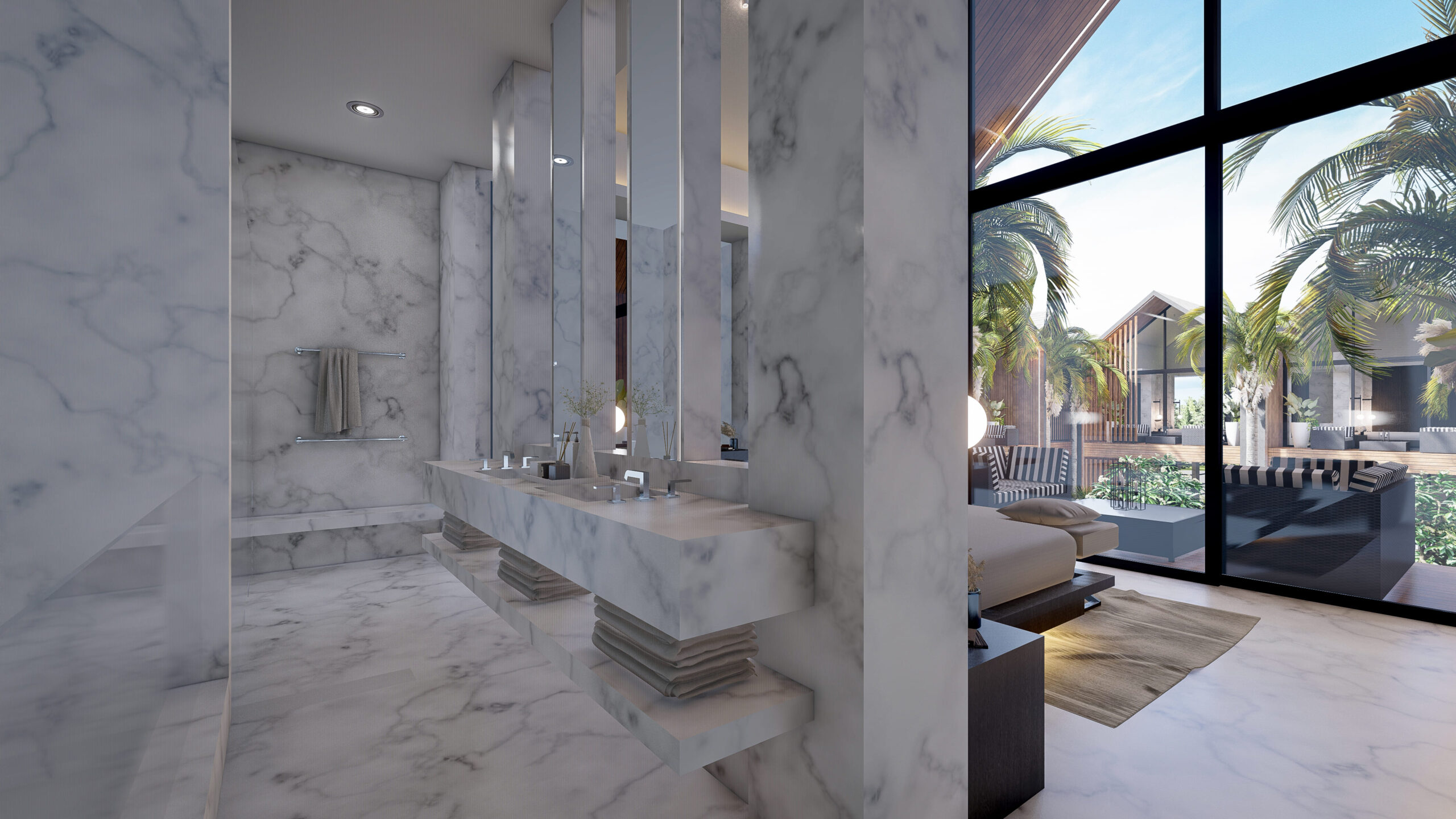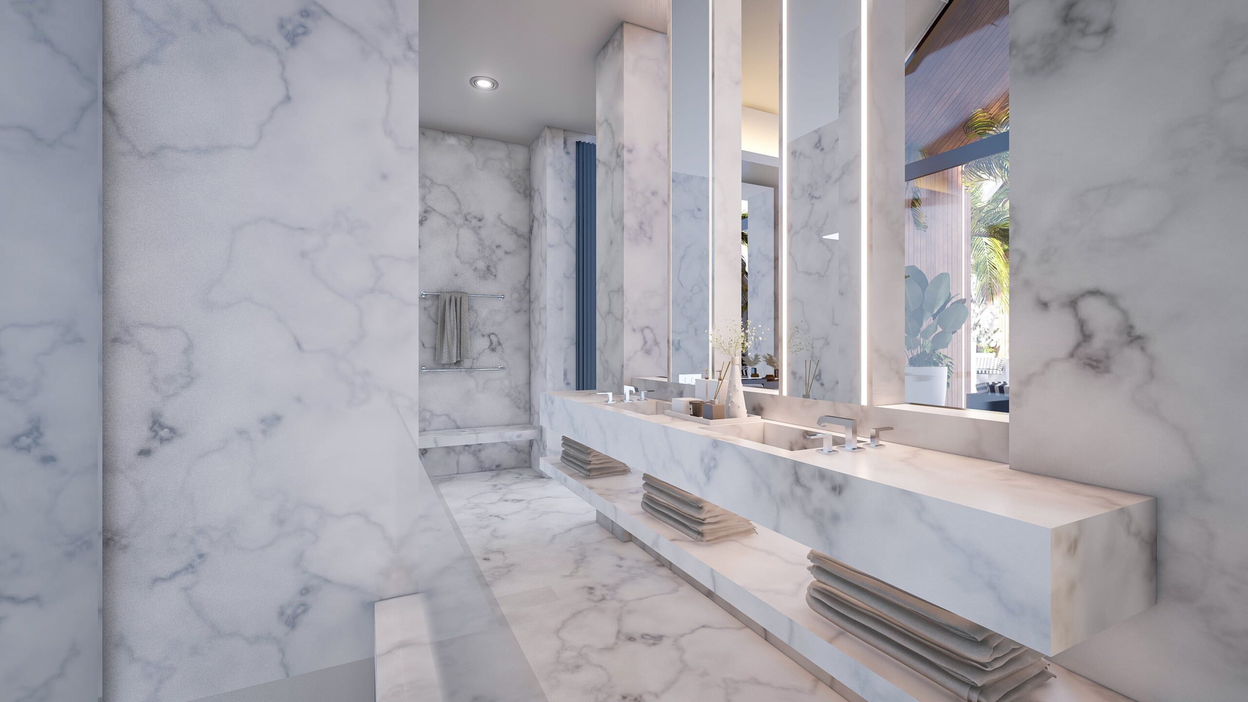 - Sophisticated Interior: Step inside to explore an interior adorned with a sophisticated white marble pattern gracing both the floor and walls. This two-story retreat features a singular bedroom sanctuary, complete with a lavish ensuite bathroom.