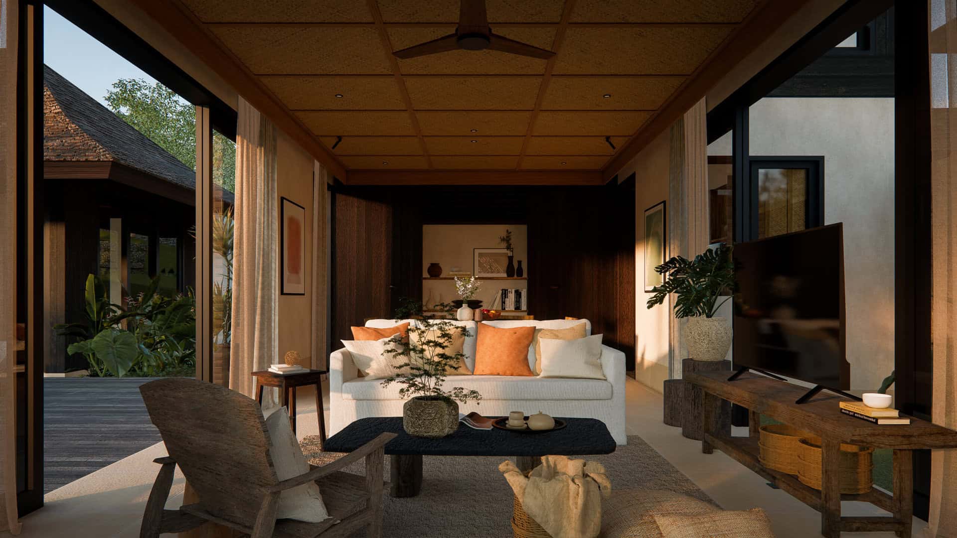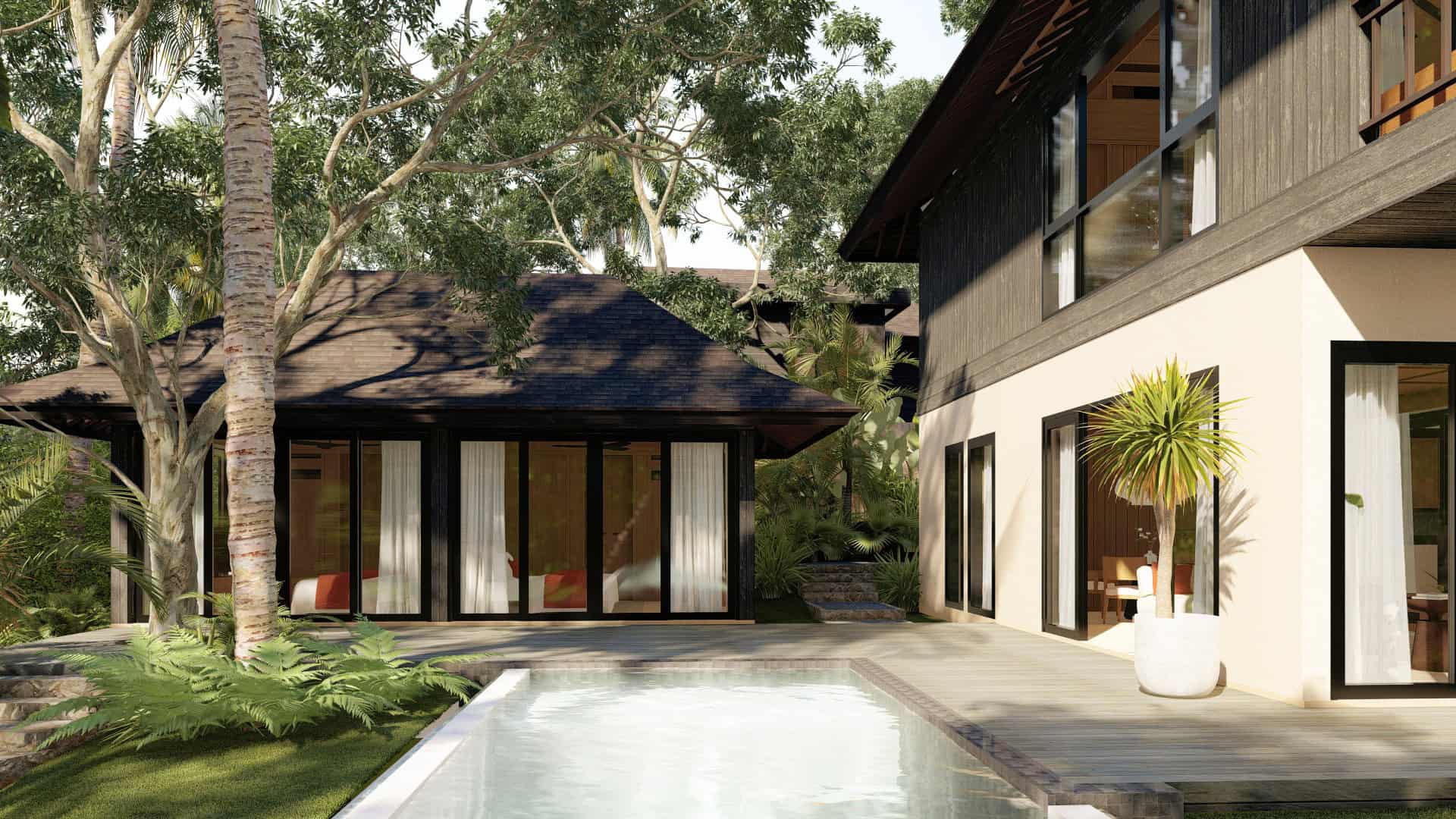 Designed by an award-winning architect, the villa features modern elegance with functional luxury. This fully furnished home includes three spacious bedrooms, each with its own ensuite bathroom, and a master suite with a luxurious bathtub. High ceiling windows and an open layout enhance the airy, bright atmosphere, making it a standout in real estate investment opportunities in Bali.