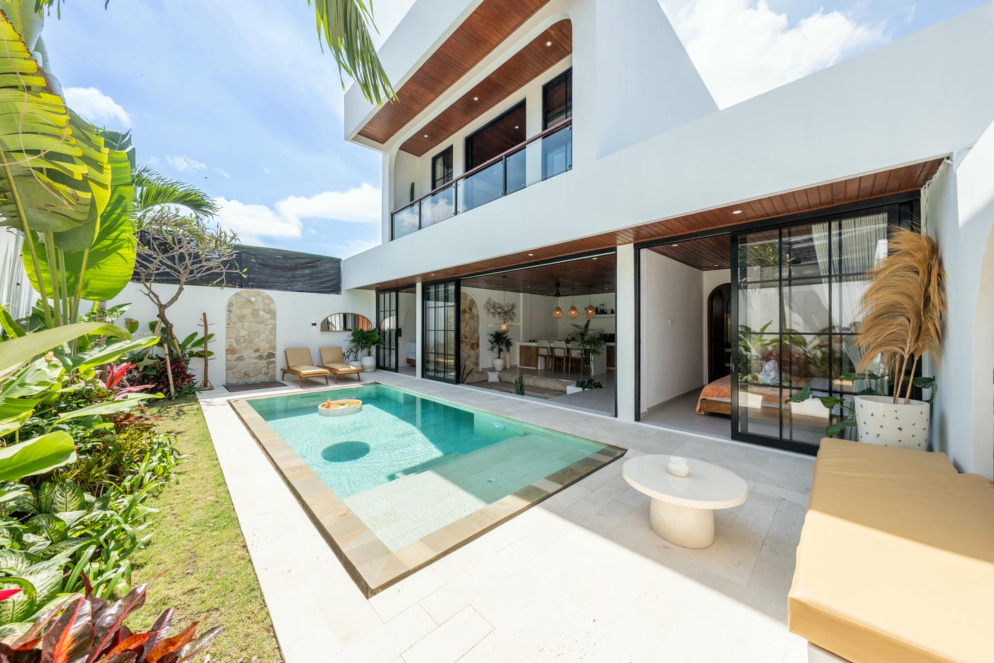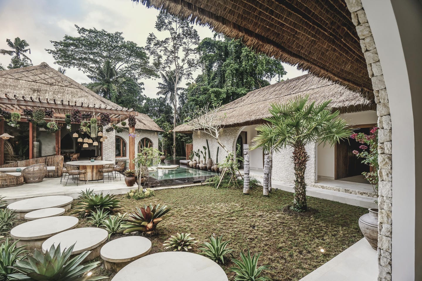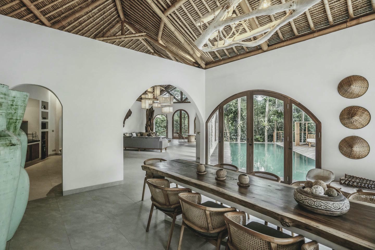 The outdoor area features a swimming pool at the center of the property, surrounded by tropical greenery and peaceful jungle views that create a calm and relaxing atmosphere.