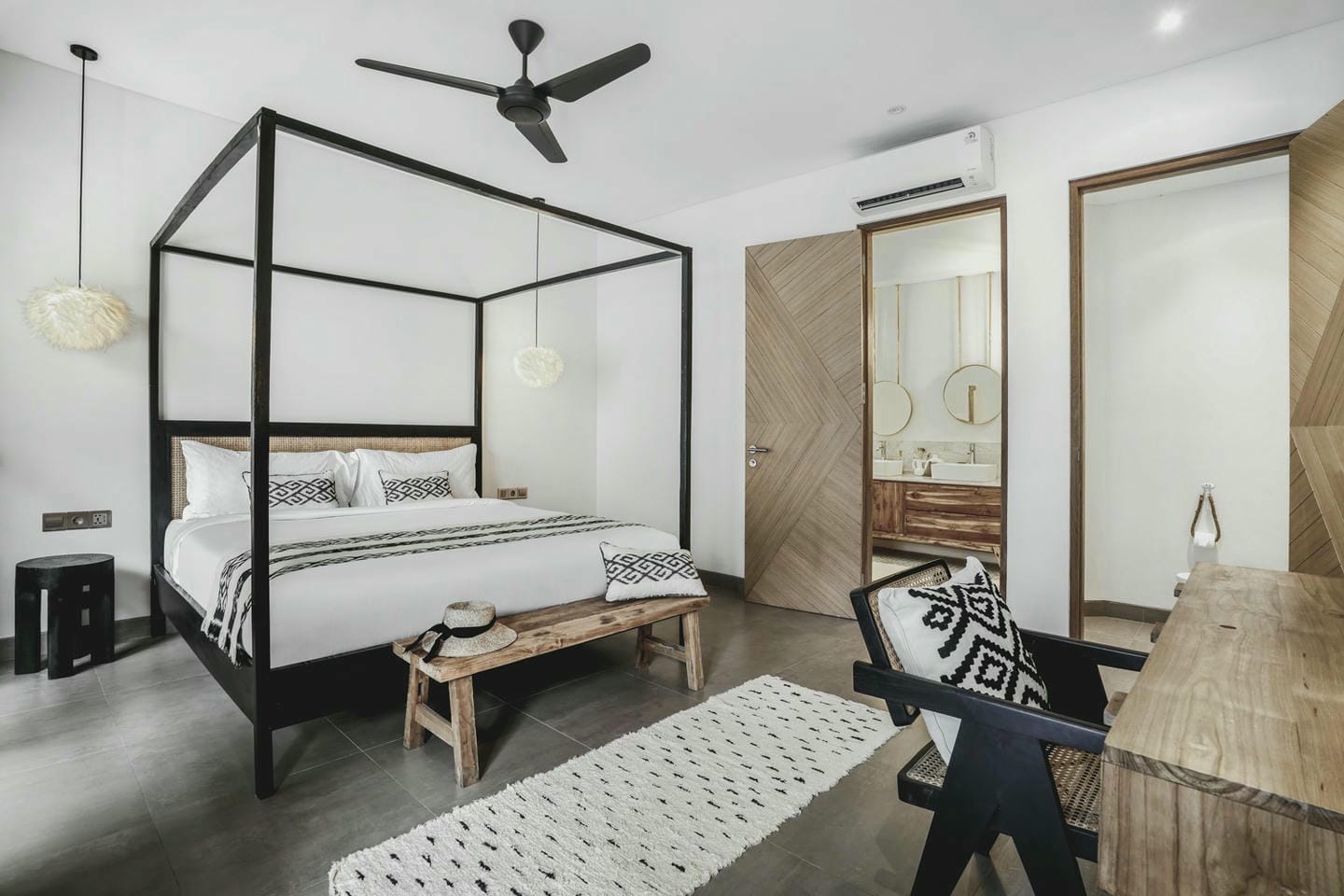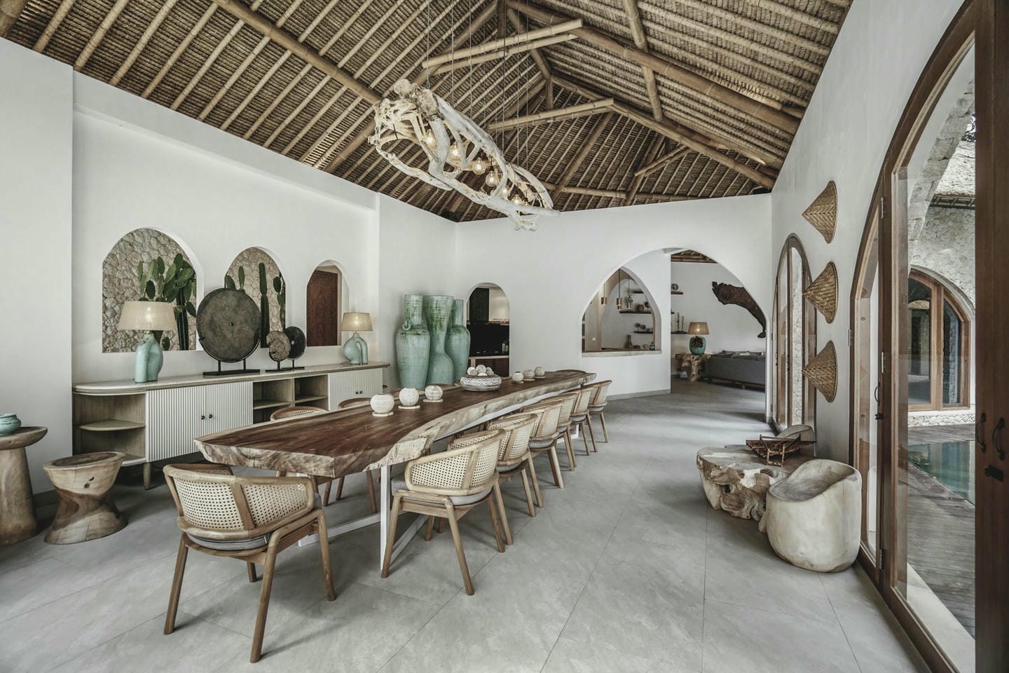 Inside, the villa showcases high ceilings and natural wood finishes. The property features six spacious bedrooms, each with its own ensuite bathroom, as well as an additional guest bathroom. Fully furnished, the villa is set on 1,230 sqm of land and offers generous living areas, a bright open-plan living and dining space, and a fully equipped kitchen that flows naturally throughout the home.