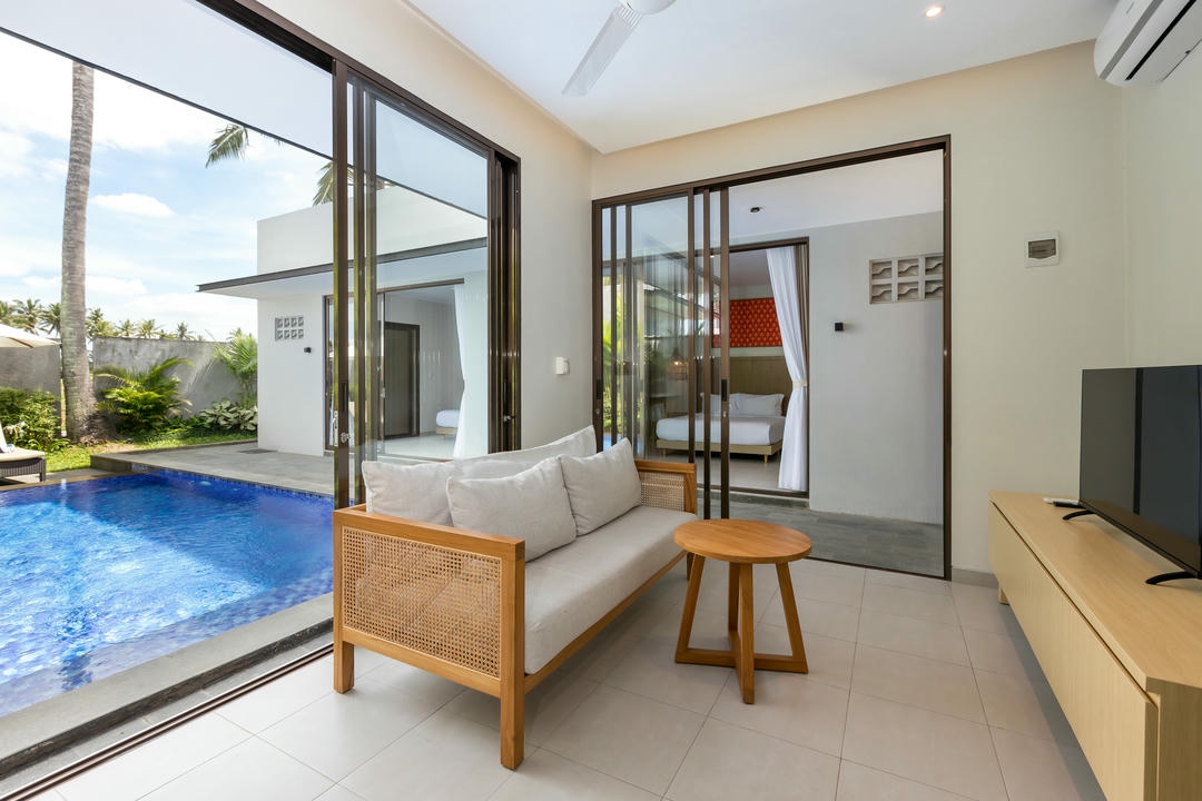 Step outside to your private pool with sunbeds, ideal for relaxing and enjoying the tropical ambiance.