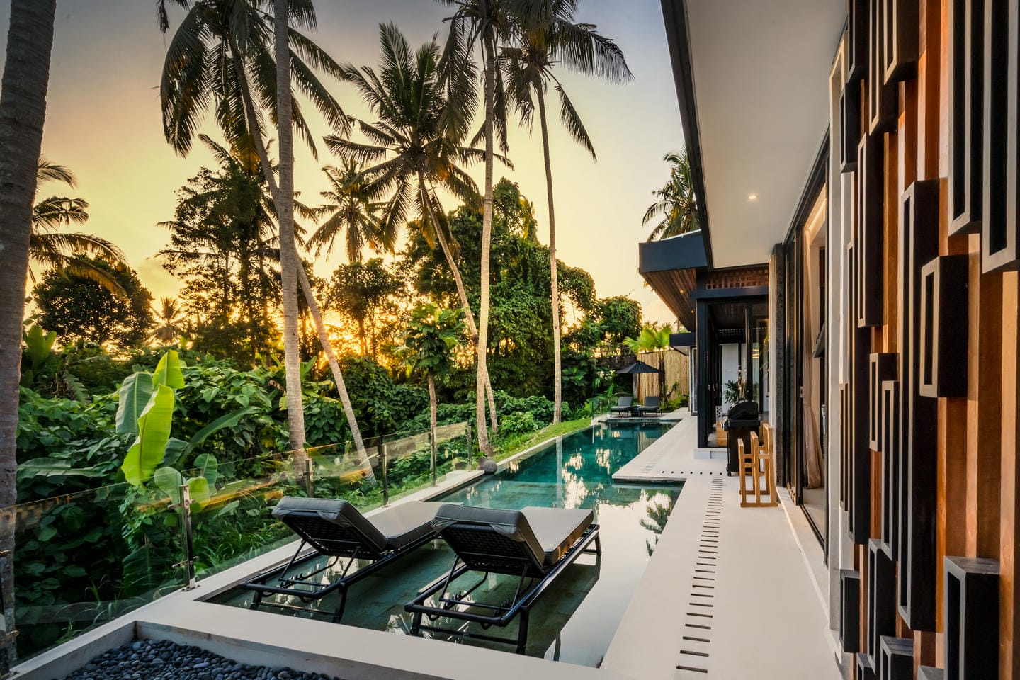 The interior features a modern tropical design with clean architectural lines, large glass sliding doors, and warm wooden accents. Each bedroom is bright and airy, complete with ensuite bathrooms and direct access to the outdoor area. The open-plan living and dining space is enhanced by high wooden ceilings and stylish lighting, creating a cozy yet elegant ambiance.