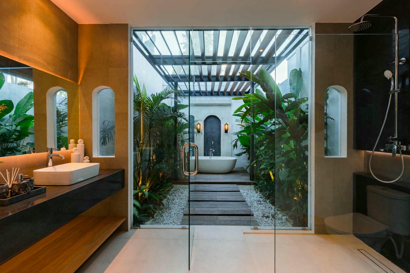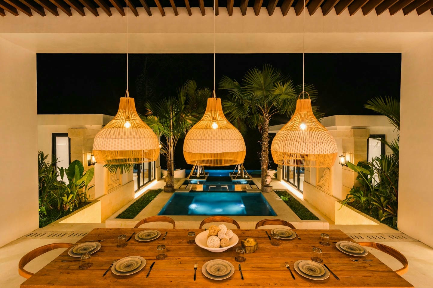 The outdoor area is designed for relaxation and entertaining, featuring a private swimming pool, sunken lounge, and lush garden overlooking a beautiful jungle view, creating a serene, resort-like ambiance.