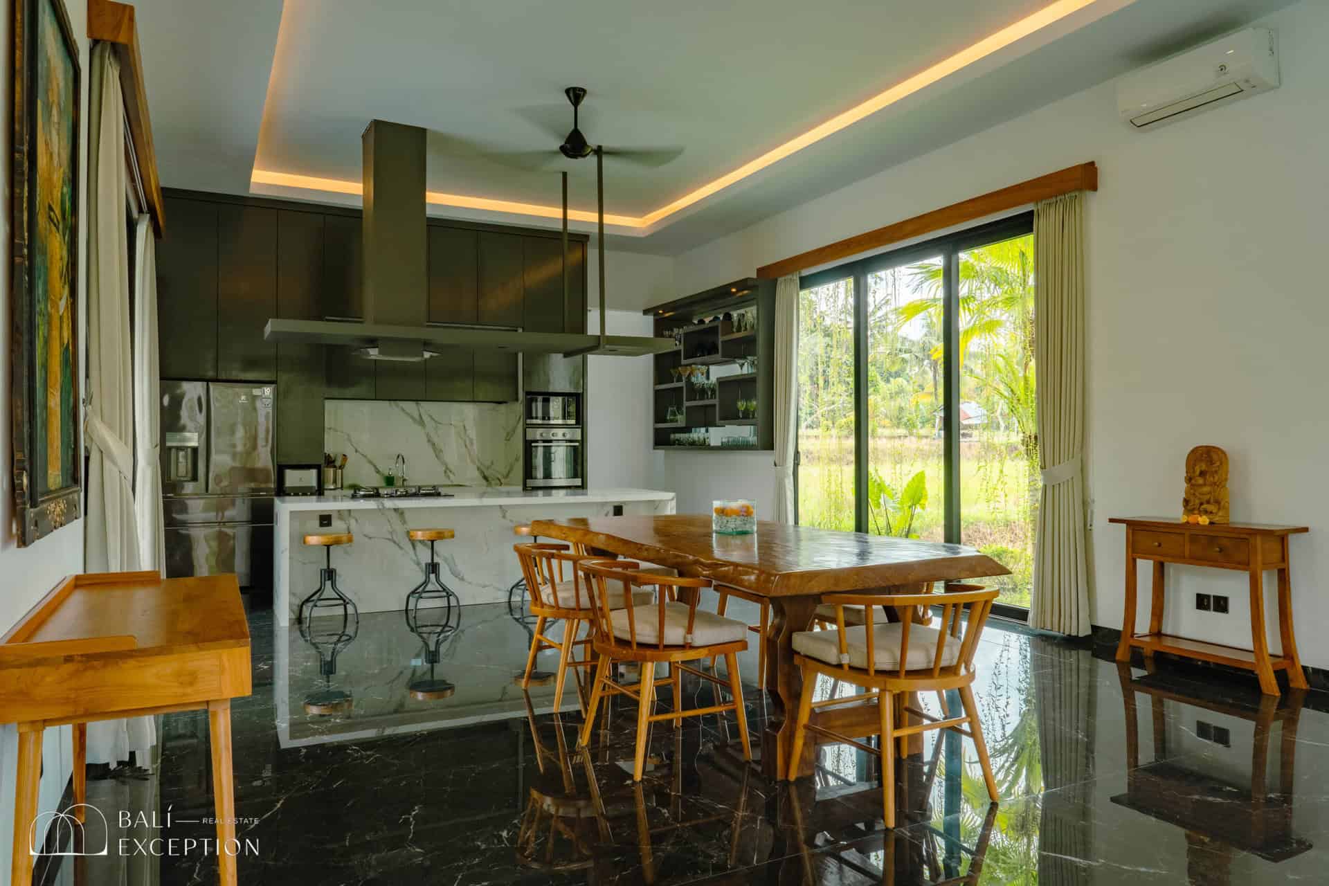 The property includes a large, lockable garage with a workbench and large windows overlooking the rice fields, which could also serve as a studio. It consists of three leased parcels totaling 44 ara. The villa, completed in 2022, meets high standards.