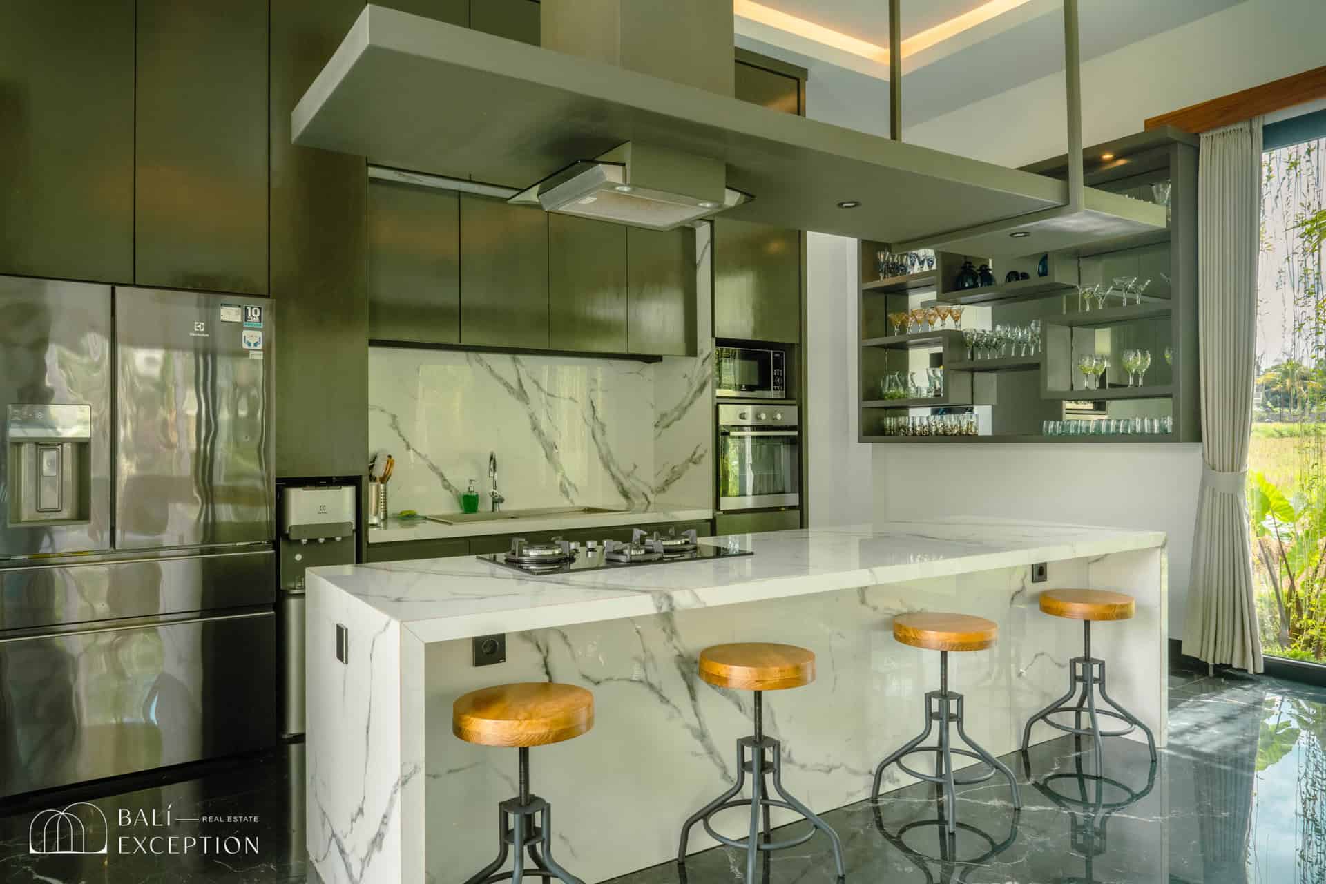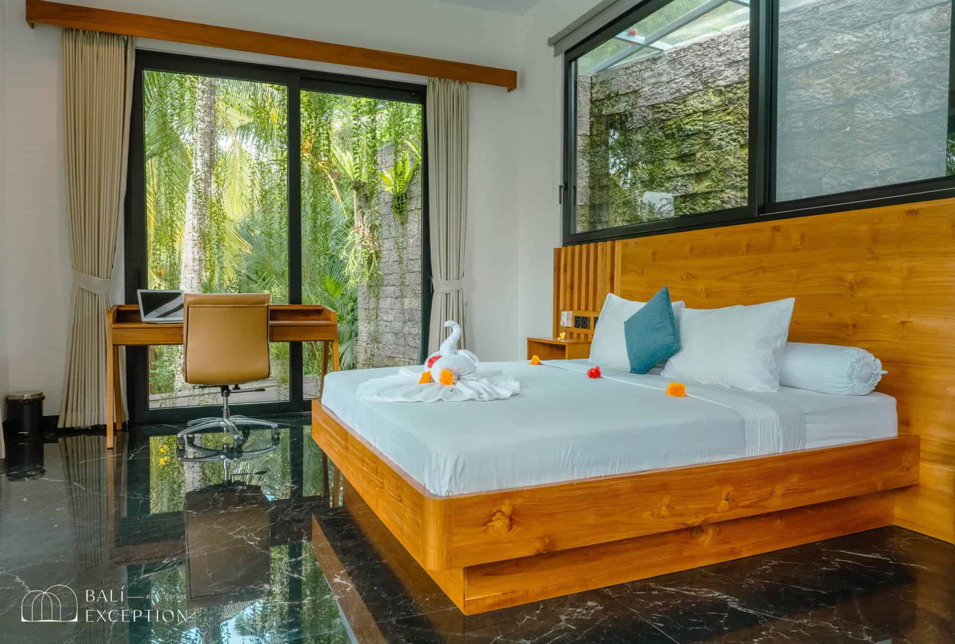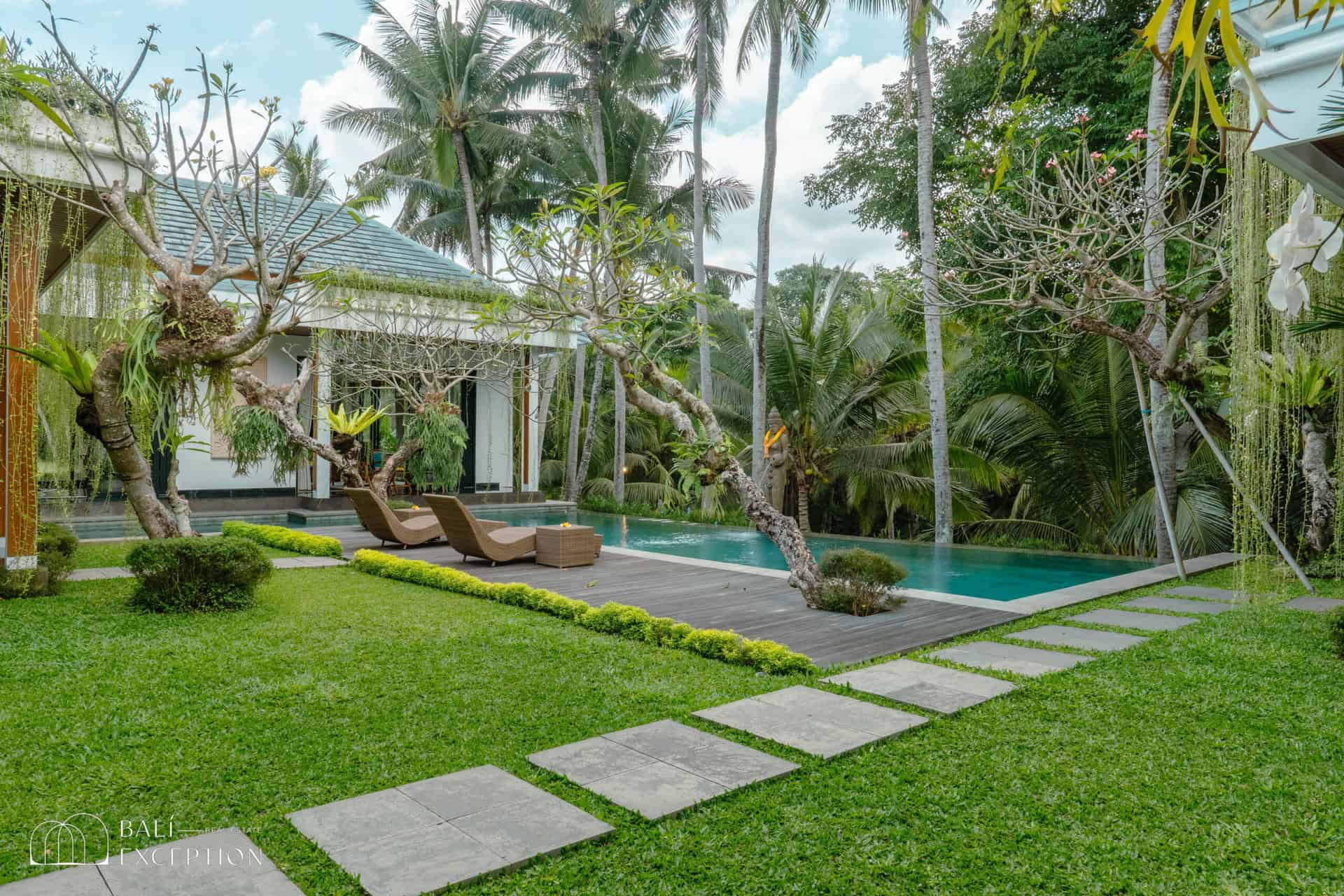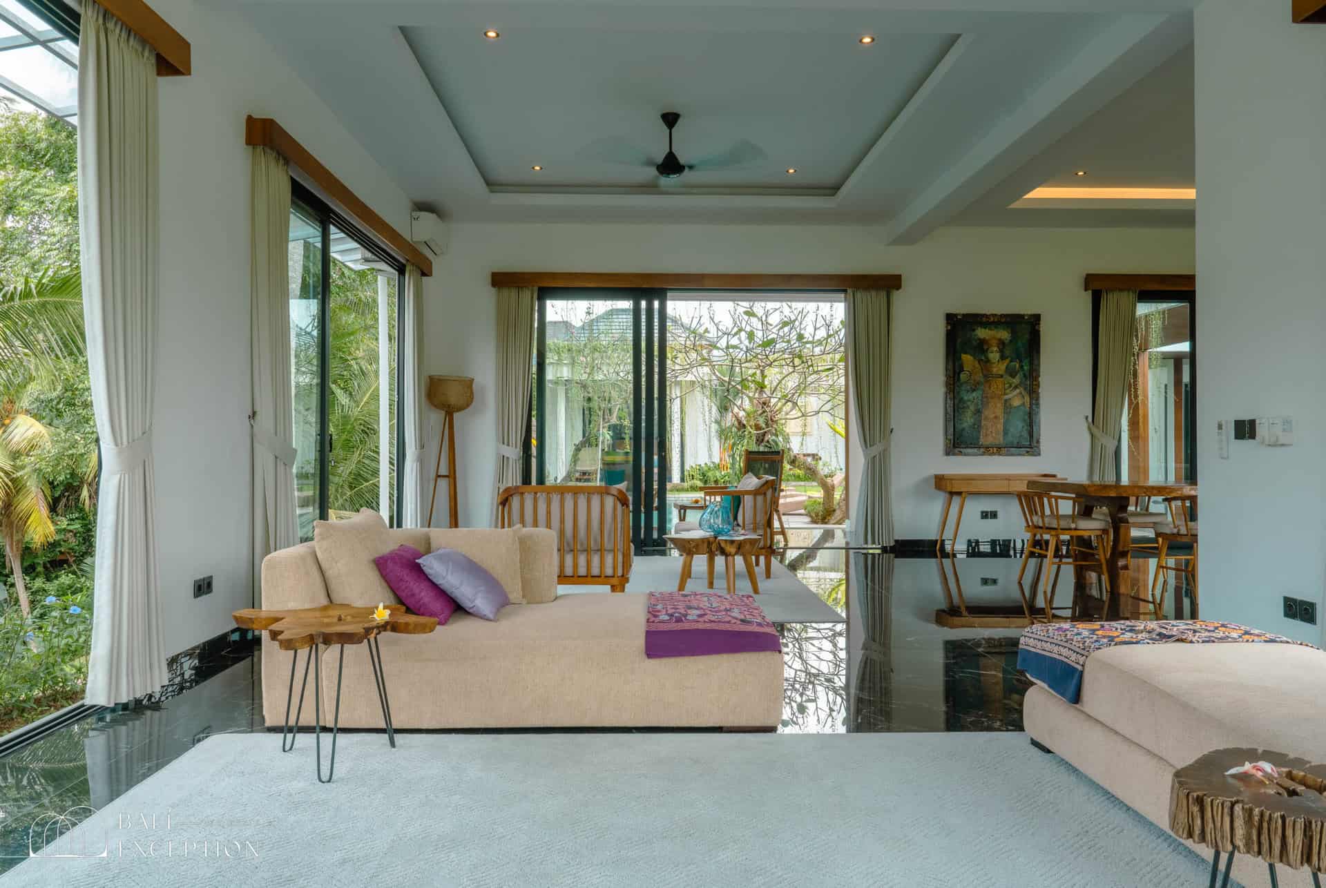 Enter through a Zen door, crossing a Koi pond with a waterfall into a U-shaped courtyard. The bedrooms and principal living area surround a garden courtyard with an infinity saltwater pool. The open-concept kitchen, living room, and den overlook a terraced jungle garden, stream, and rice fields. Each bedroom has an ensuite bathroom, a courtyard view, and a private garden. The modern design complements traditional teak bedroom sets. Enjoy river and jungle views from the living room or watch the changing rice terrace cultivation.