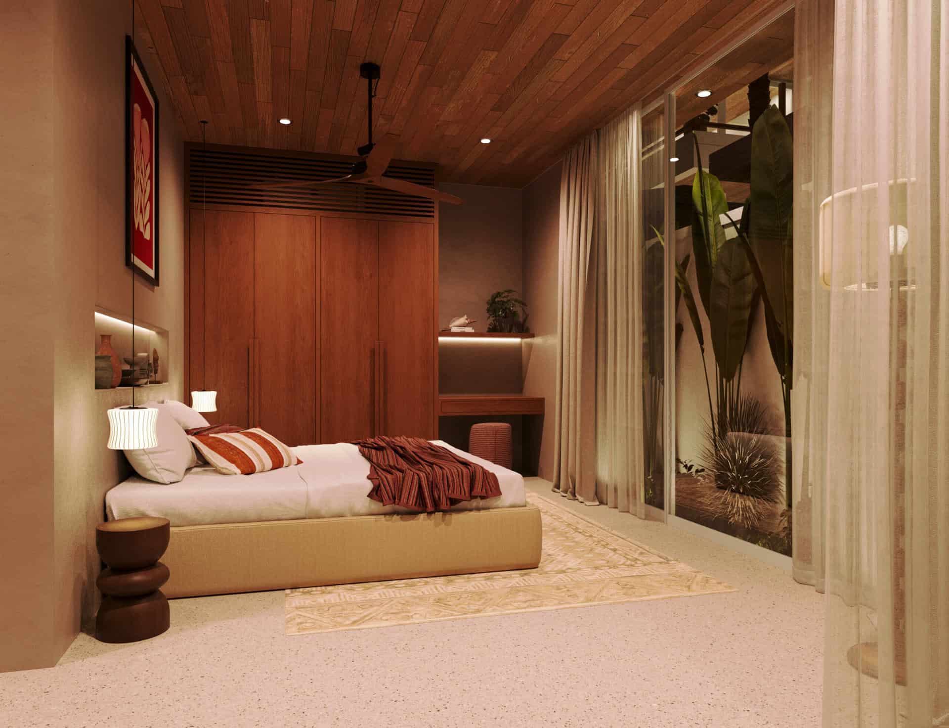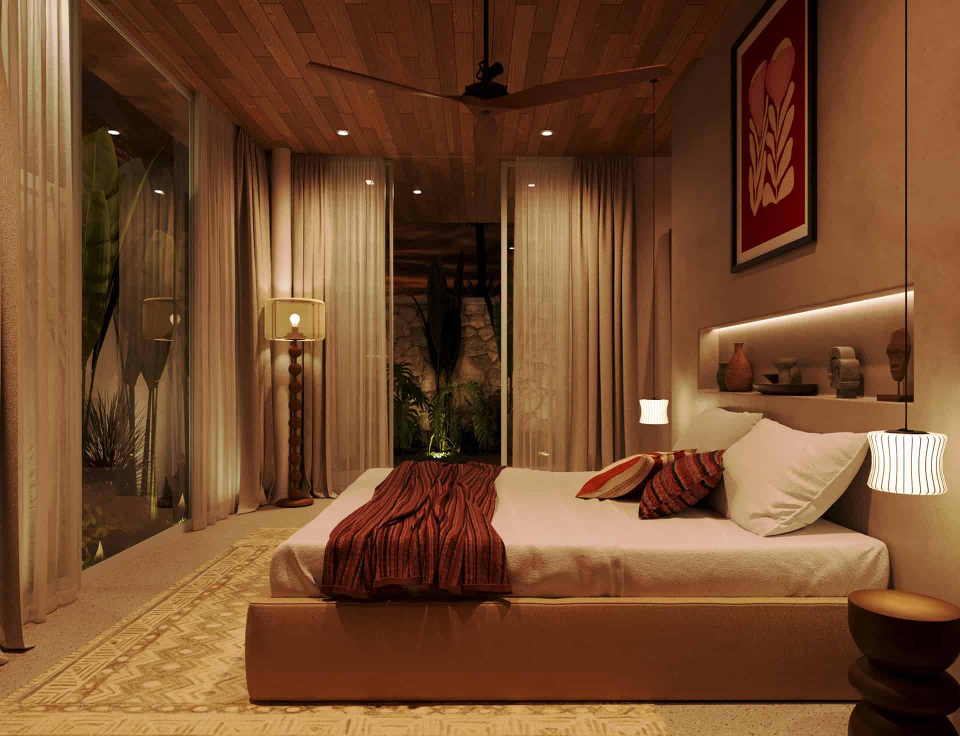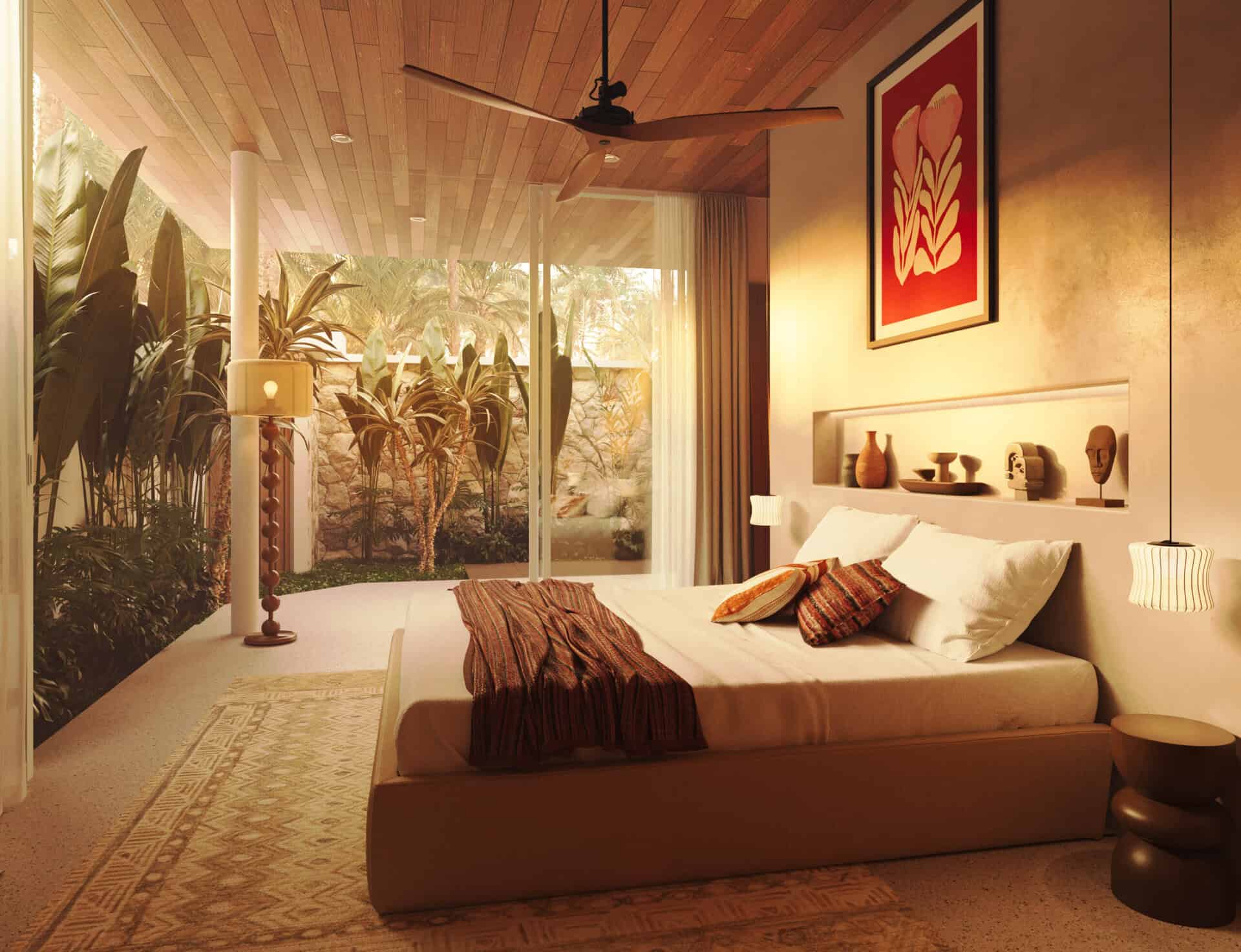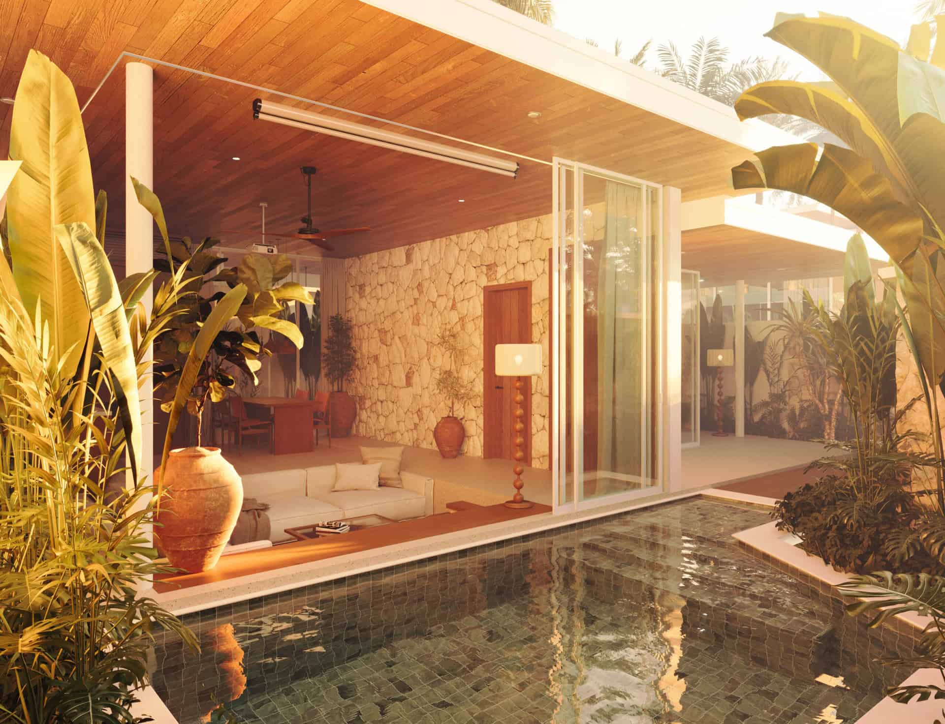 - Comfortable Living: The master bedroom includes built-in wardrobes and an ensuite bathroom. The living space opens directly to the pool through full glass doors.