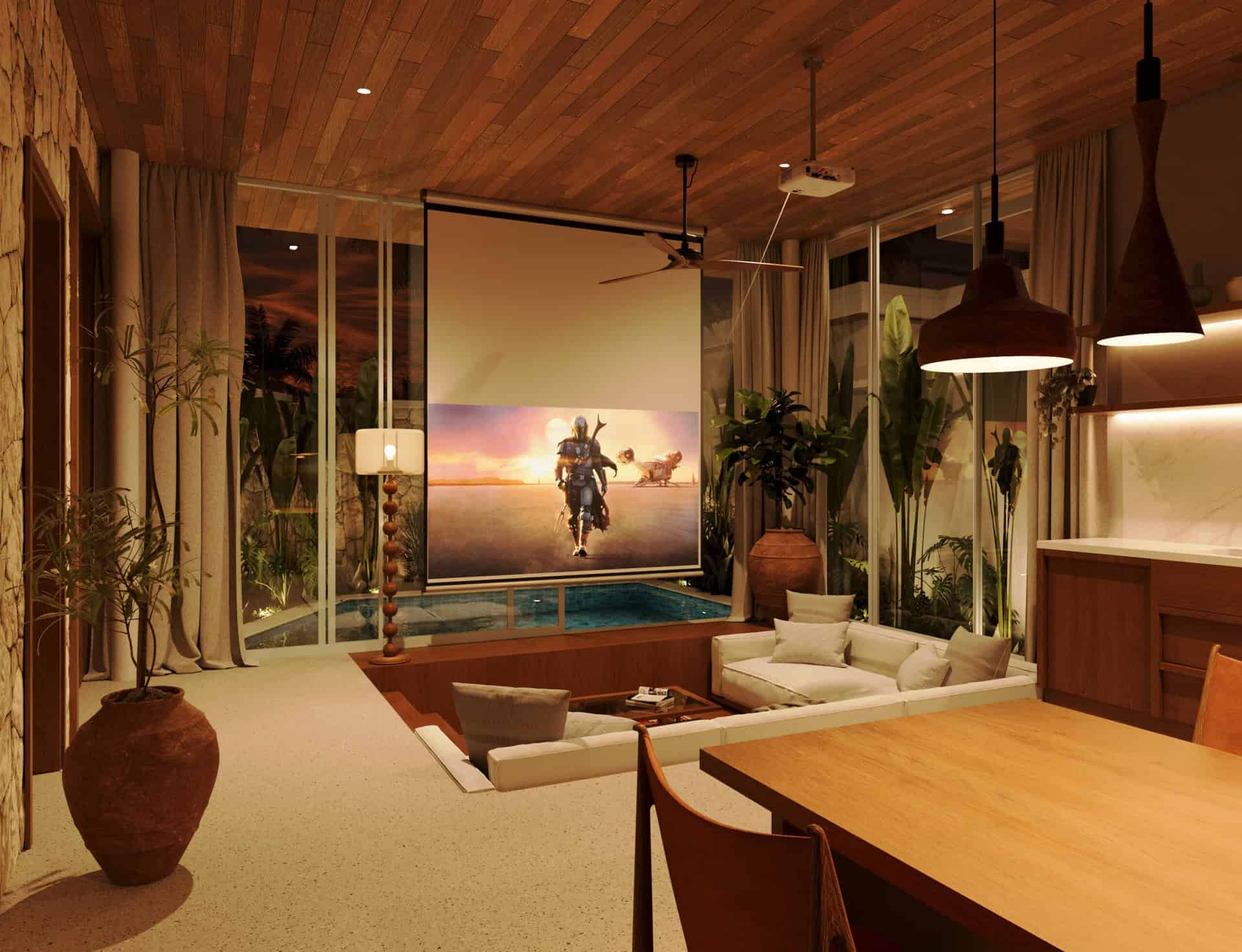 - Elegant Design: Features a sunken seating area, floor-to-ceiling windows with blackout curtains, and a full-size projector screen. The open-concept design integrates the living area with the kitchen, showcasing elegant wooden built-in storage and a concealed refrigerator.