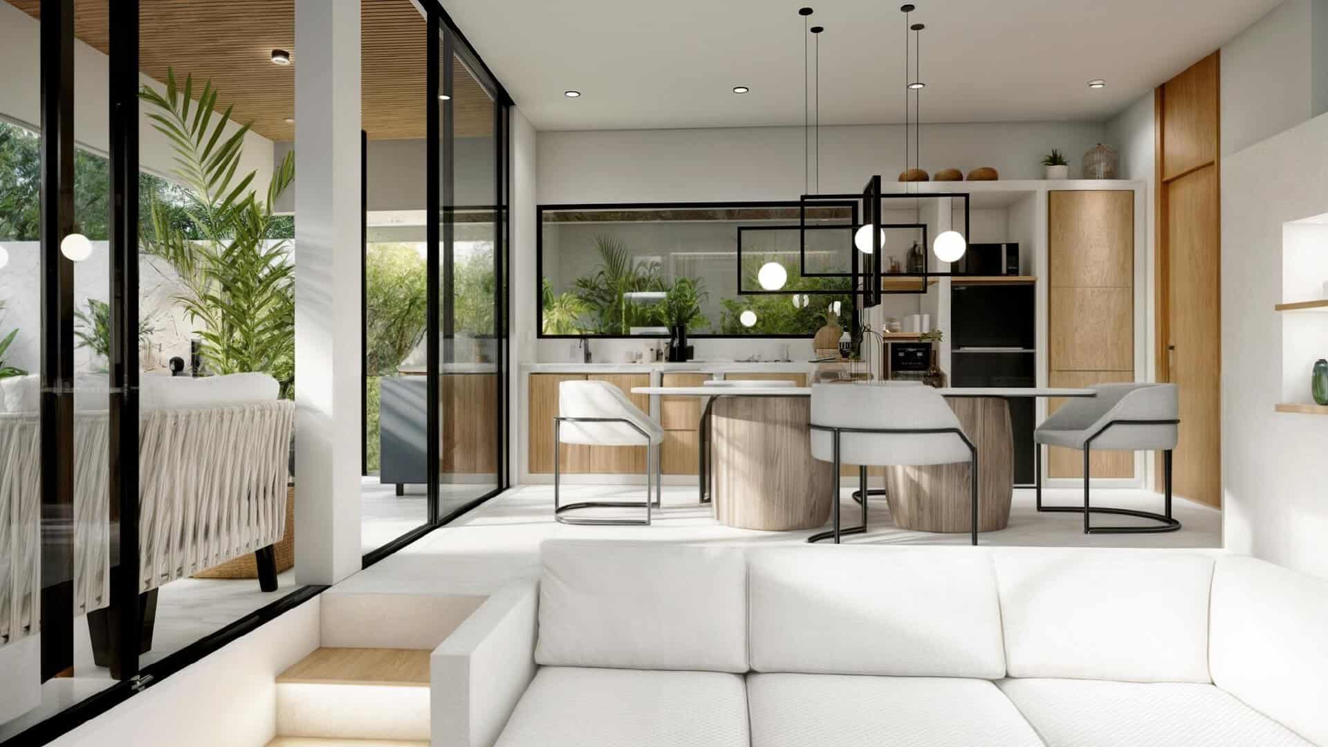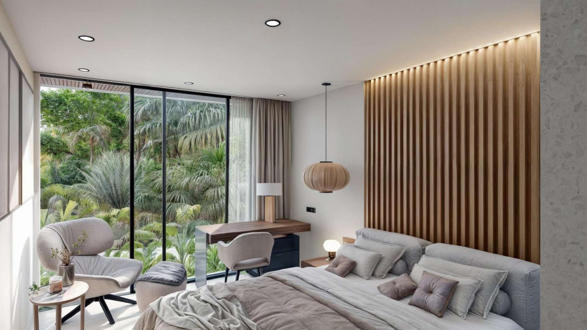 Designed with a blend of modern minimalist sophistication, this villa spans 125 square meters of land and boasts a 110 square meter build size. It features two cozy bedrooms with ensuite bathrooms across two stories, a semi-open living room that can transition between enclosed and open configurations, a fully equipped kitchen, and a refreshing 21 square meter swimming pool with sunbeds—perfect for relaxation.