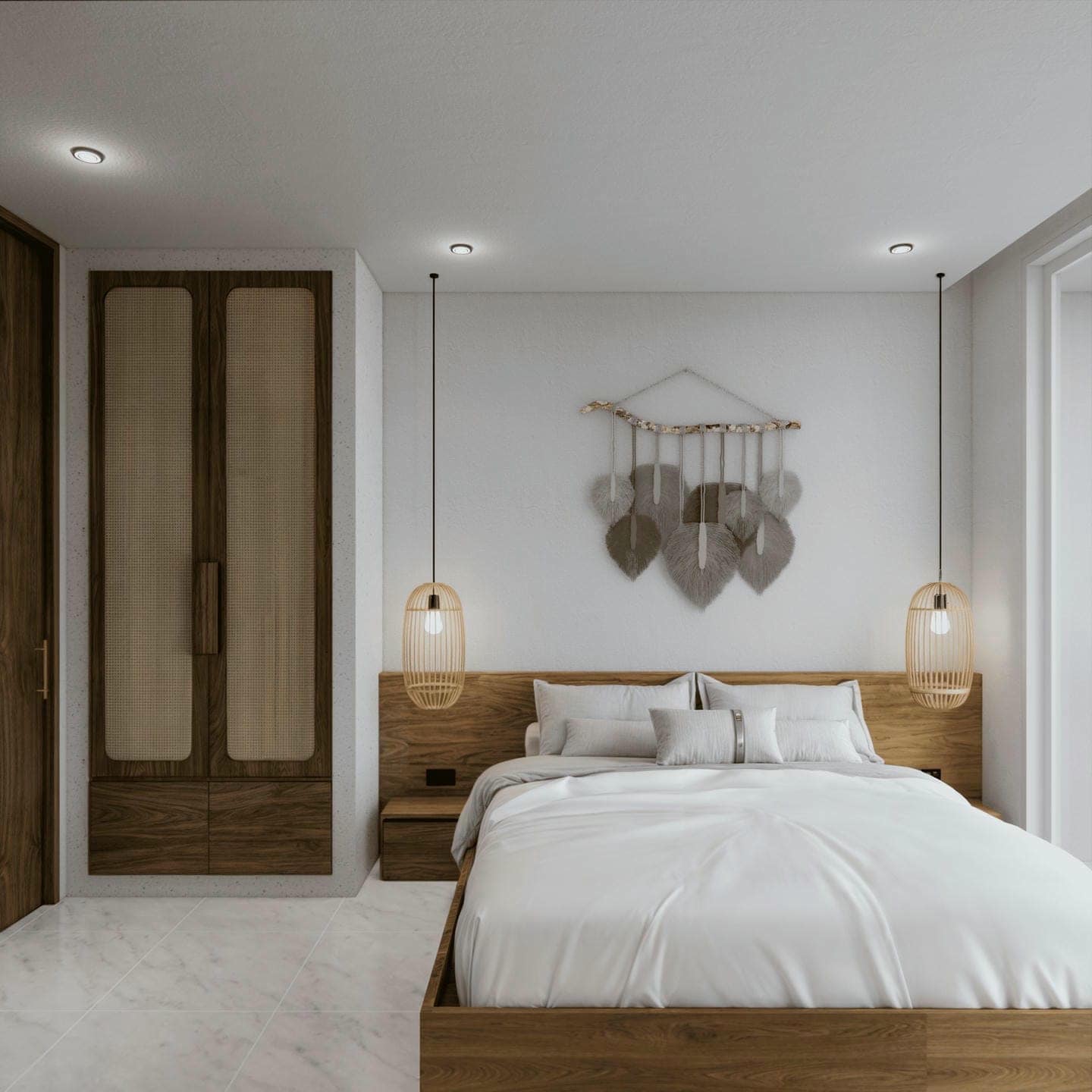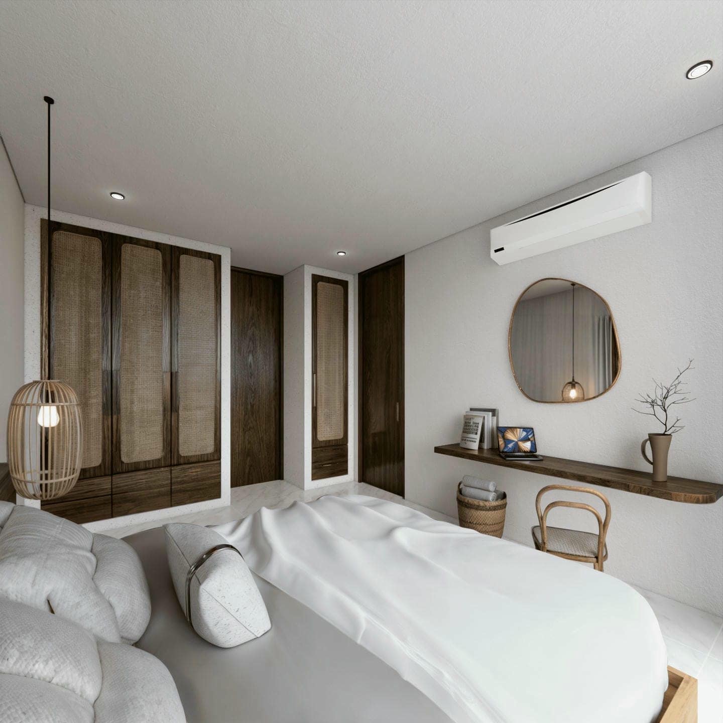 This villa features 2 bedrooms, each with an ensuite bathroom and a balcony. The open-plan living area is complete with a sunken sofa that invites relaxation. The kitchen includes an island table perfect for show-cooking, while the adjacent dining table offers beautiful green views of the back garden, which can also be enjoyed from the bedroom balconies.