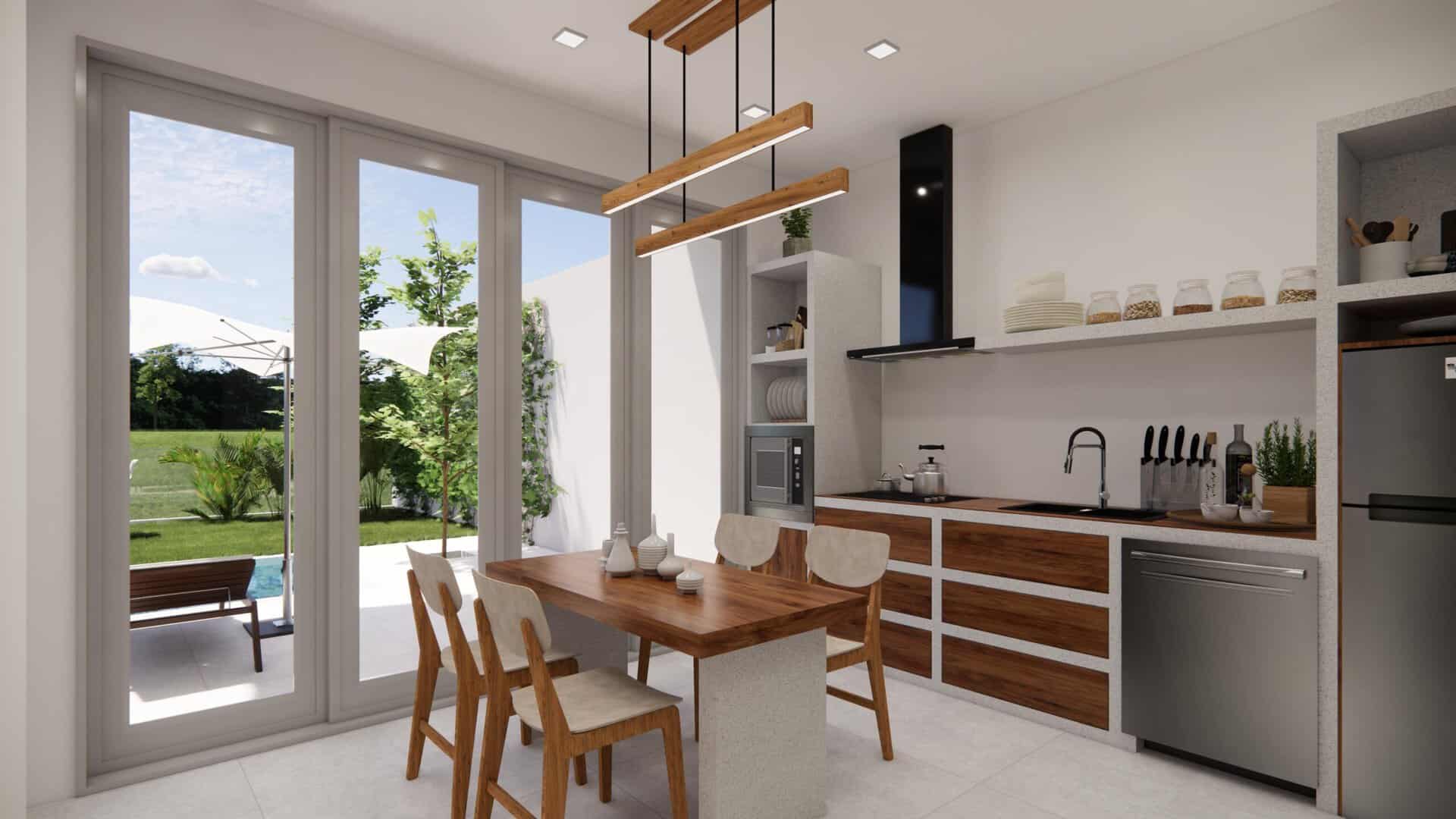 Choose from two types of villas: a 2-bedroom option with ensuite bathrooms or a more spacious 3-bedroom version, also with ensuite bathrooms. Each villa is semi-furnished and features a unique sunken living area, providing a cozy and stylish space for relaxation. The fully equipped kitchen boasts modern amenities and elegant wooden furniture, creating a warm and inviting atmosphere.