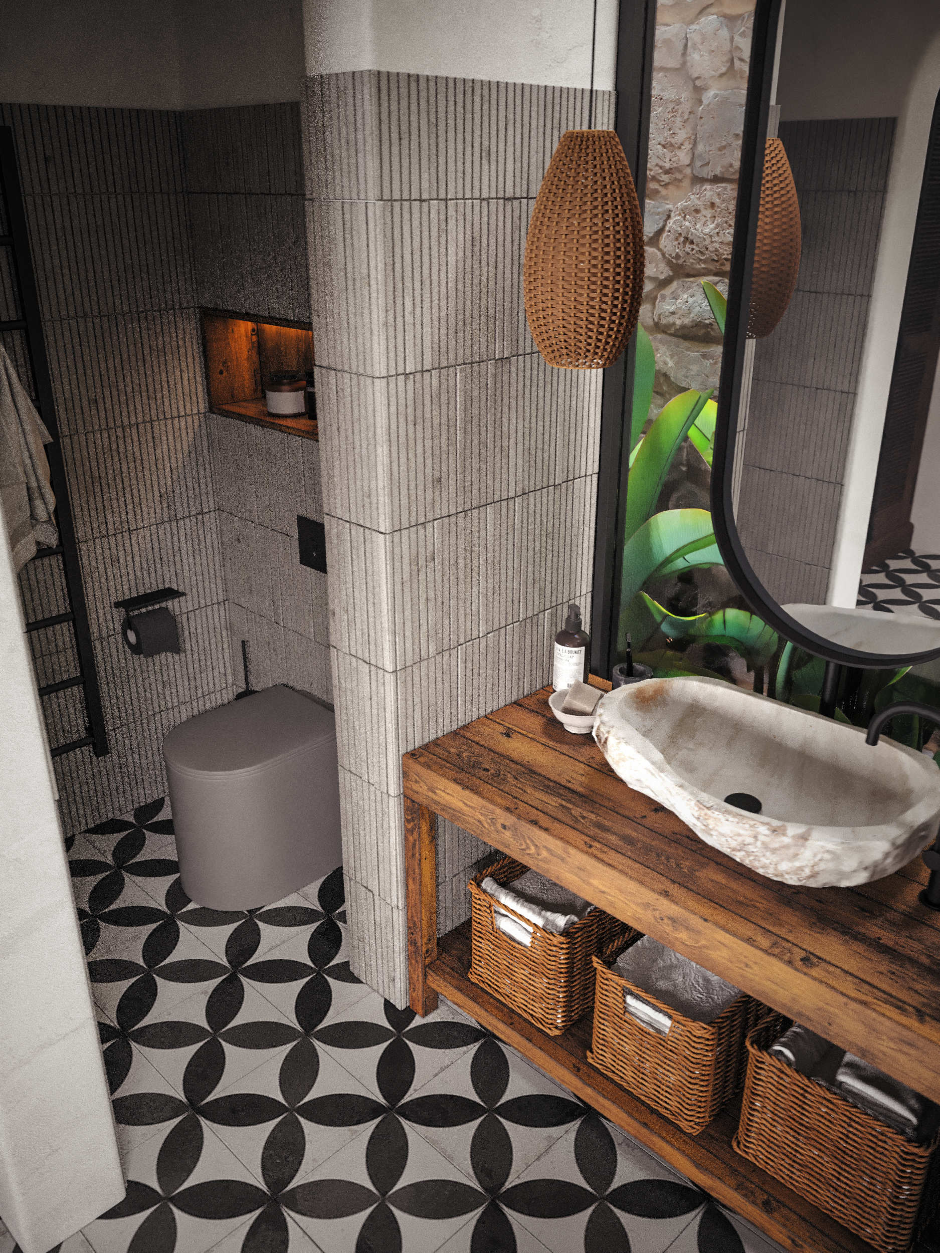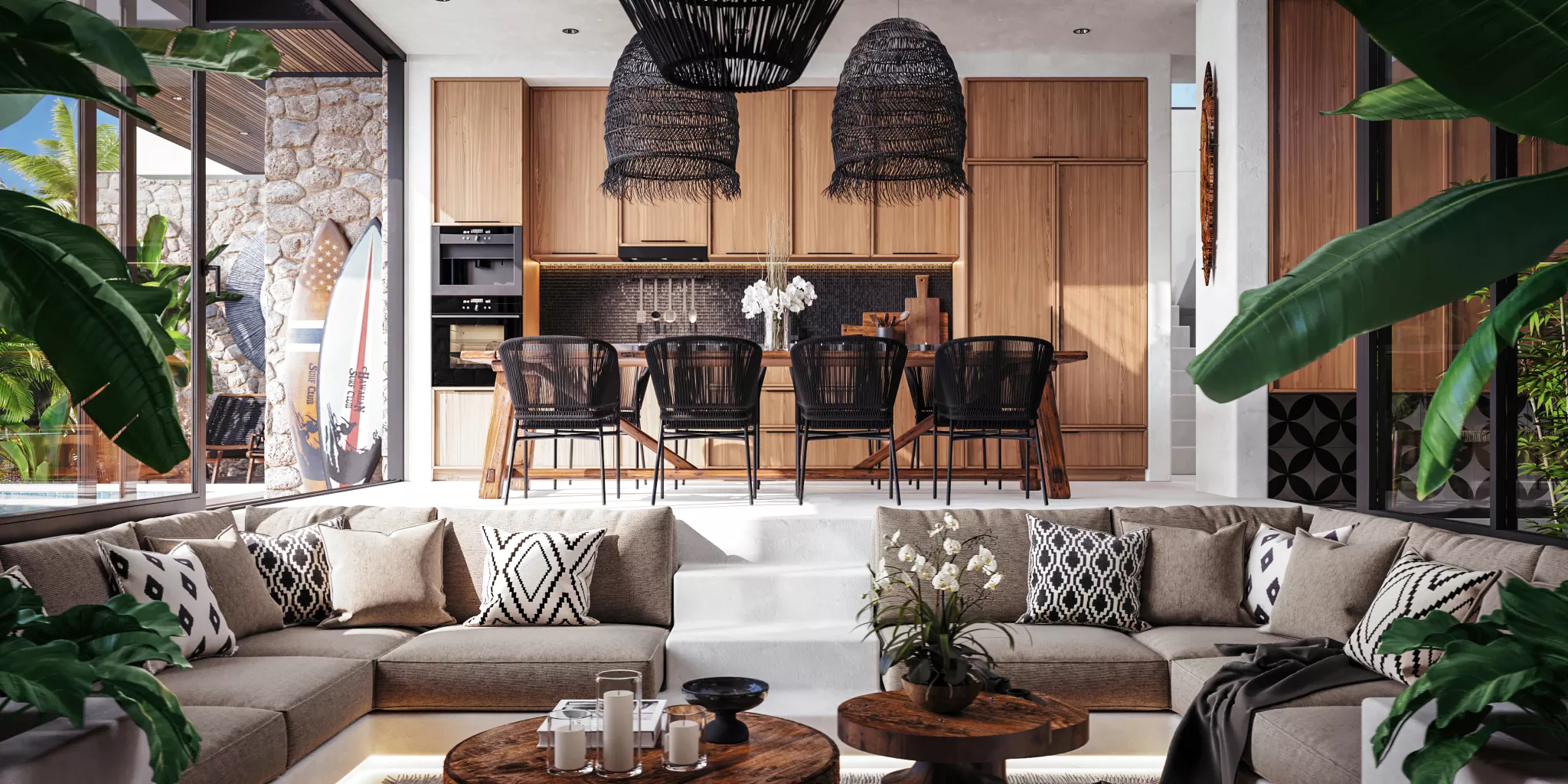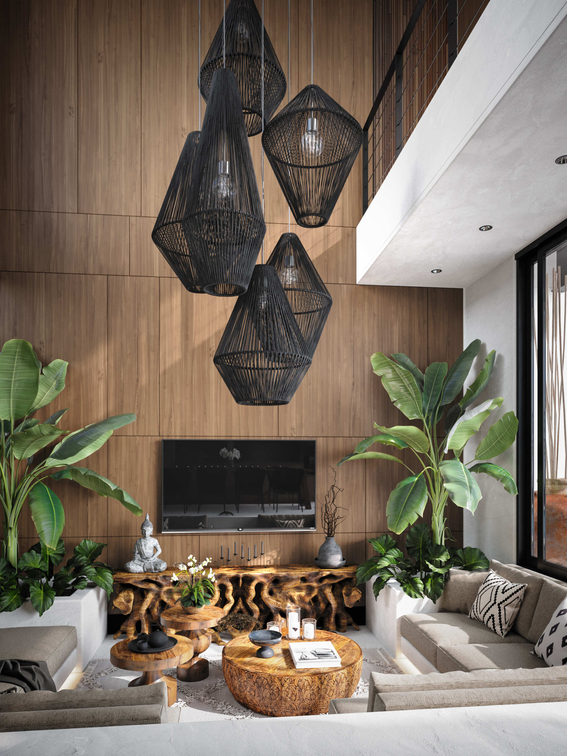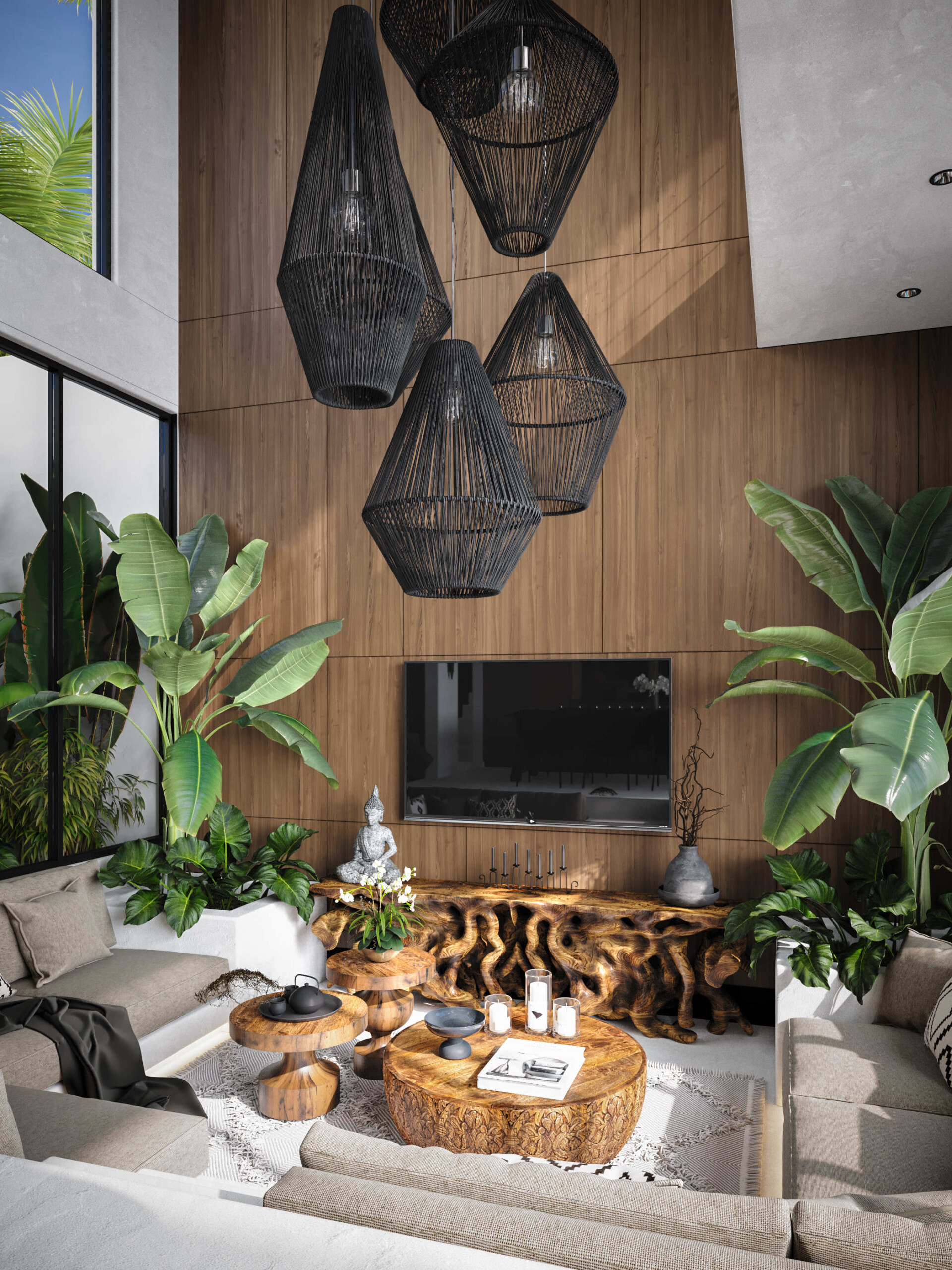 The villa’s design embraces a modern tropical aesthetic, featuring Bali vibes in its interior design. Spanning 205 sqm in building size and 205 sqm in land size, this haven boasts 4 bedrooms, 5 bathrooms, along with a wardrobe area. The well-designed layout includes a spacious living room, a fully-equipped kitchen, a dining area, and a convenient powder room/guest toilet.