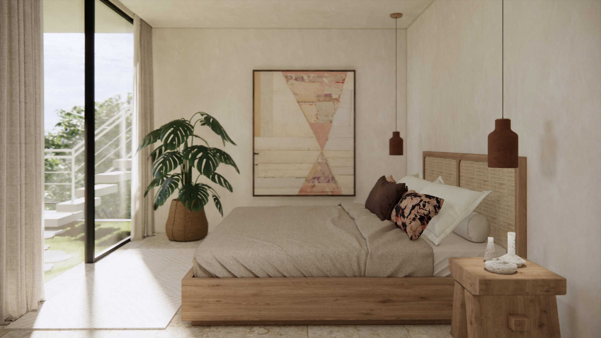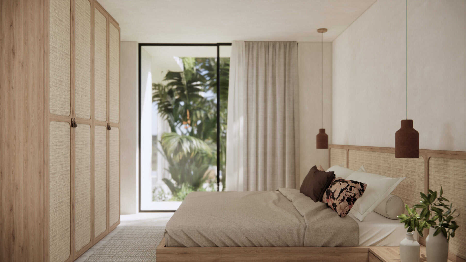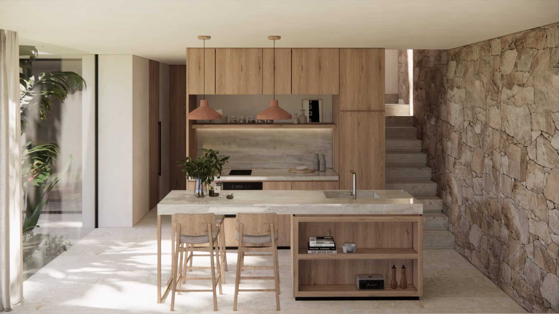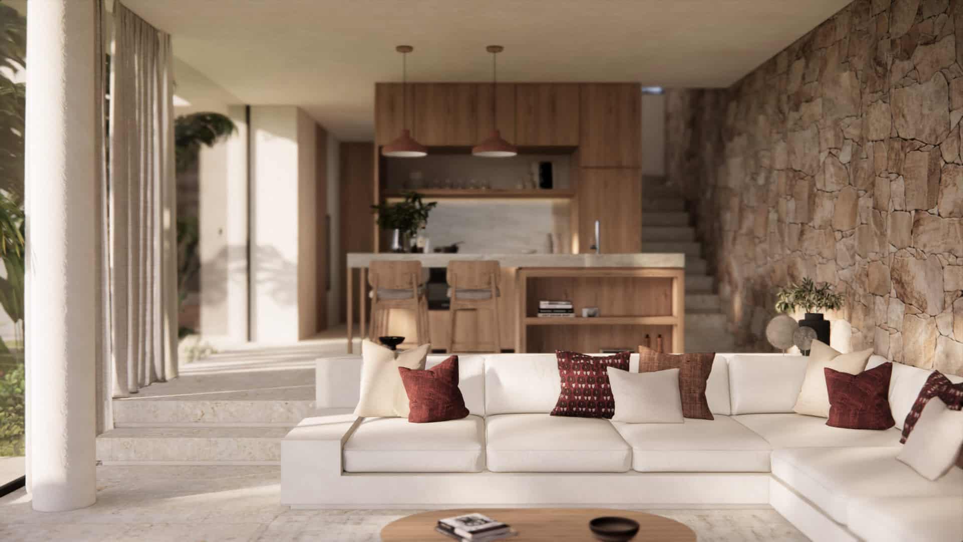 The villa has 3 well-appointed bedrooms, one on the ground floor and 2 on the second floor. All bedrooms benefit from a spacious layout, built-in wardrobes and luxurious bathrooms. The master bedroom has its own private balcony and ocean views. Entering the villa from your private parking space, you’ll be greeted by a spacious living area, comprising a boxed-in lounge, separate dining room and open-plan kitchen with modern appliances, marble worktops and plenty of counter space. Large picture windows provide a seamless transition between the indoor and outdoor spaces, flooding the living room with natural light.