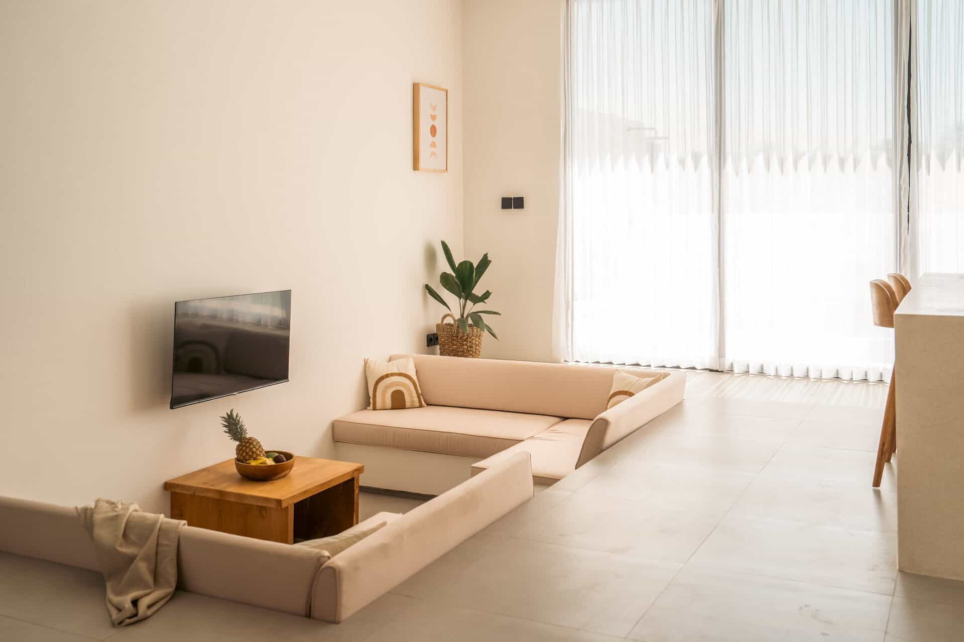 Spanning 73 sqm on a 110 sqm plot, the villa is fully furnished and features a spacious en-suite bathroom. The sunken living area with high ceiling windows creates an inviting, airy atmosphere, while the fully equipped kitchen caters to all your culinary needs.