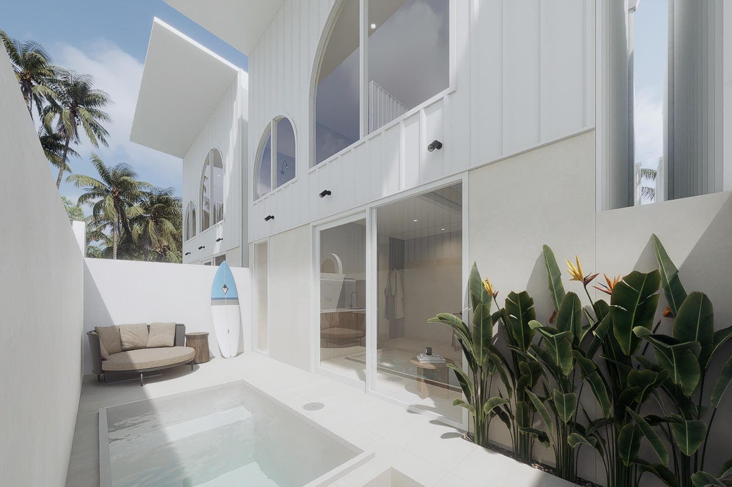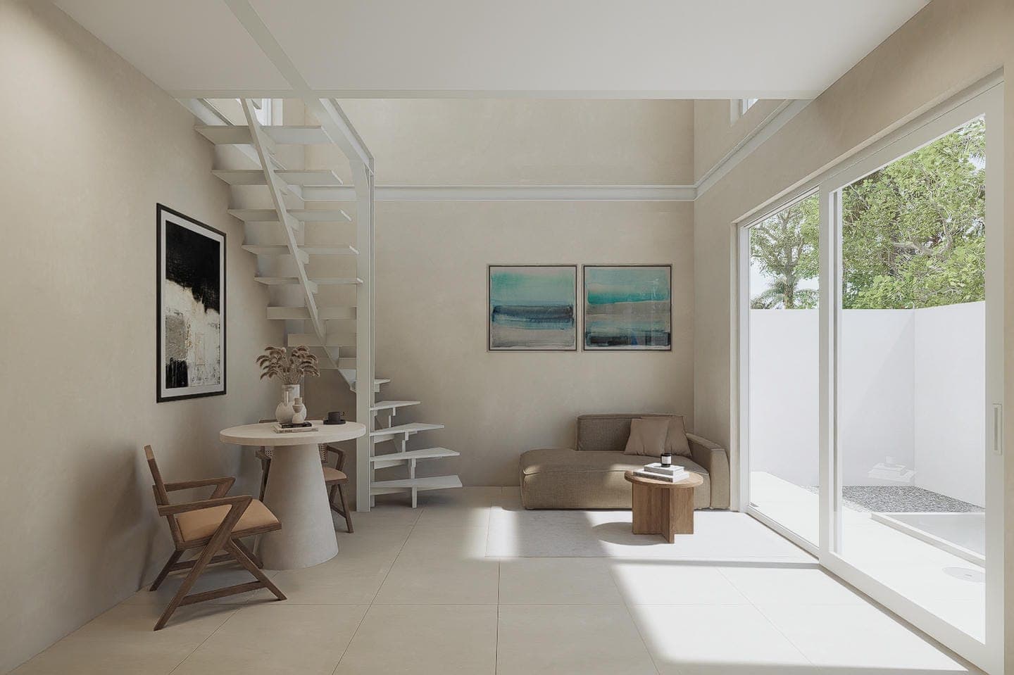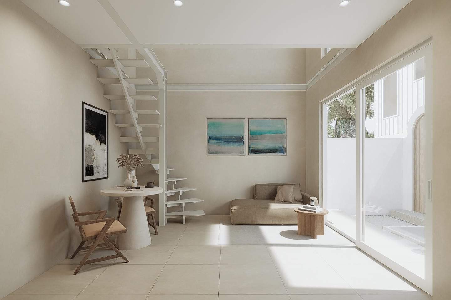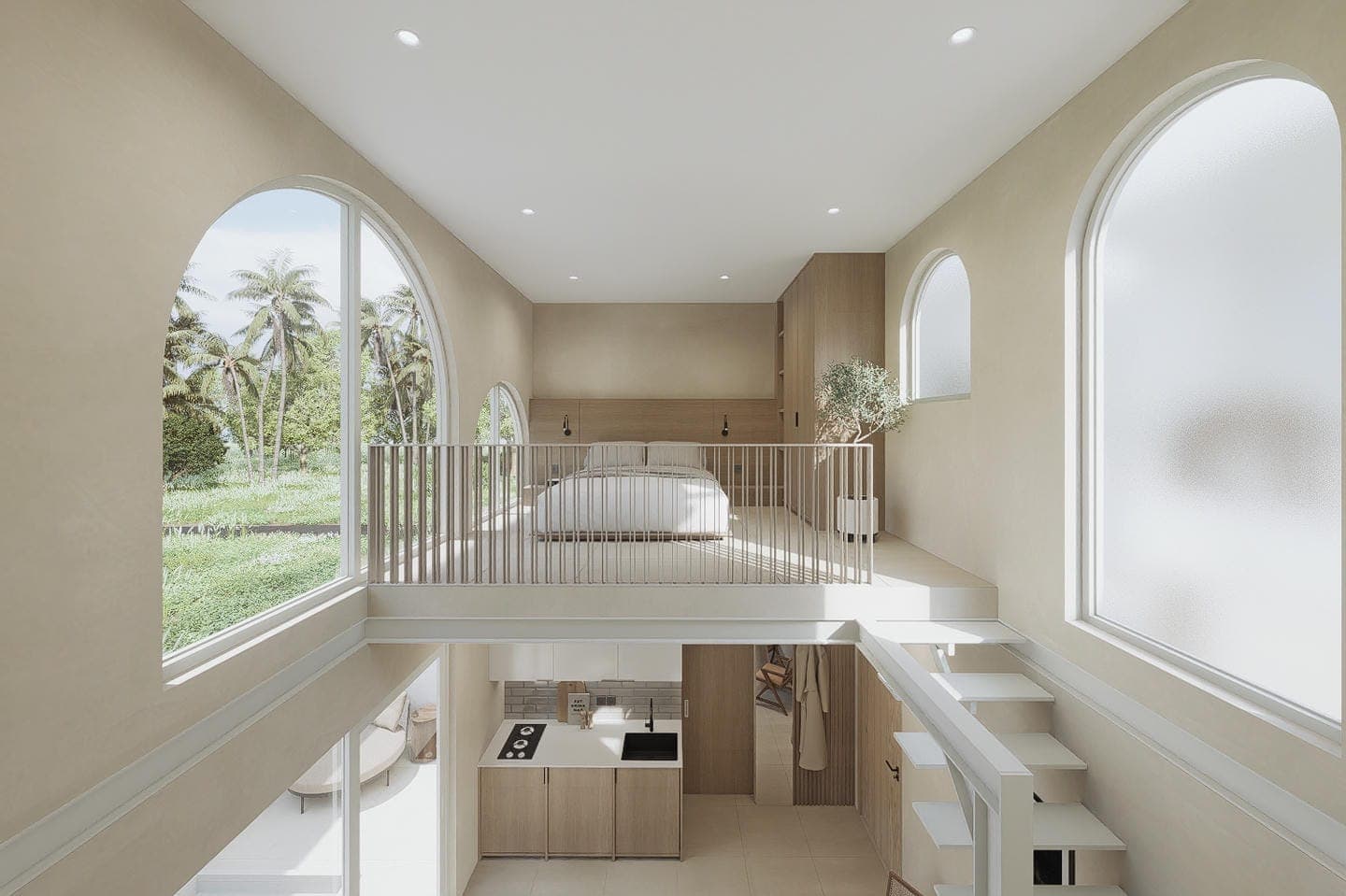 This stunning villa is located in Bingin , Uluwatu, renowned for its lively atmosphere, popular cafes, restaurants, and just a quick 5-minute motorbike ride to the beach and the center of Bingin. Featuring a sleek modern design with a clean white aesthetic, the villa offers a cozy mezzanine 1-bedroom, 1-bathroom layout, an inviting living room and a fully equipped kitchen.