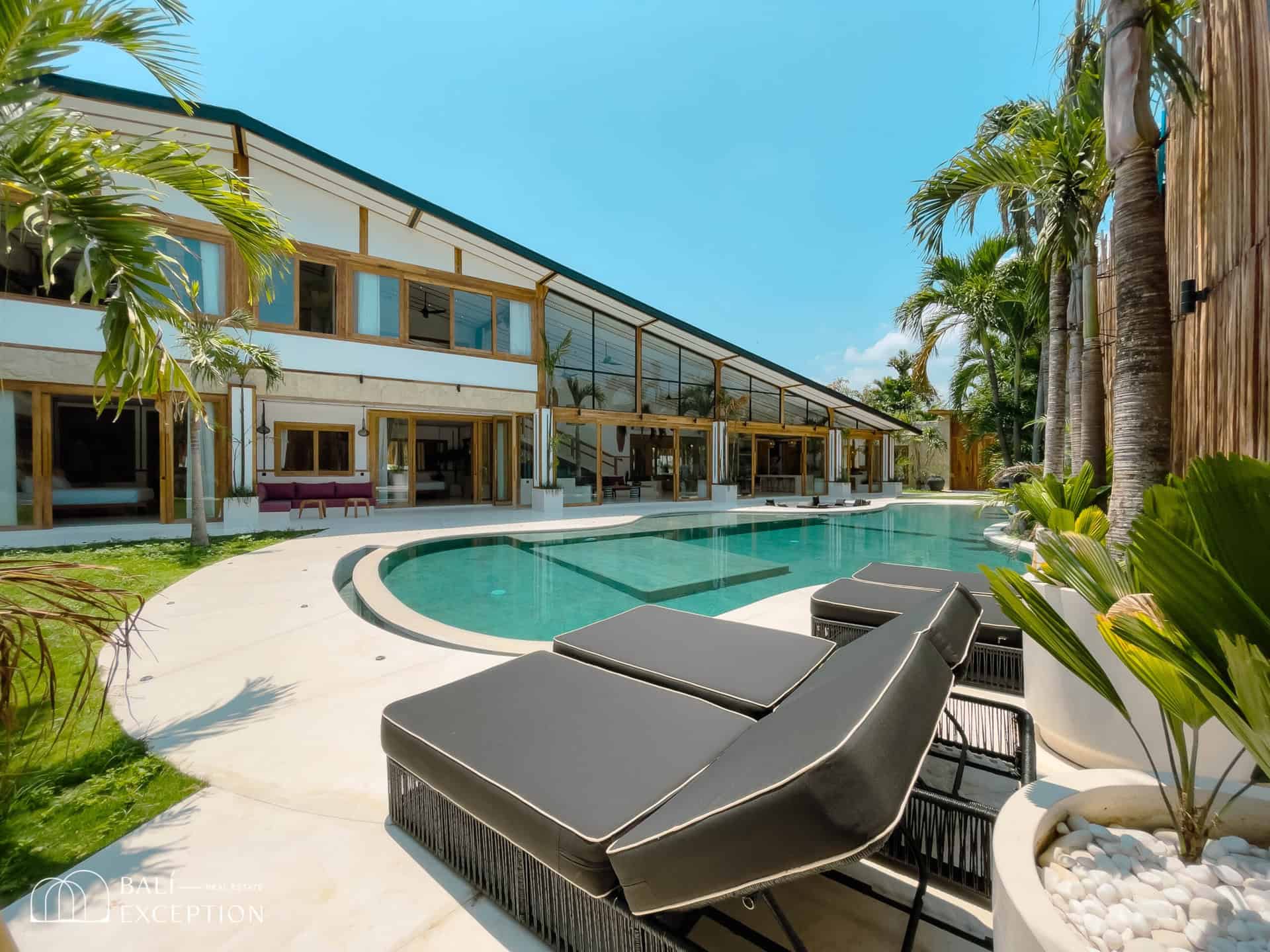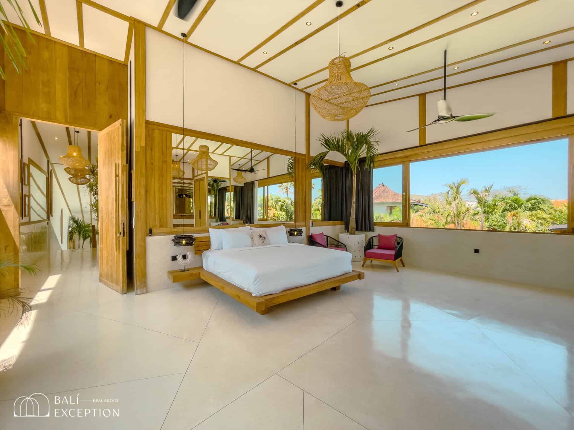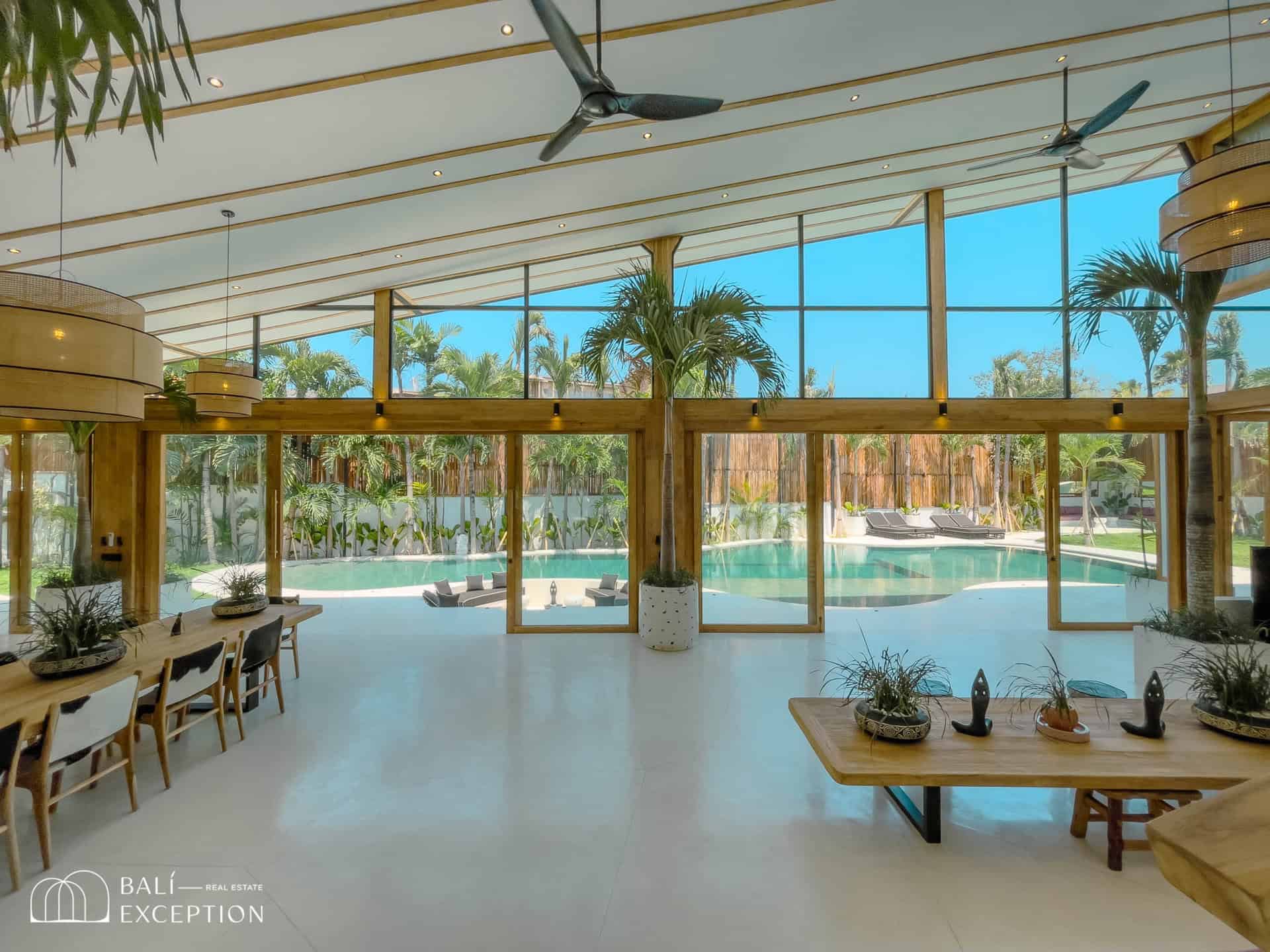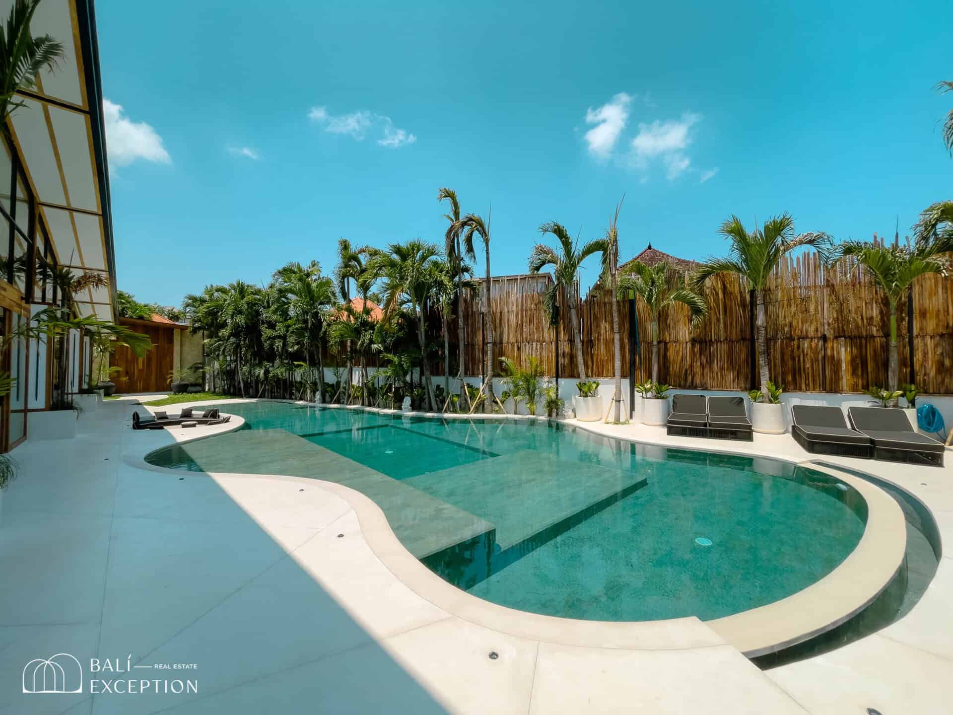 The large pool, with varying depths designed for swimming, relaxing, or playing, is a standout feature. Surrounded by an expansive garden, the outdoor area invites you to enjoy Bali’s sunny days in peace. The property is located in the center of Umalas, close to schools and activities. Everything is built around the villa, ensuring complete tranquility with no future noise disturbances.