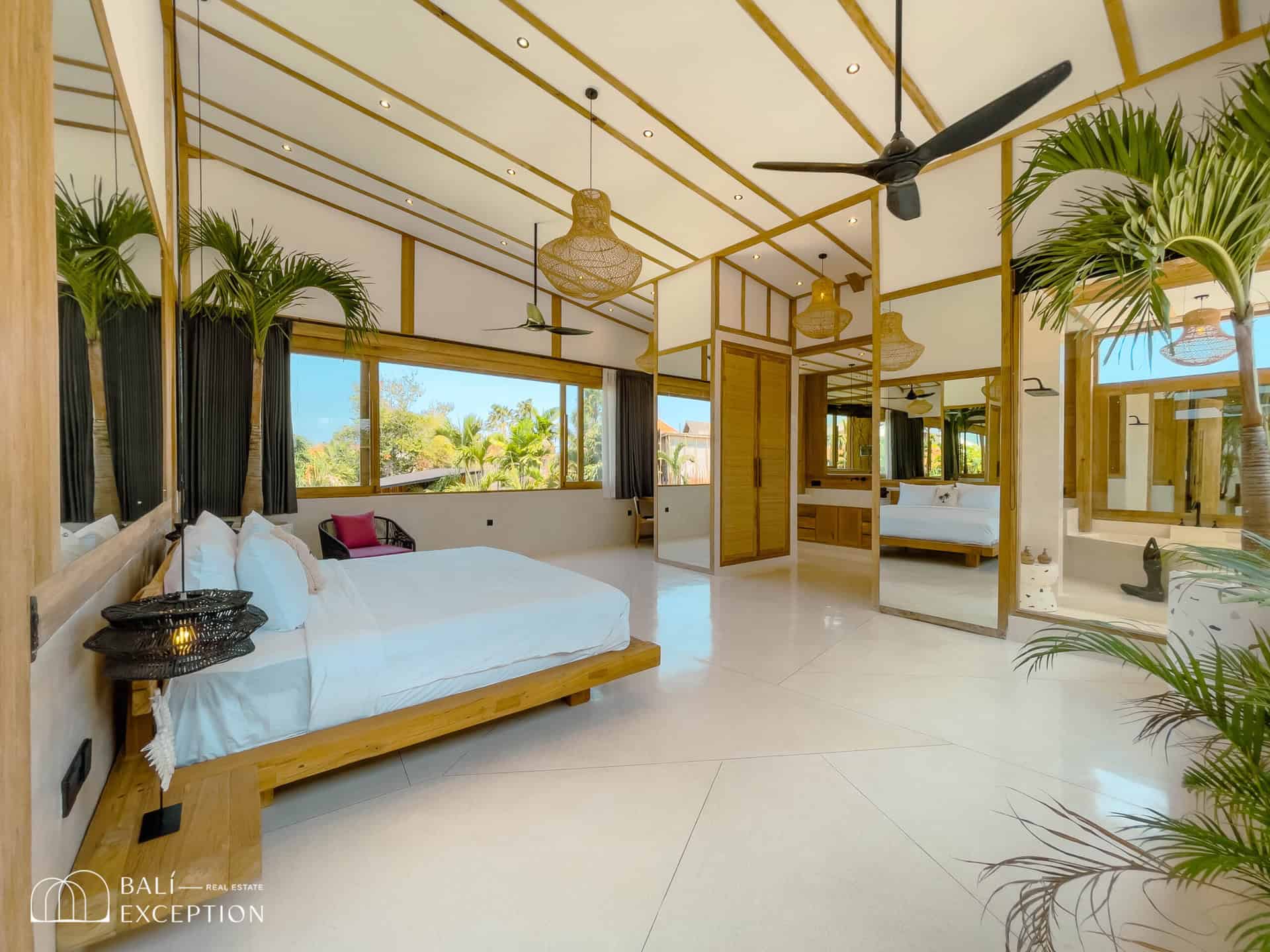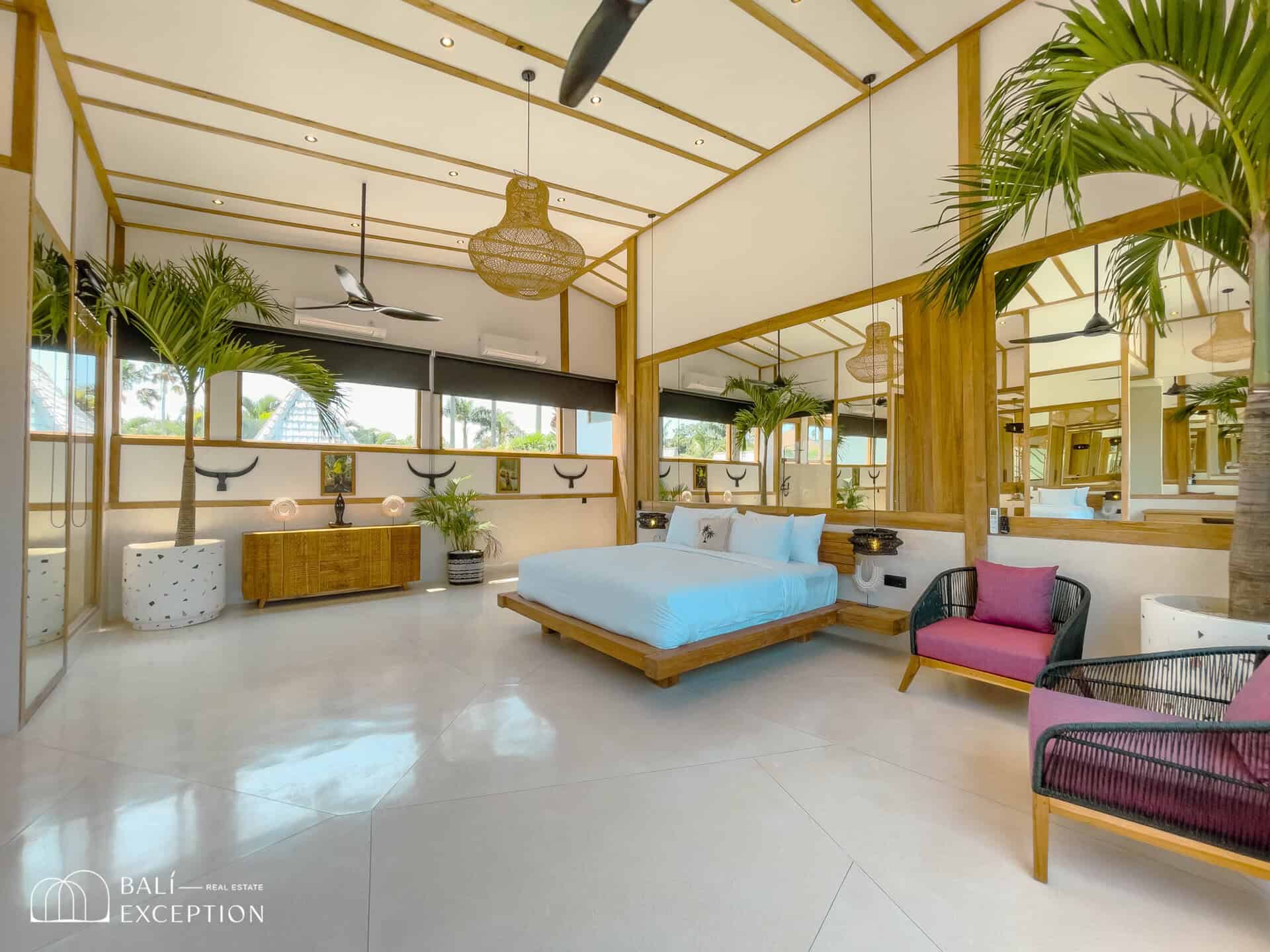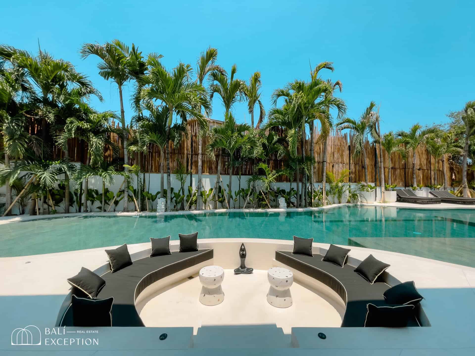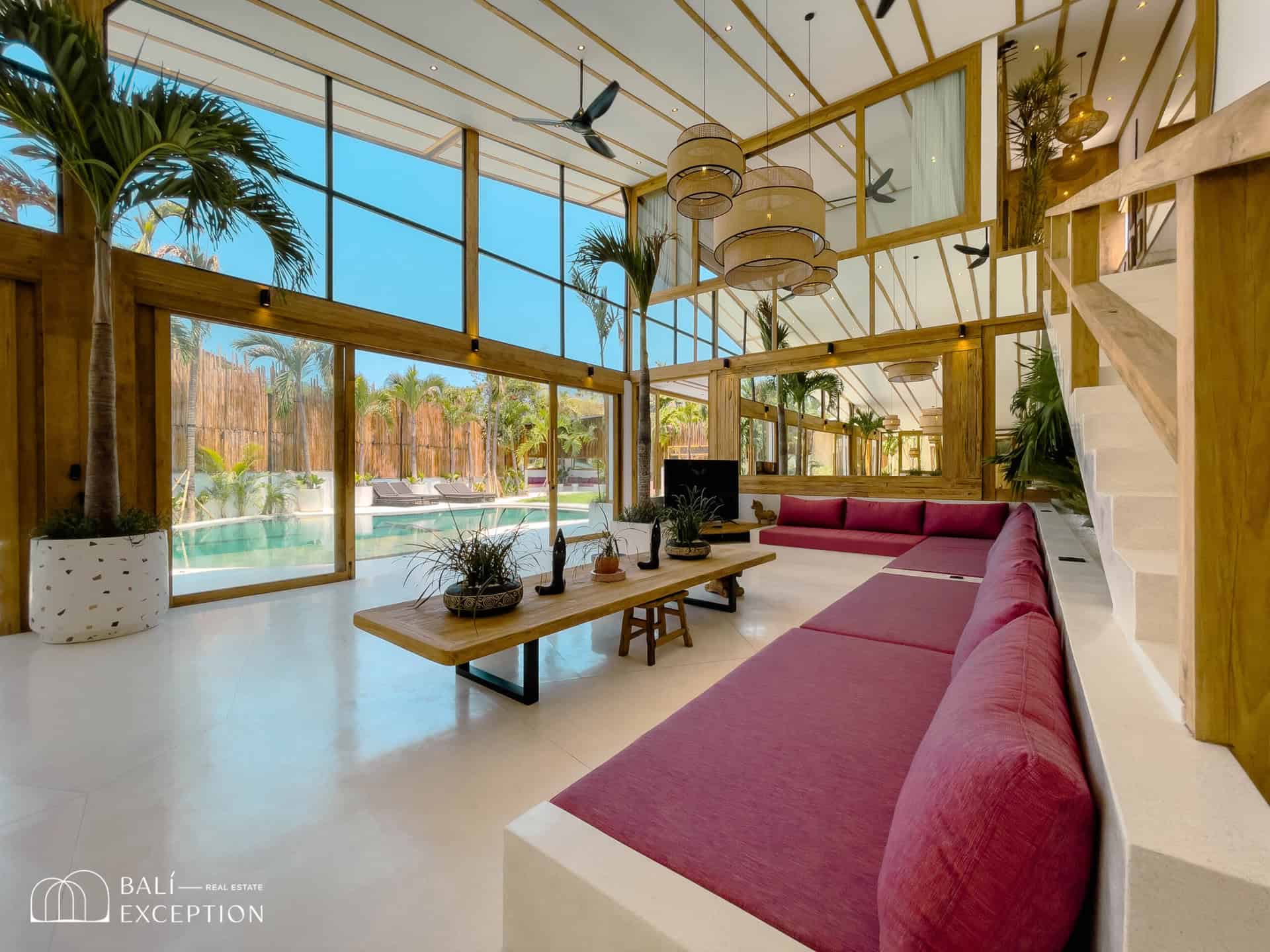 The large pool, with varying depths designed for swimming, relaxing, or playing, is a standout feature. Surrounded by an expansive garden, the outdoor area invites you to enjoy Bali’s sunny days in peace. The property is located in the center of Umalas, close to schools and activities. Everything is built around the villa, ensuring complete tranquility with no future noise disturbances.