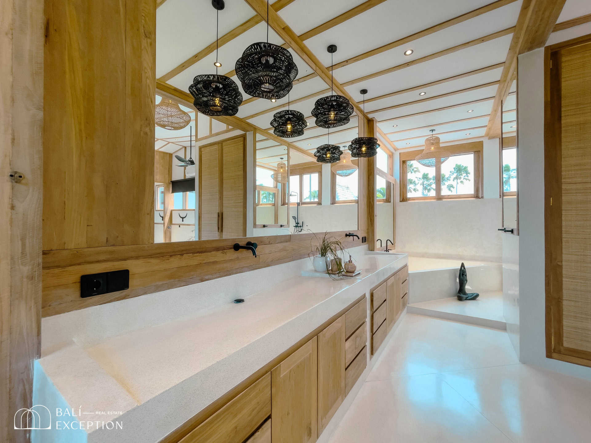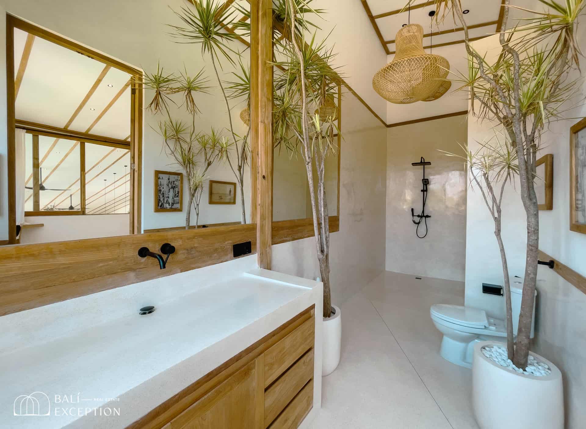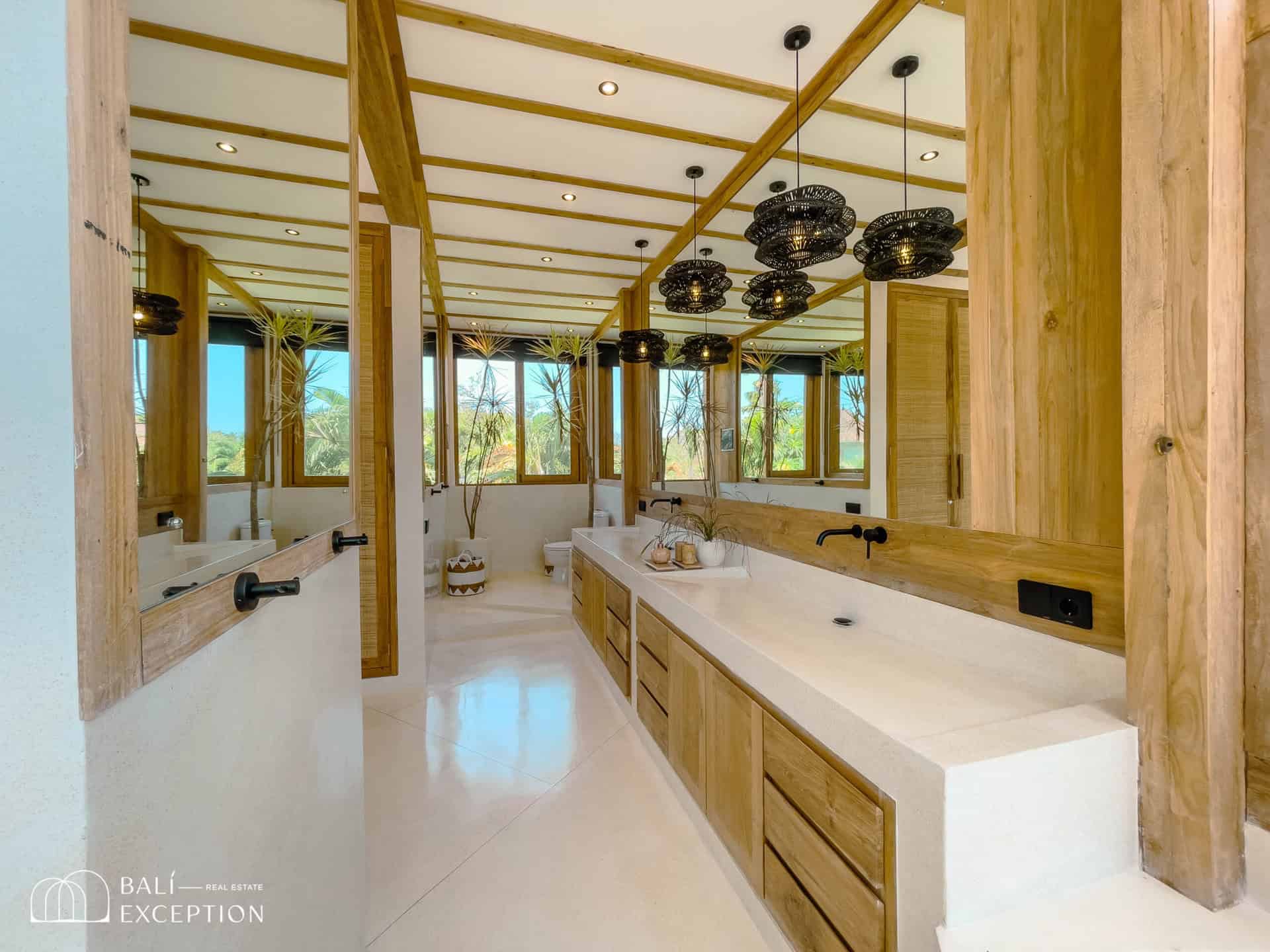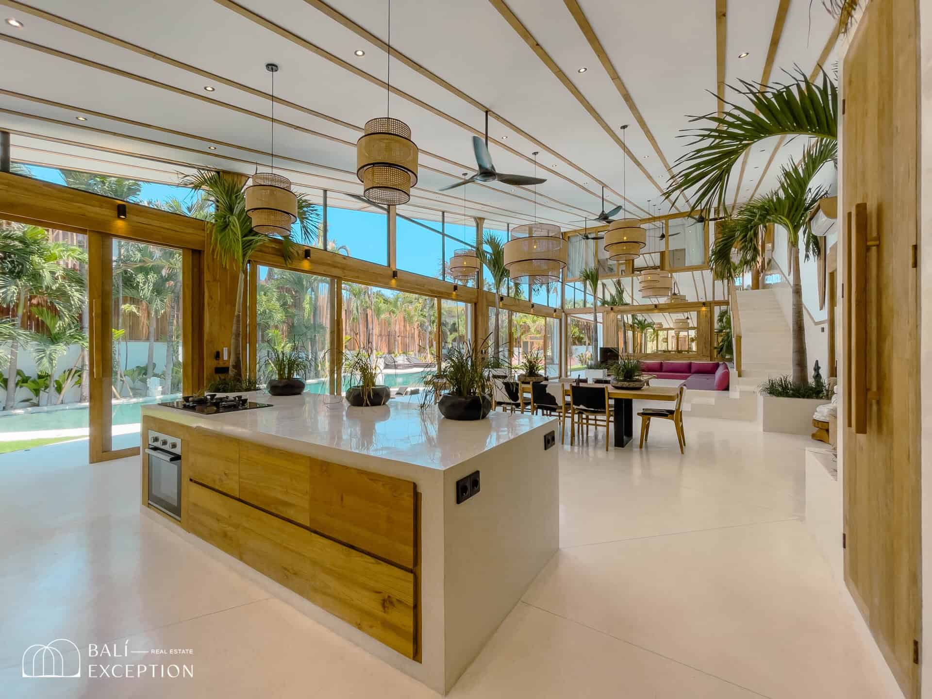 The large pool, with varying depths designed for swimming, relaxing, or playing, is a standout feature. Surrounded by an expansive garden, the outdoor area invites you to enjoy Bali’s sunny days in peace. The property is located in the center of Umalas, close to schools and activities. Everything is built around the villa, ensuring complete tranquility with no future noise disturbances.