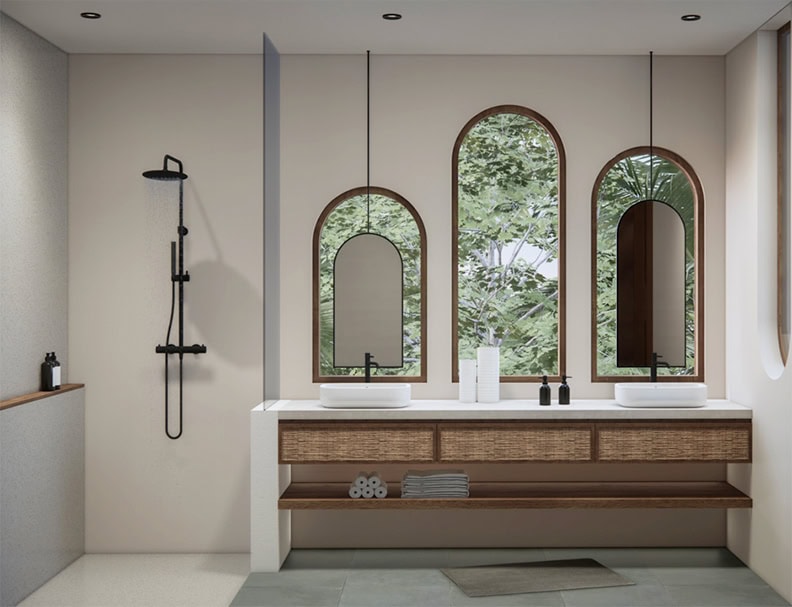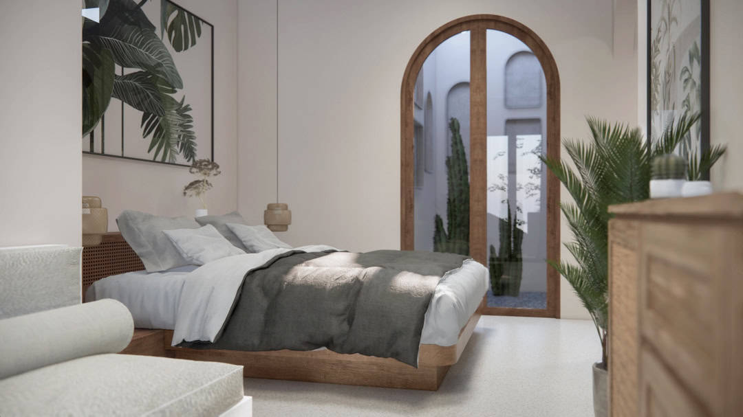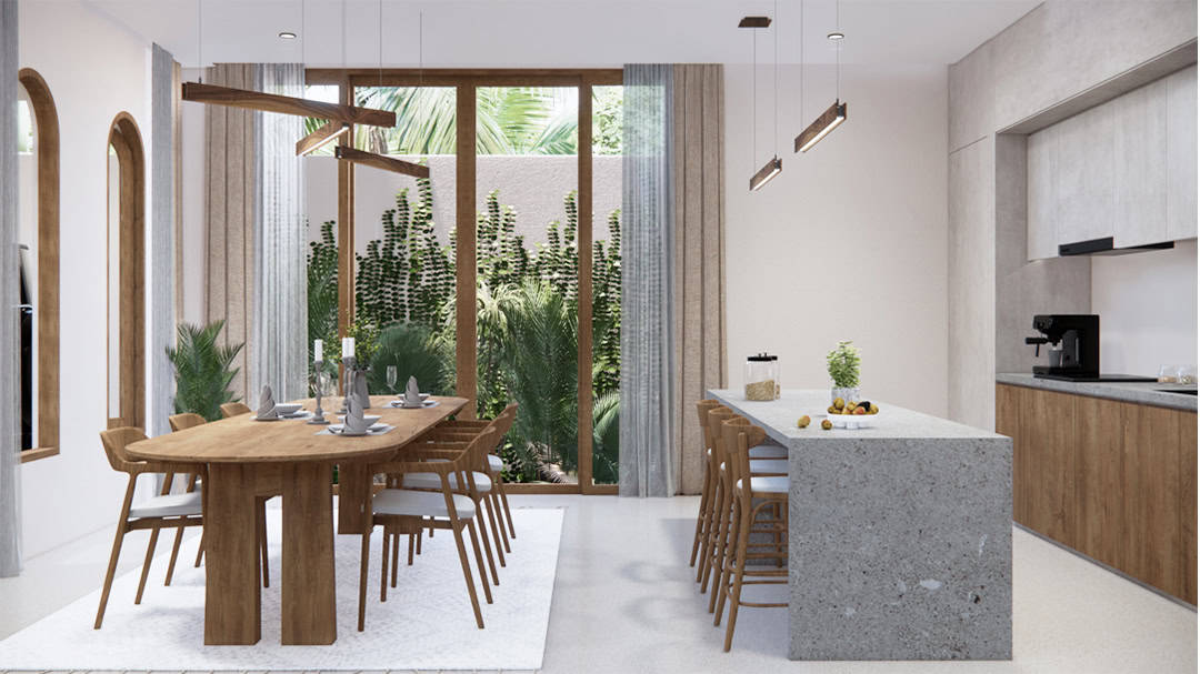 Step inside this fully furnished villa, which features 3 bedrooms and 3 bathrooms. The living space flows seamlessly into the adjacent dining area and fully equipped kitchen. The modern design of the white interior is complemented by high-quality wooden furniture, adding a touch of natural elegance. Floor-to-ceiling windows reinforce the airy atmosphere, providing a sense of openness and connection with the surrounding beauty.