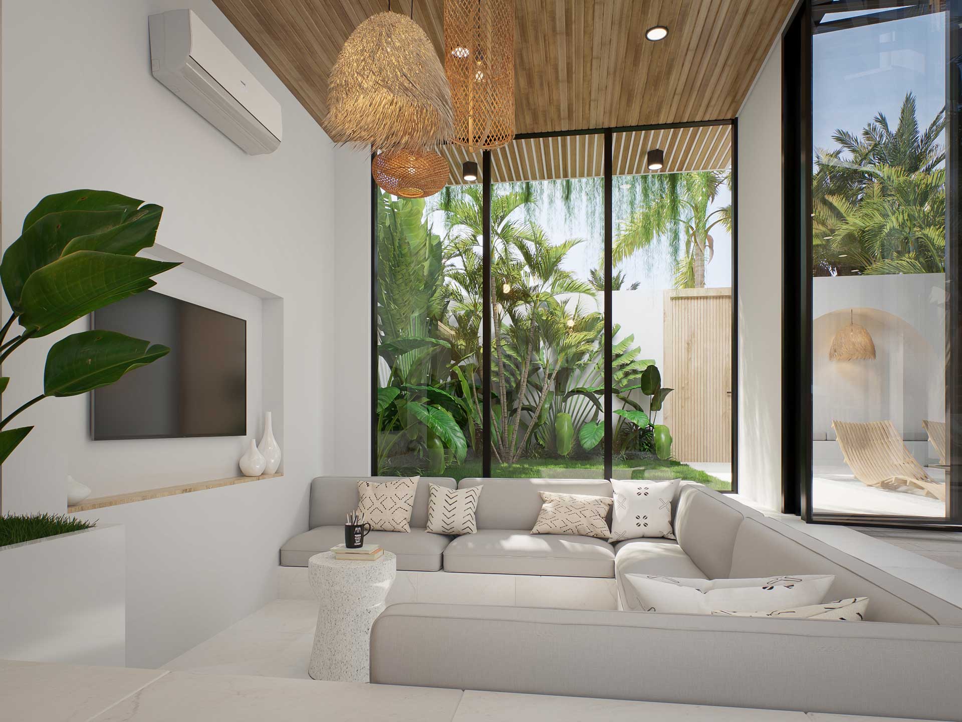 The villa’s sleek design embraces three bedrooms and two bathrooms, providing a spacious and private retreat for you and your guests. Fully furnished, it features a well-equipped kitchen and a sunken sofa, crafting a cozy and intimate space for relaxation. Abundant natural light floods the interior through large windows, effortlessly connecting the indoor and outdoor spaces.
