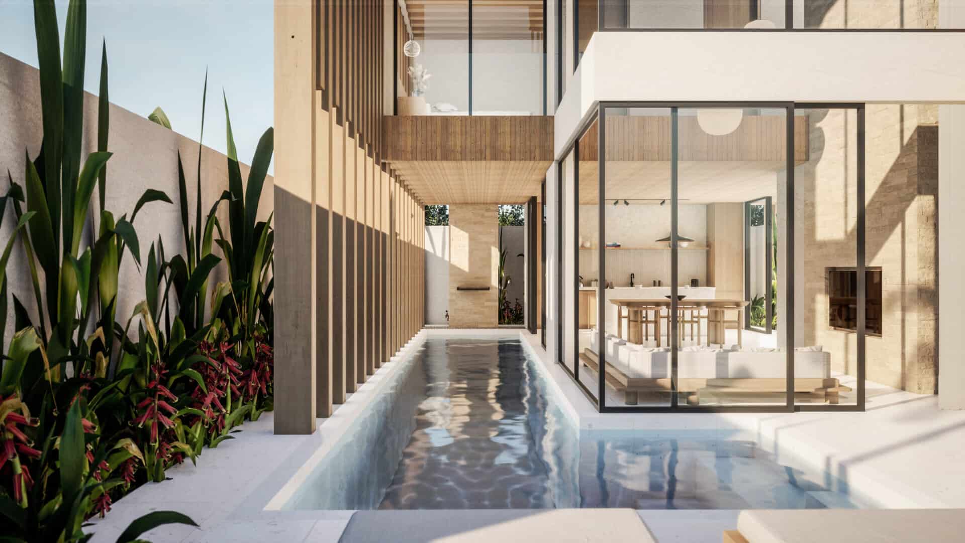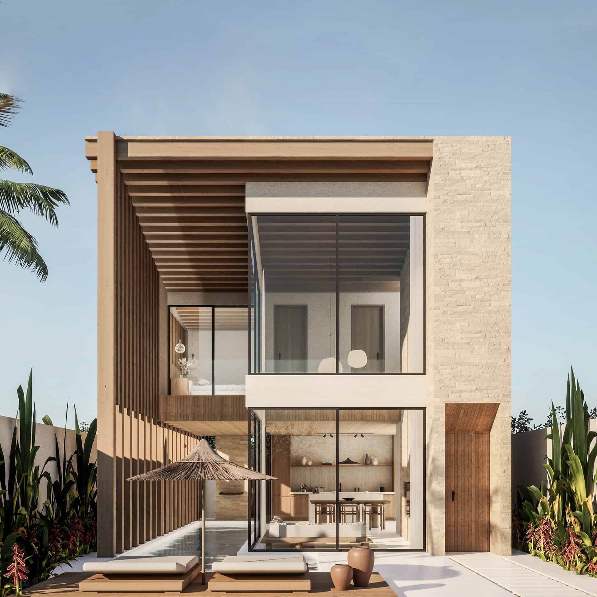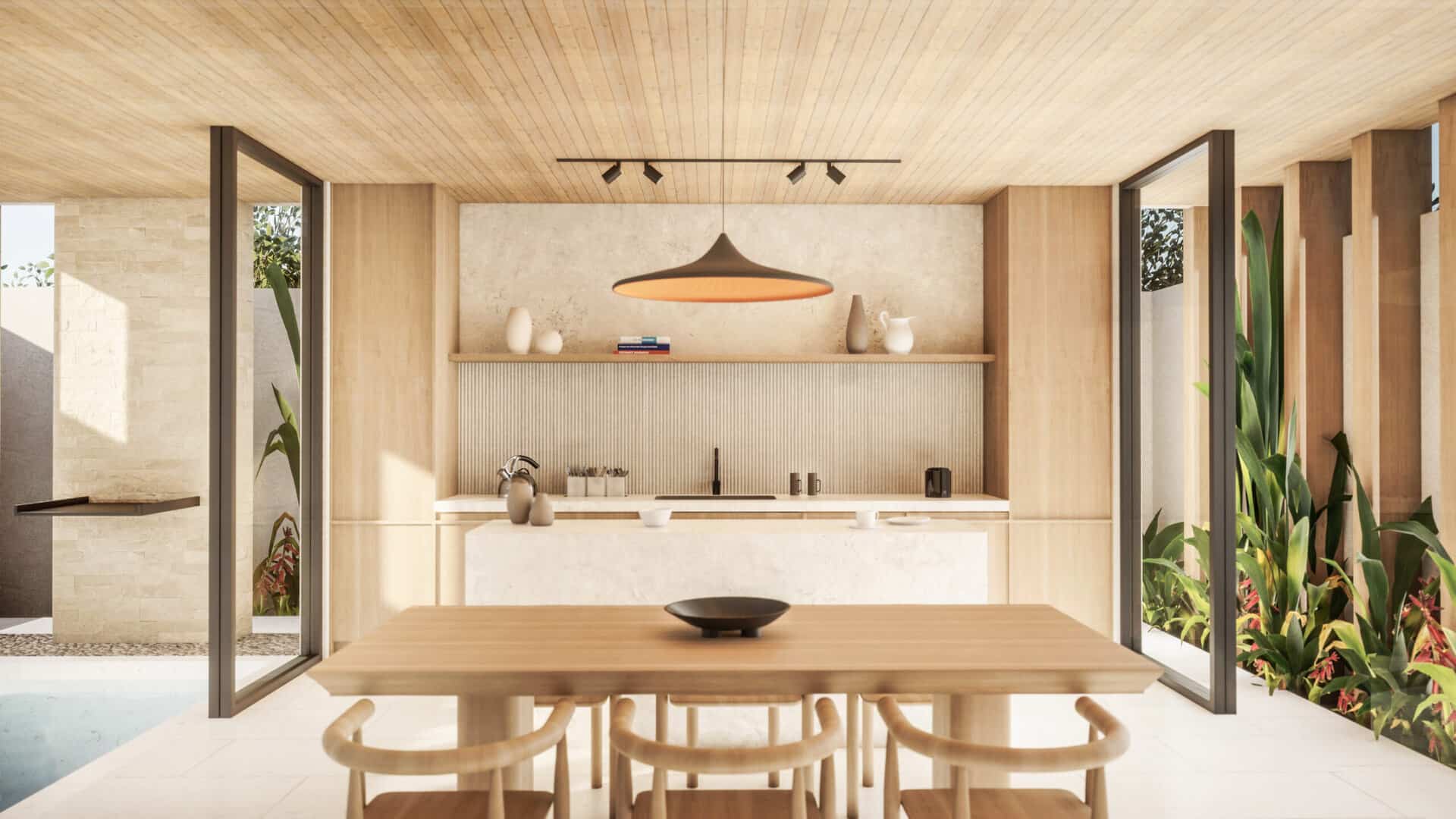 Designed with Japandi interiors, seamlessly blending nature and modern design, these villas combine Western living with Balinese elegance. Designed by a well-known architect and developer, the villas feature 2 bedrooms, 2.5 bathrooms, a living room, and an open-plan kitchen and dining area adorned with timber paneling and cladding, as well as grey quartz elements, invoking a mid-century modern allure that creates a sophisticated yet cozy space.