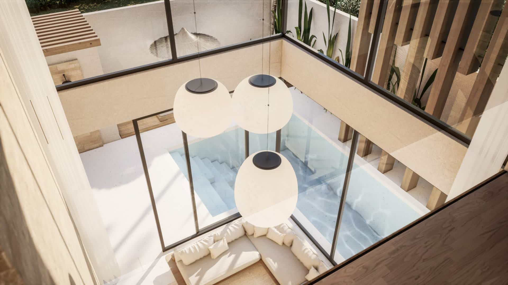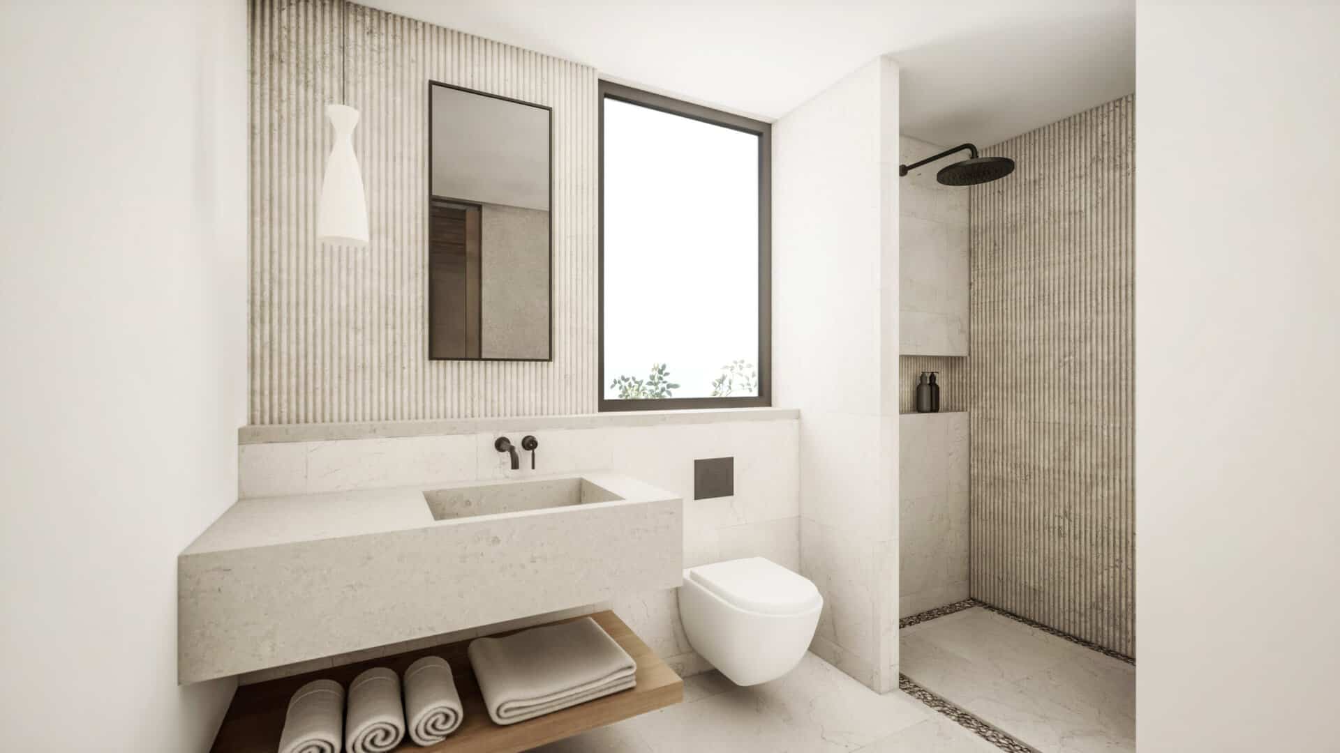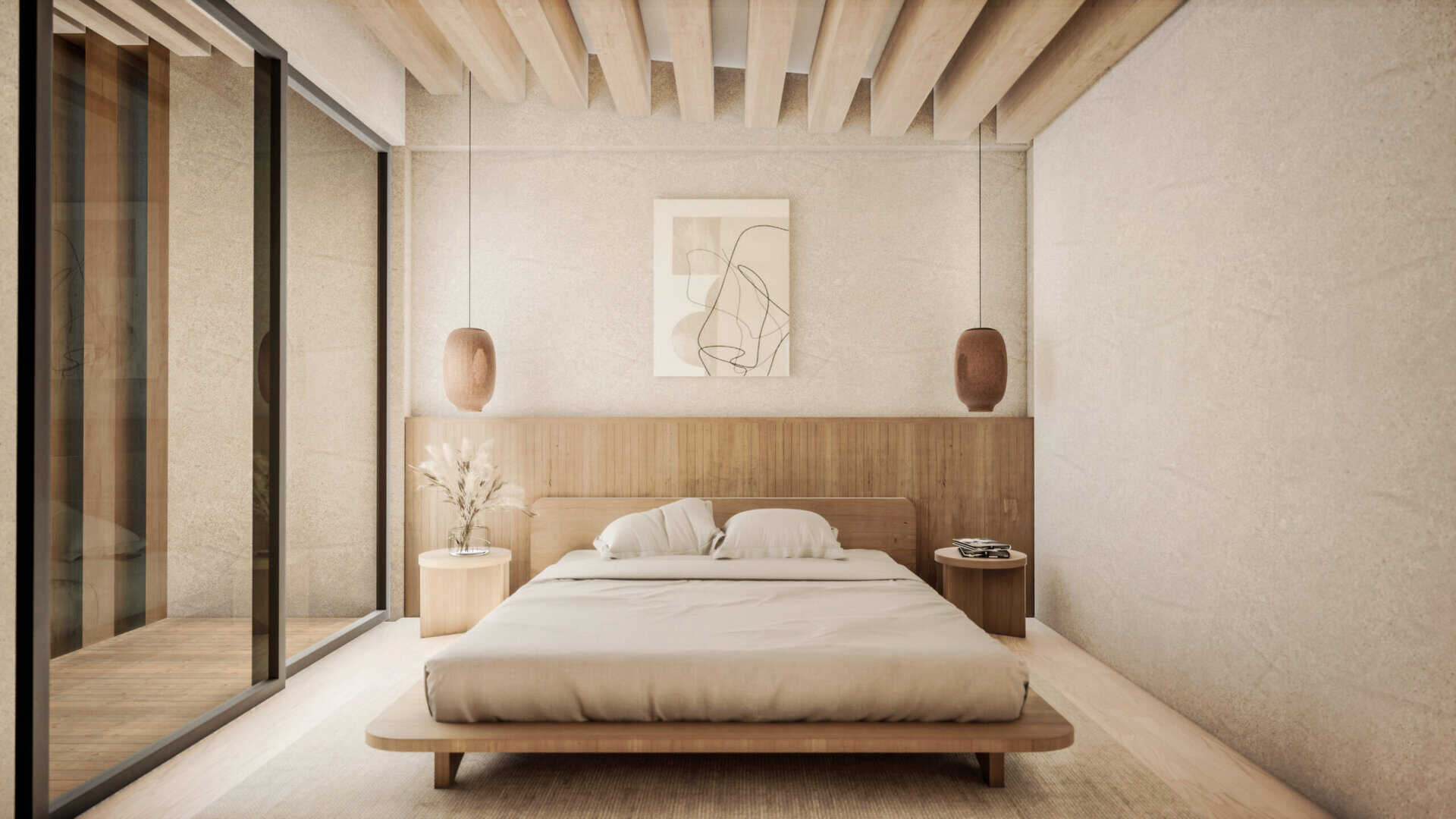 Designed with Japandi interiors, seamlessly blending nature and modern design, these villas combine Western living with Balinese elegance. Designed by a well-known architect and developer, the villas feature 2 bedrooms, 2.5 bathrooms, a living room, and an open-plan kitchen and dining area adorned with timber paneling and cladding, as well as grey quartz elements, invoking a mid-century modern allure that creates a sophisticated yet cozy space.